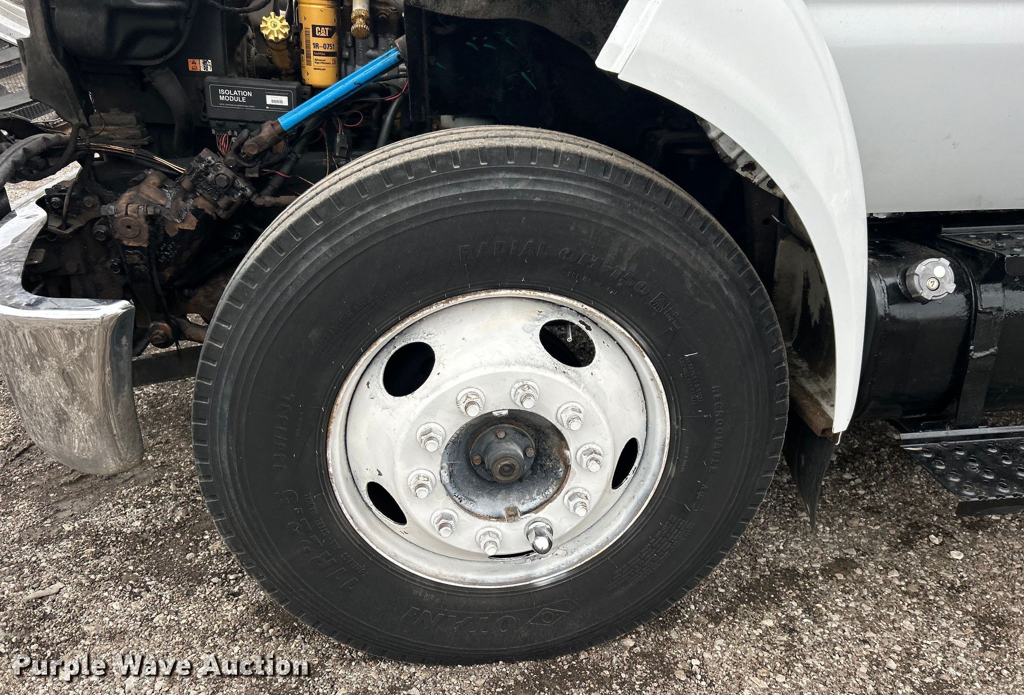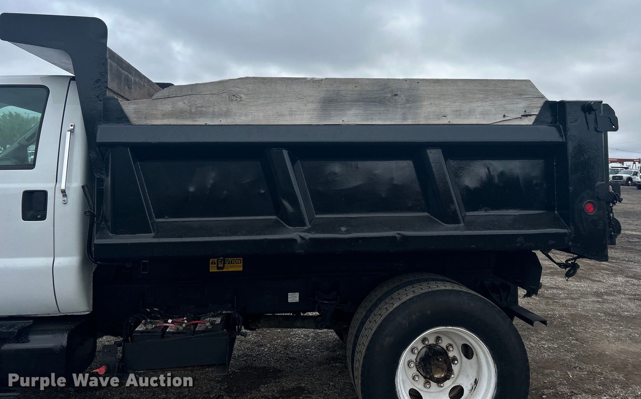2008 Ford F650 Super Duty dump truck. Miles: 59,139 on odometer, VIN: 3FRNF65W98V667448. Engine Caterpillar C7 Acert, Serial: C7S03865, Displacement: 7.2L, Cylinders: 6, Fuel type: Diesel. Transmission Automatic. Chassis Axles: Single, Suspension: Spring, Brakes: Hydraulic, PTO, GVWR: 26,000 lbs FAWR: 8,500 lbs, RAWR: 17,500 lbs, Wheelbase: 158". Interior AC, Heat, Cruise control, Brake controller. Features Dump bed 10' L x 96" W, Side height: 29", Side board height: 6", Bed type: Steel, Ram: Single, End gate: Manual. Tires Size: 11R22.5. Notes Dash warning indicator: ABS, Windshield chipped or cracked. Oklahoma title. Title distribution may be delayed up to 14 days from verification of funds. 15107 North 137th East Avenue. Collinsville, OK 74021