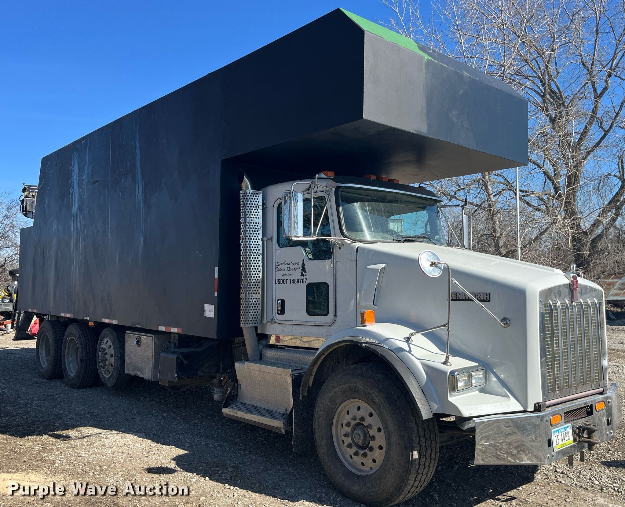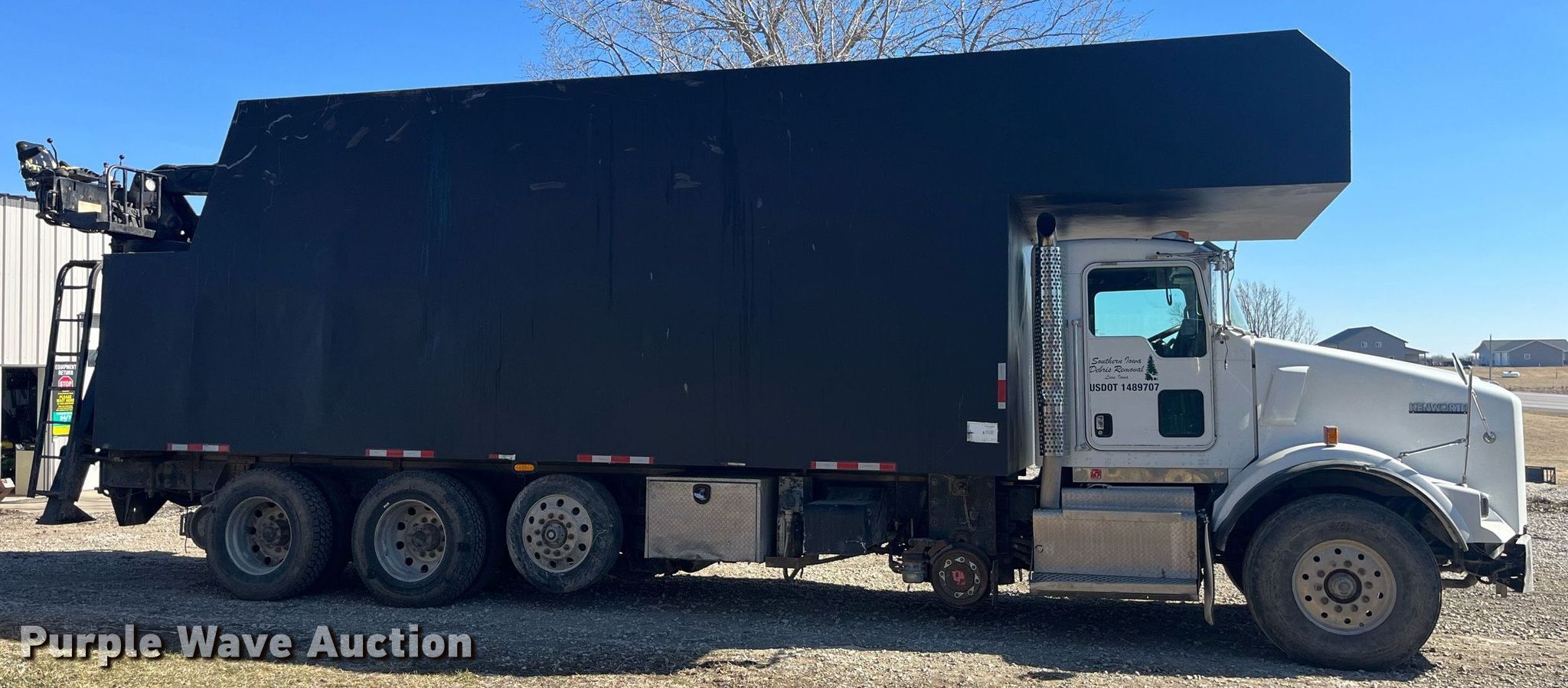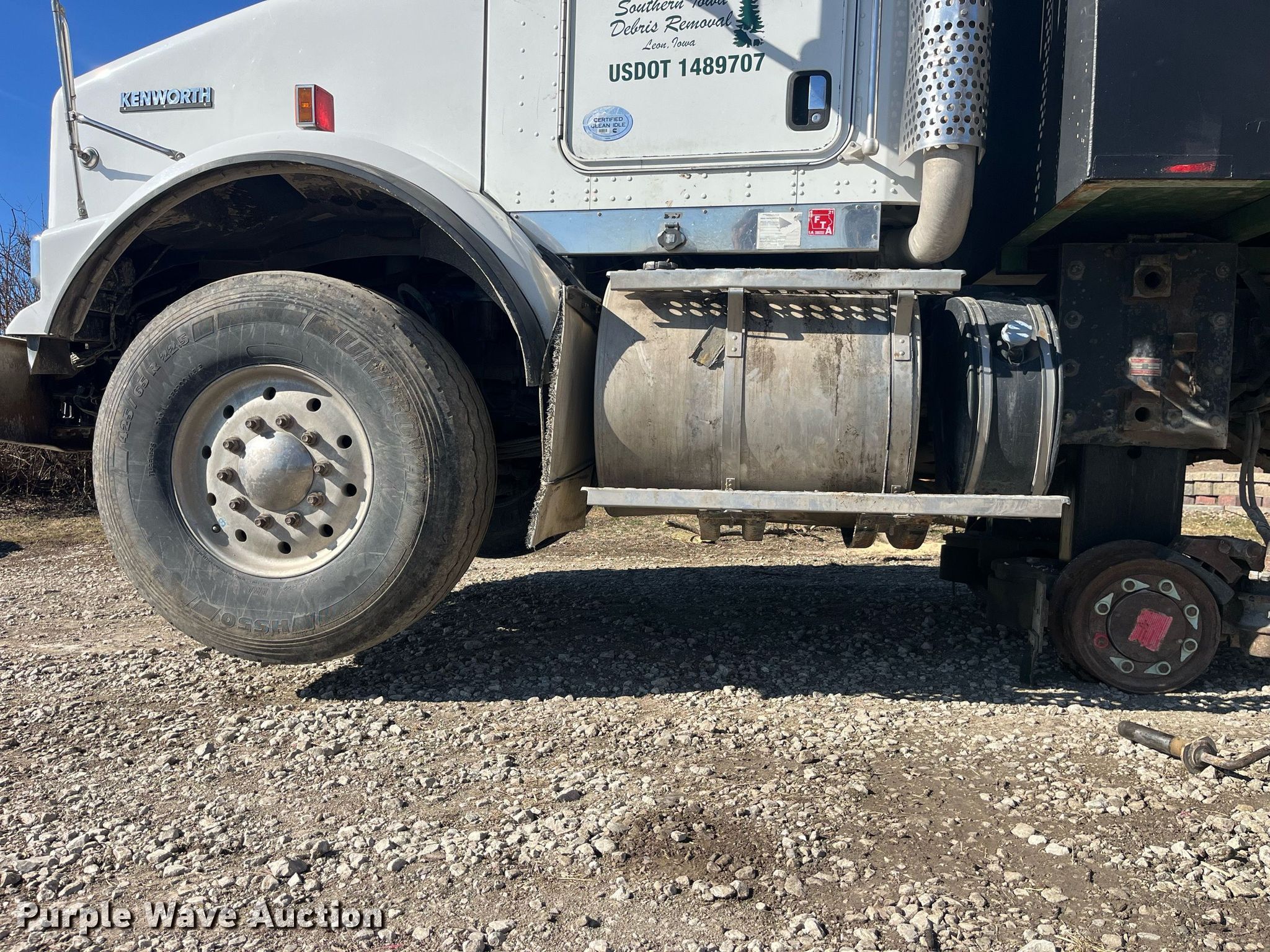 2013 Kenworth T800 grapple crane truck. Miles: 121,091 on odometer, Hours: 15,248 on meter, Miles or hours may vary, unit still in use, VIN: 1NKDX4EX4DJ354337. Engine Cummins ISX15 450, Displacement: 15, Cylinders: 6, Fuel type: Diesel, Engine brake. Transmission Manual. Chassis Axles: Triple, Tag axle, Suspension: Spring over walking beam, Brakes: Air, PTO, GVWR: 77,020 lbs FAWR: 20,000 lbs, IAWR: 23,000 lbs, RAWR: 23,000 lbs, Lift axle GAWR: 11,020 lbs. Interior AC, Heat, Heated mirrors, Power locks, Cruise control, Brake controller. Features Bed Capacity: 75 cu. yd., Dimensions: 25'3"L x 8'6"W x 9'8"H, Serco 8500 material handler Serial: L8360, Boom length: 25' 8", Lift capacity: 8,500 lbs, Telescopic, Hi-rail system. Tires Front: 425/65R22.5, Rear: 11R24.5, Lift axle: 255/70R22.5. Notes DEF deleted, Dash warning indicator: Check engine, Windshield chipped or cracked. Iowa title. Title distribution may be delayed up to 30 days from verification of funds. Southern Iowa Debris Removal. 30086 State Highway 2. Leon, IA 50144