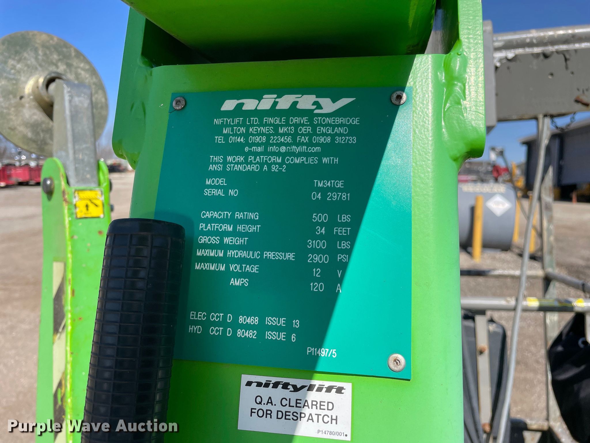 2014 Nifty Lift TM34TGE boom lift. VIN: SLN34TGE7EM029781, Serial: 0429781, Unit #: 2. Engine Honda GX160, Cylinders: 1, Fuel type: Gas. Electric Motor Volts: 12. Features Articulating boom, Tow behind, Maximum lift capacity: 500 lbs, Maximum lift height: 34', Hydraulic outriggers, Platform: 24" L x 36" W, Controls: Platform, Ground, Safety alarm. Tires Tire size: 165R14. Notes Dead battery, Non-operational electric function, Certification valid through: 03/2024. Transfer of ownership documentation will be a bill of sale. 5407 East Terra Cotta Avenue. Crystal Lake, IL 60014