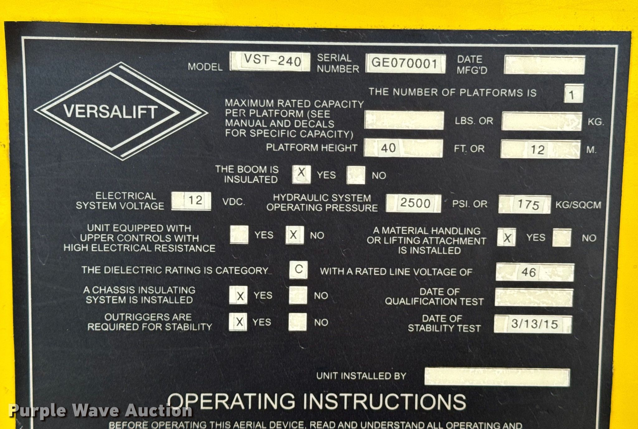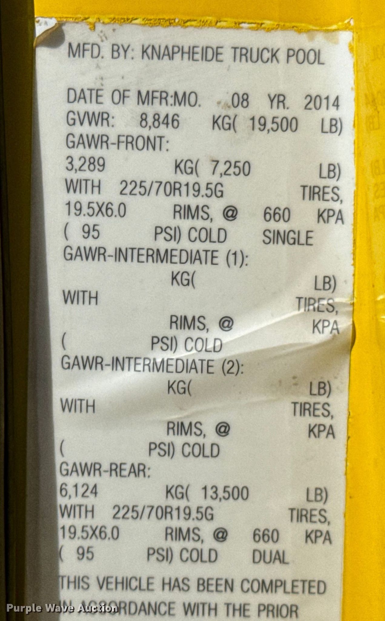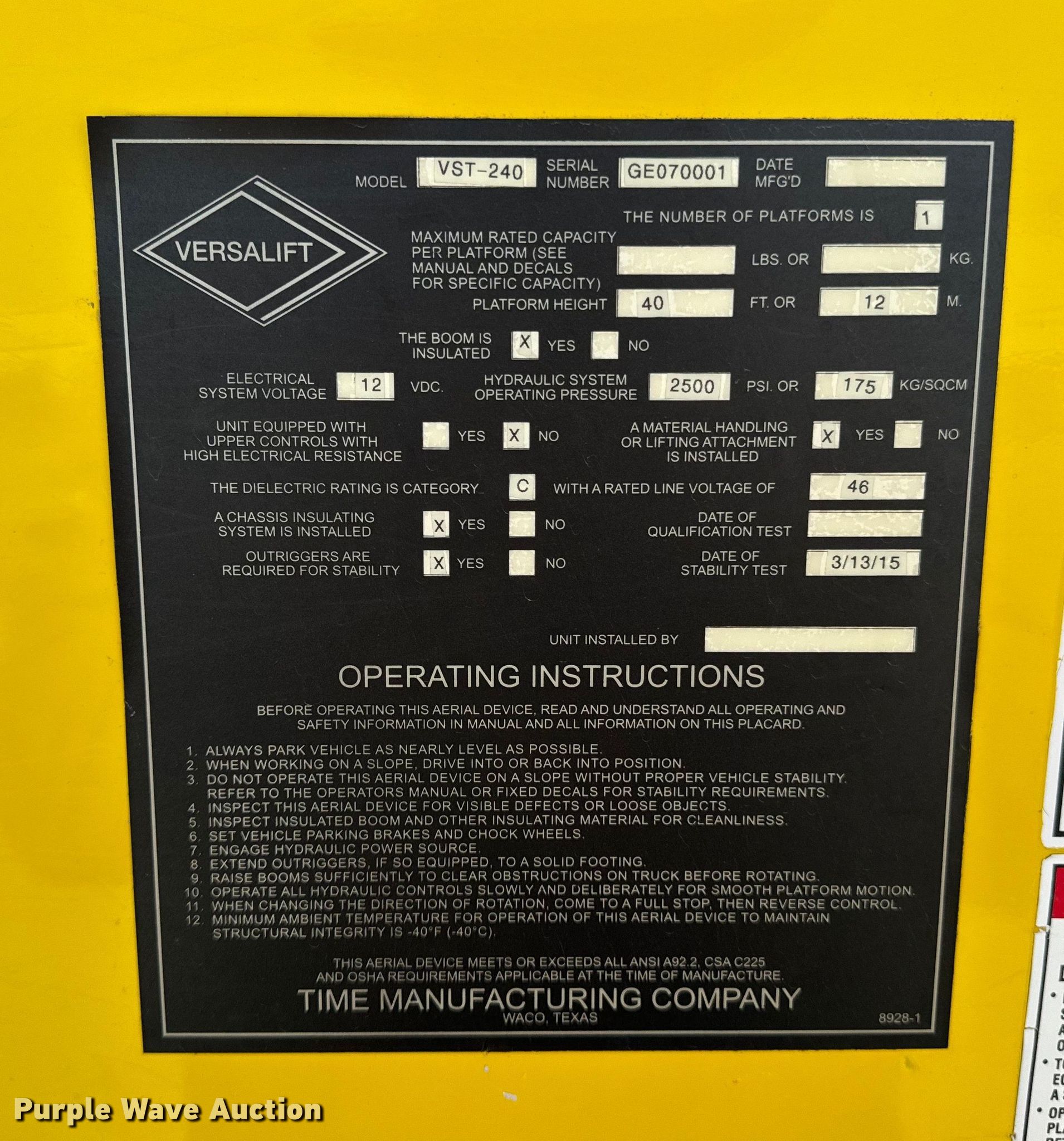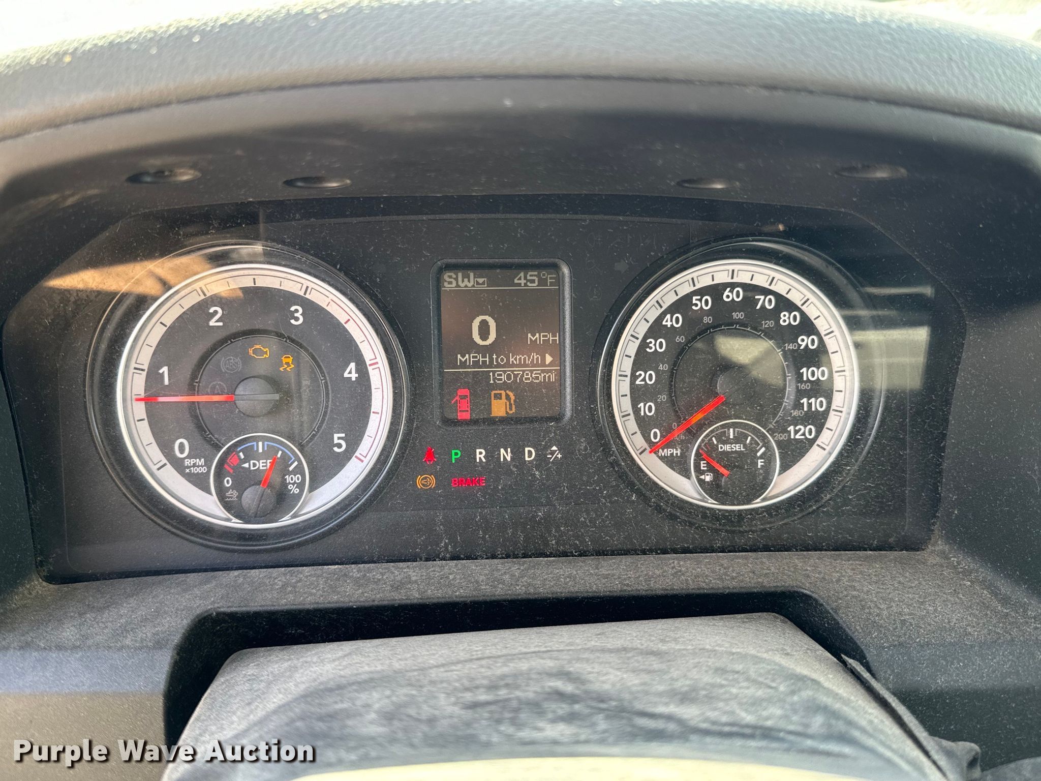 2014 Dodge Ram 5500 bucket truck. Miles: 190,785 on odometer, VIN: 3C7WRNBL5EG286387. Engine Cummins, Displacement: 6.7L, Cylinders: 6, Fuel type: Diesel. Transmission Automatic. Chassis Four wheel drive, Axles: Single, Suspension: Spring, Brakes: Hydraulic, PTO, GVWR: 19,500 lbs. Interior AC, heat, Heated mirrors, Power windows, power locks, Cruise control, Auxiliary controls. Features Bed Versalift VST-240, 13' L x 7' 10" W, Boom Maximum lift capacity: 300 lbs, Maximum lift height: 40', Boom type: Articulating, insulated, telescopic, Man basket, Boom controls Ground, Platform/ basket.. Tires Size: 225/70R19.5. Notes Dash warning indicator: Check engine, Brake, Traction control. Missouri title. Title distribution may be delayed up to 14 days from verification of funds. New-Mac Electric Co-op, Inc.. 12105 State Hwy 86. Neosho, MO 64850