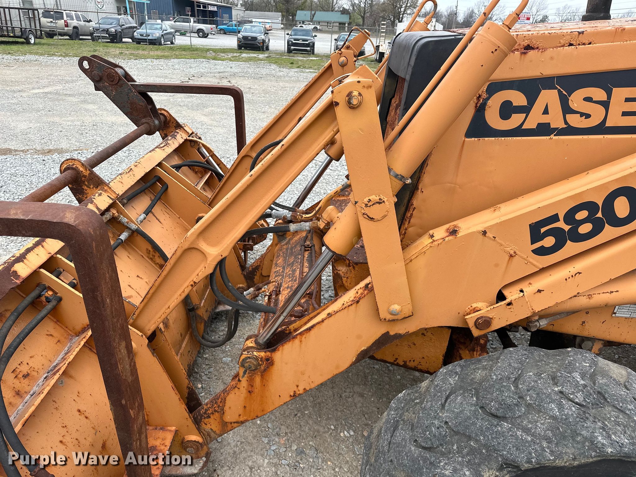 Case 580SK backhoe. Hours: 1,885 on meter, Serial: JJH0047293. Engine Cummins 4T-390/59, Serial: 21158453, Cylinders: 4, Fuel type: Diesel. Transmission Shuttle shift, 4F - 4R. Chassis Four wheel drive. Operators station Enclosed cab, Backhoe controls: Wobble stick / two stick. Features Loader Auxiliary hydraulics, Bucket Four-in-one, Width: 92", Cutting edge: Bolt-on, Forks Length: 42", Backhoe Extendable stick, Bucket Width: 22", Teeth: 5.. Tires Front: 14-17.5, Rear: 16.9-28. Notes Rust damage, Key wiring issues. Equipment Unlimited. Grove, OK 74344