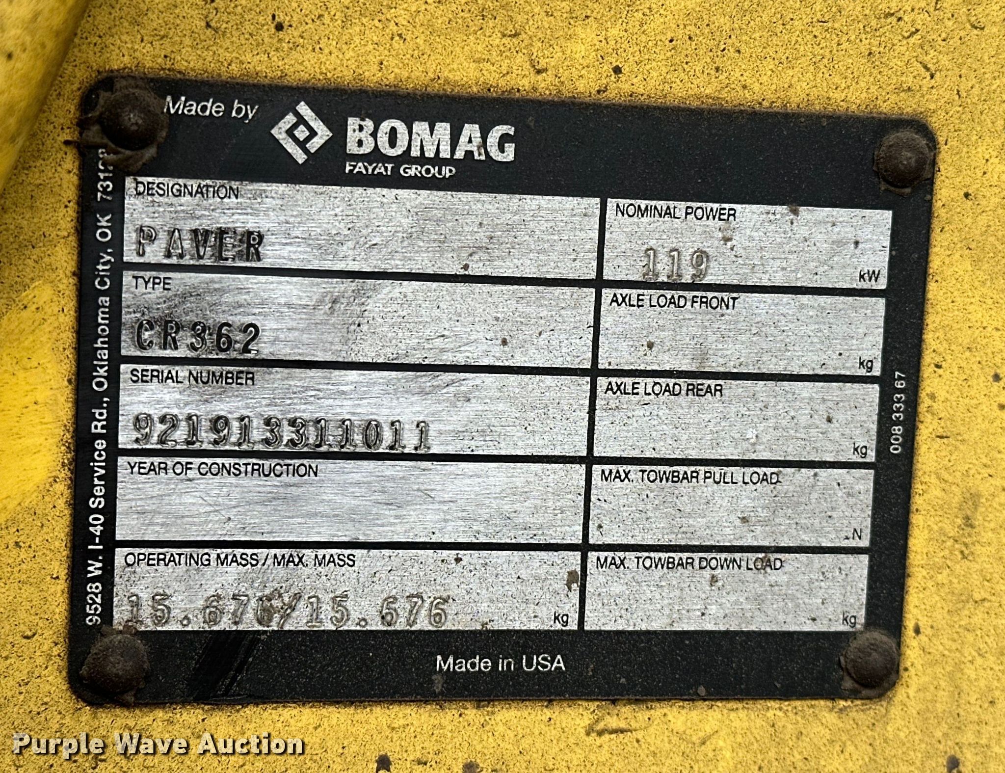 Purple Wave is selling a used Paver or Screed in Oklahoma. This item is a 2014 Bomag CR362 paver with the following: Hours: 3,558 on meter, Serial: 921913311011