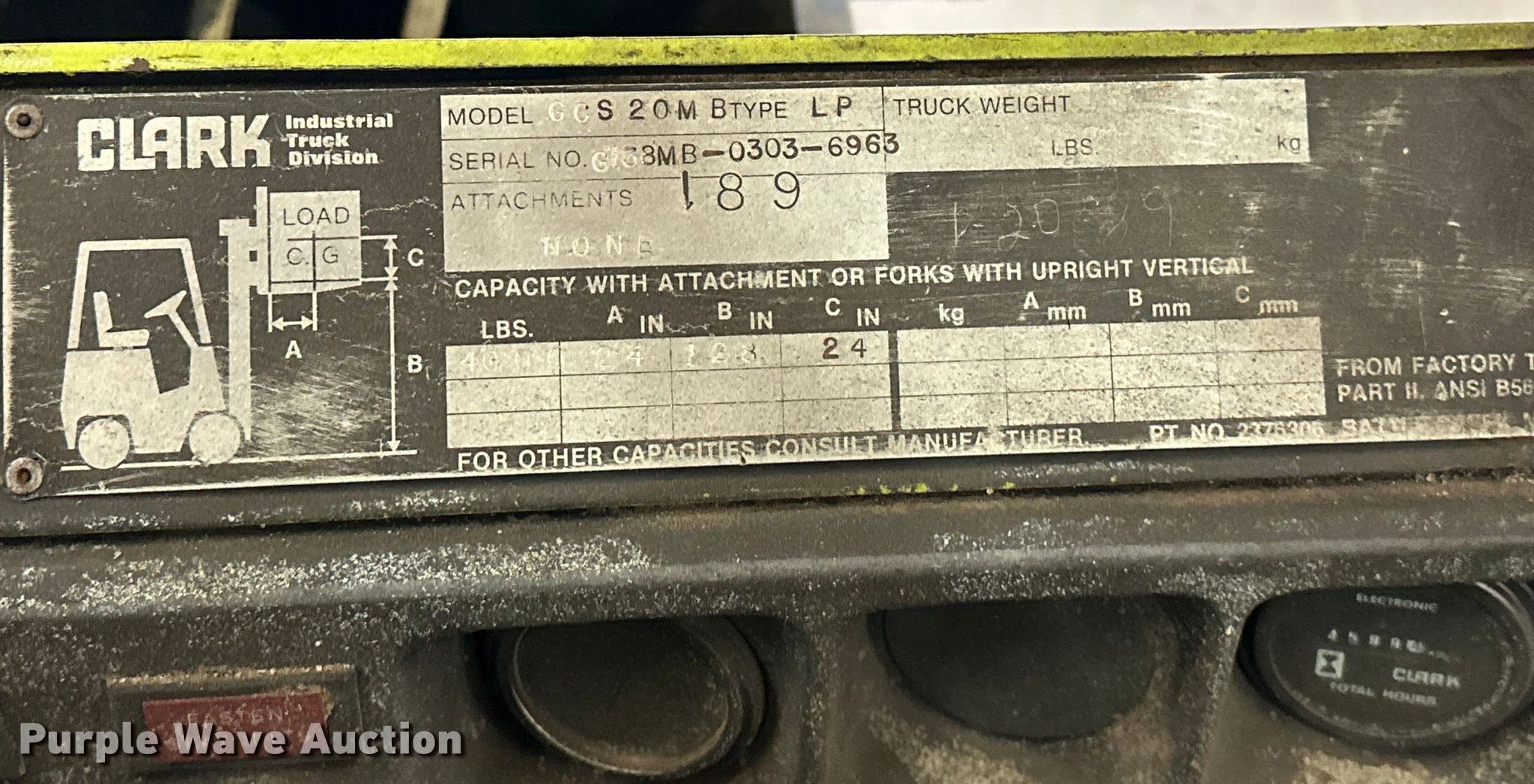 Purple Wave is selling a used Warehouse Forklift in Oklahoma. This item is a Clark GCS20MB forklift with the following: Hours: 4,589 on meter, Serial: G138MB-0303-6963