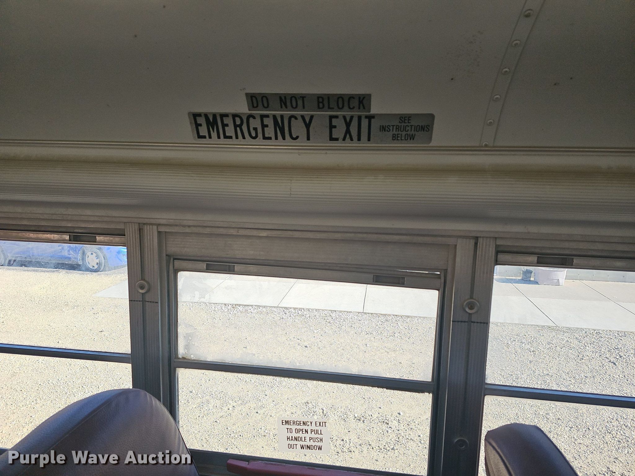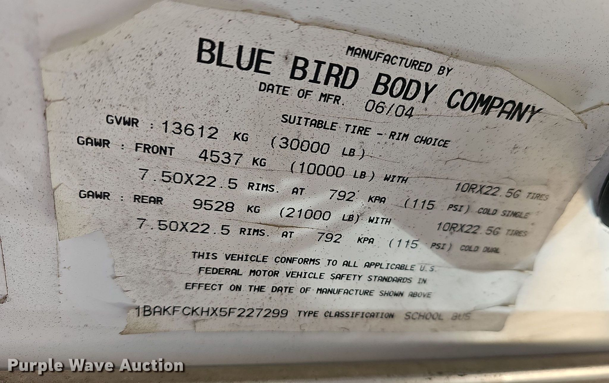 2005 Bluebird Vision school bus. Miles: 221,181 on odometer, VIN: 1BAKFCKHX5F227299, Unit #: 05-1. Engine Caterpillar C7 Acert, Serial: KAL51204, Displacement: 7.2L, Cylinders: 6, Fuel type: Diesel. Transmission Automatic. Chassis Axles: Single, Suspension: Spring, Brakes: Hydraulic, GVWR: 30,000 lbs, Wheelbase: 252". Interior Heat, Heated mirrors, Cruise control, Passengers: 65. Tires Size: 10R22.5. Notes Dash warning indicator: ABS. Kansas title. Title distribution may be delayed up to 14 days from verification of funds. St. George, KS 66535