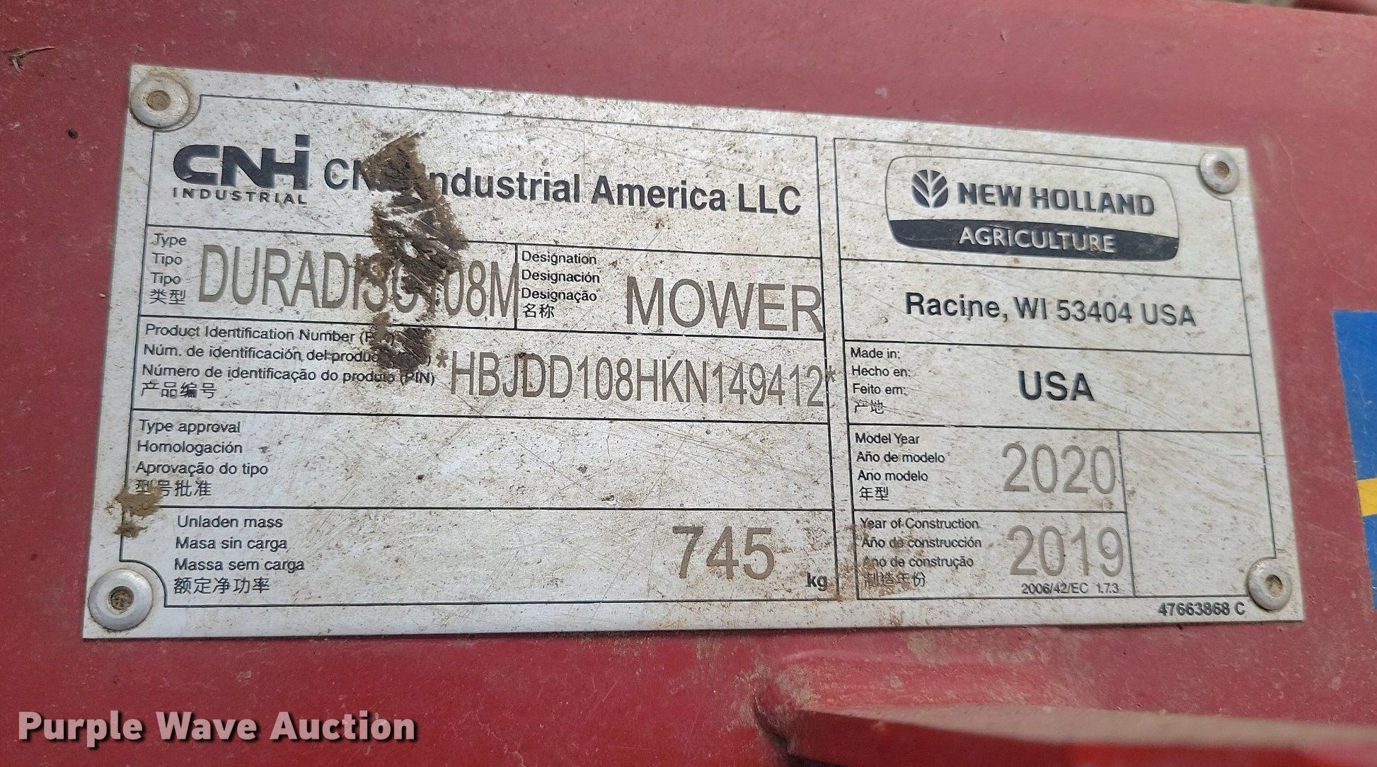 Purple Wave is selling a used Disc or Sickle Mower in Minnesota. This item is a 2020 New Holland Duradisc 108M disc mower with the following: Serial: HBJDD108HKN149412