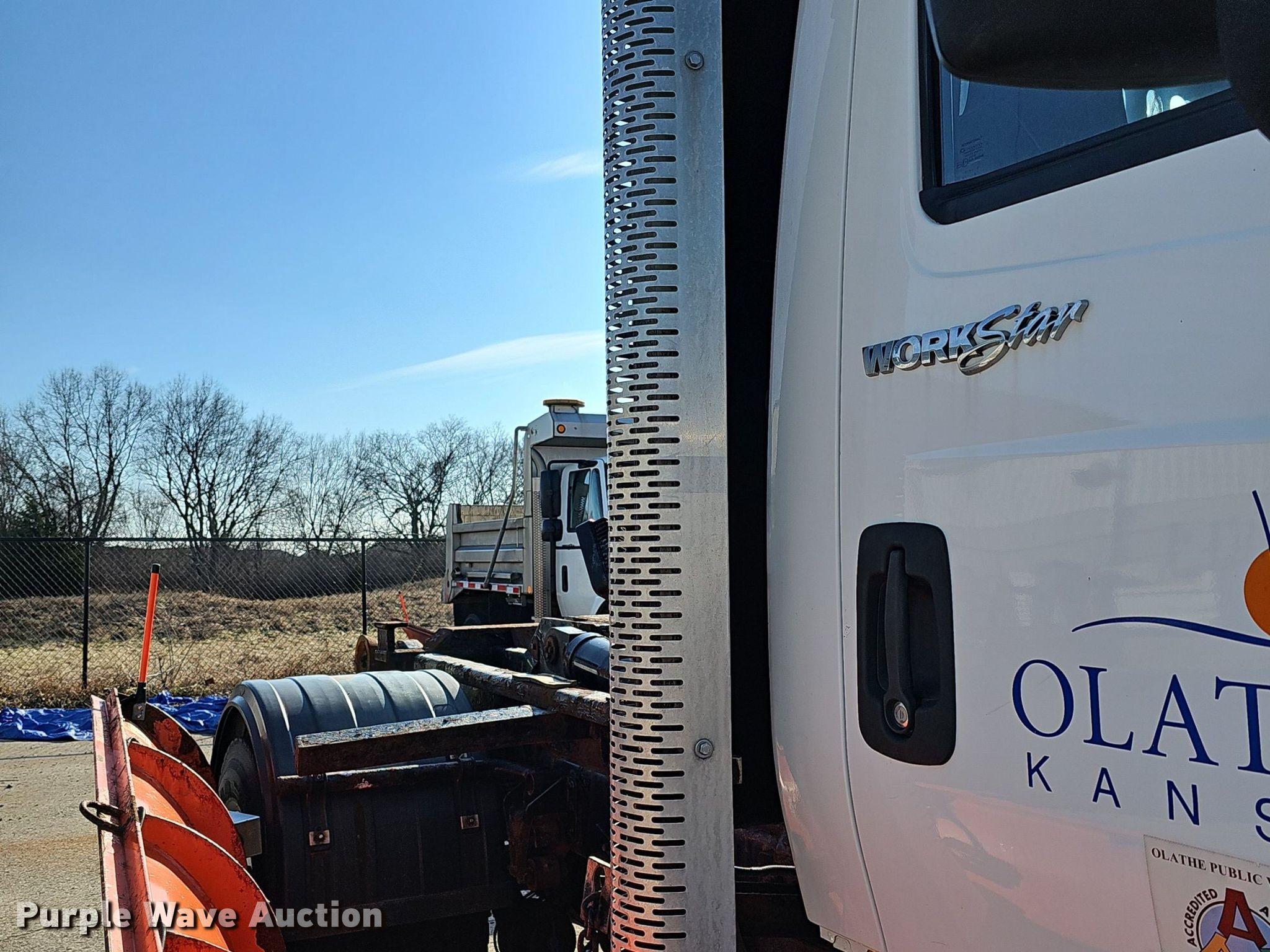 2012 International WorkStar 7400 hook lift truck. Miles: 55,558 on odometer, Hours: 10,288 on meter, VIN: 1HTWDAAR5CJ054476, Unit #: 6650. Engine Displacement: 7.6L, Cylinders: 6, Fuel type: Diesel. Transmission Allison, Automatic. Chassis Axles: Single, Suspension: Spring, Brakes: Air, GVWR: 36,220 lbs, Wheelbase: 171". Interior Heat, Cruise control. Features Hook lift bed Swaploader SL2418HD, 10' 6" L x 41.5" W, Ram: Double, Viking snow plow Width: 10', 9ft wing snow plow Non-operational. Tires Size: 11R22.5. Notes Unit will not stay running, Rear hook hydraulic cylinder leaks, Dash warning indicator: Check engine, Dead battery. Kansas title. Title distribution may be delayed up to 14 days from verification of funds. City of Olathe. Olathe, KS 66061
