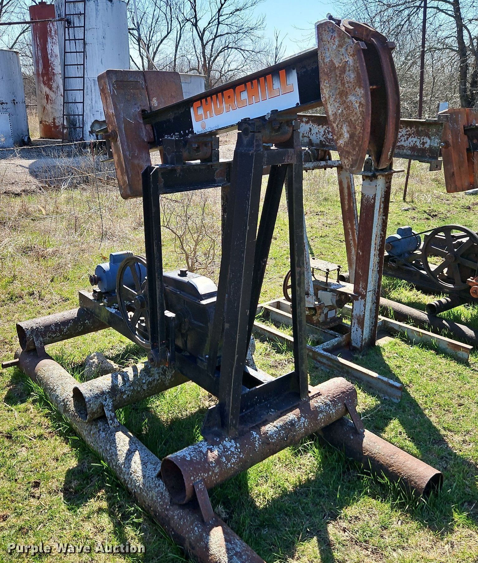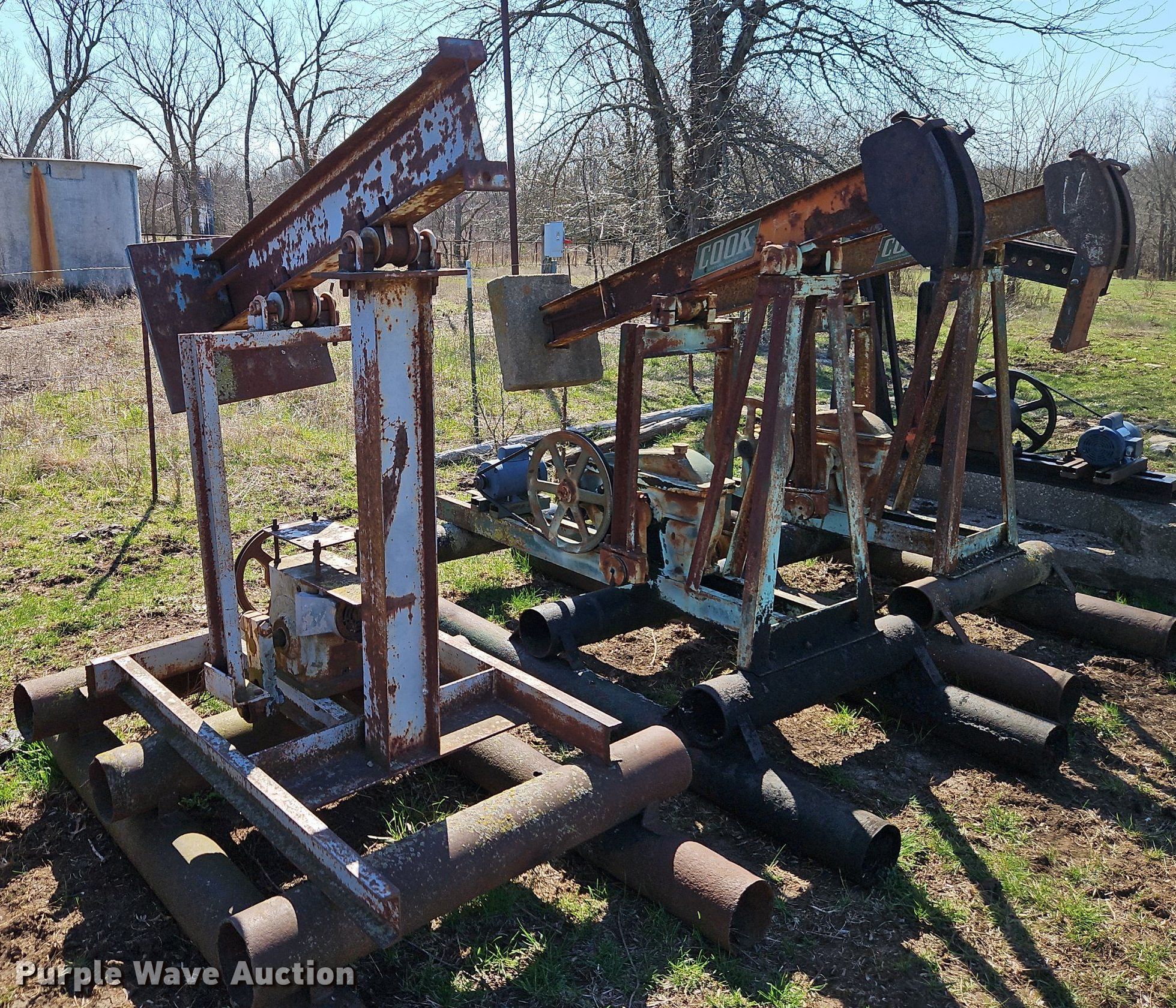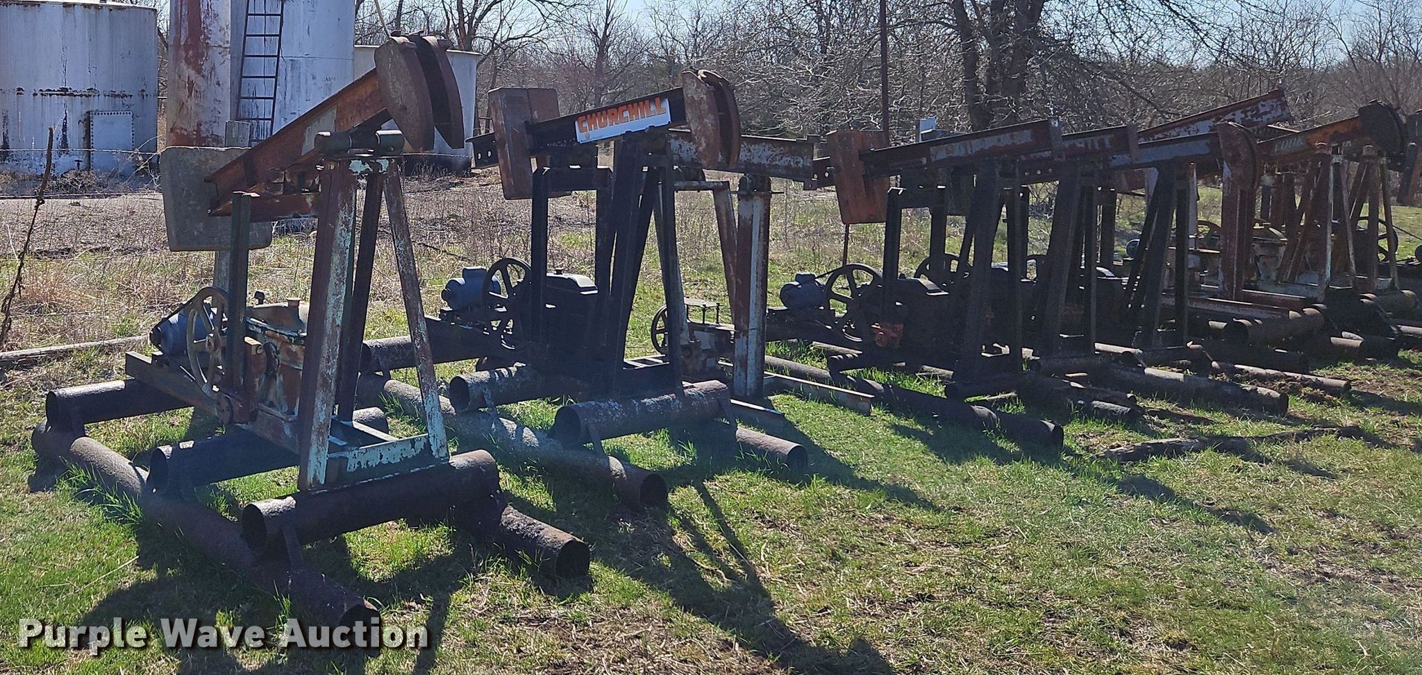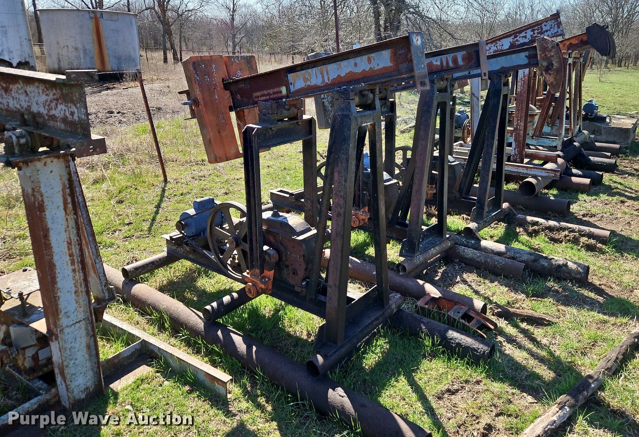 Purple Wave is selling a used Oilfield Equip. in Kansas. This item is a Oilfield equipment with the following: (10) pump jacks, (5) Churchill, (4) have motors, (3) Cook, (2) have motors,, (6) railroad ties, (2) disconnects, Approx. 60 joints of pipe, Approx. 25' L x 1" diameter, Approx. 44 joints of 1" pipe, Plumbing, Pipe, Poly, PVC, (7) pipe panels, Approx. 12 wire fence panels, 12' x 10' tank, Capacity: 200 BBL, (3) approx. 100 BBL tanks, (2) approx. 60 BB gun barrel tanks, Fiberglass tank, Capacity: Approx. 100 BBL, Unit #: 2023FP3-01 - Peacock