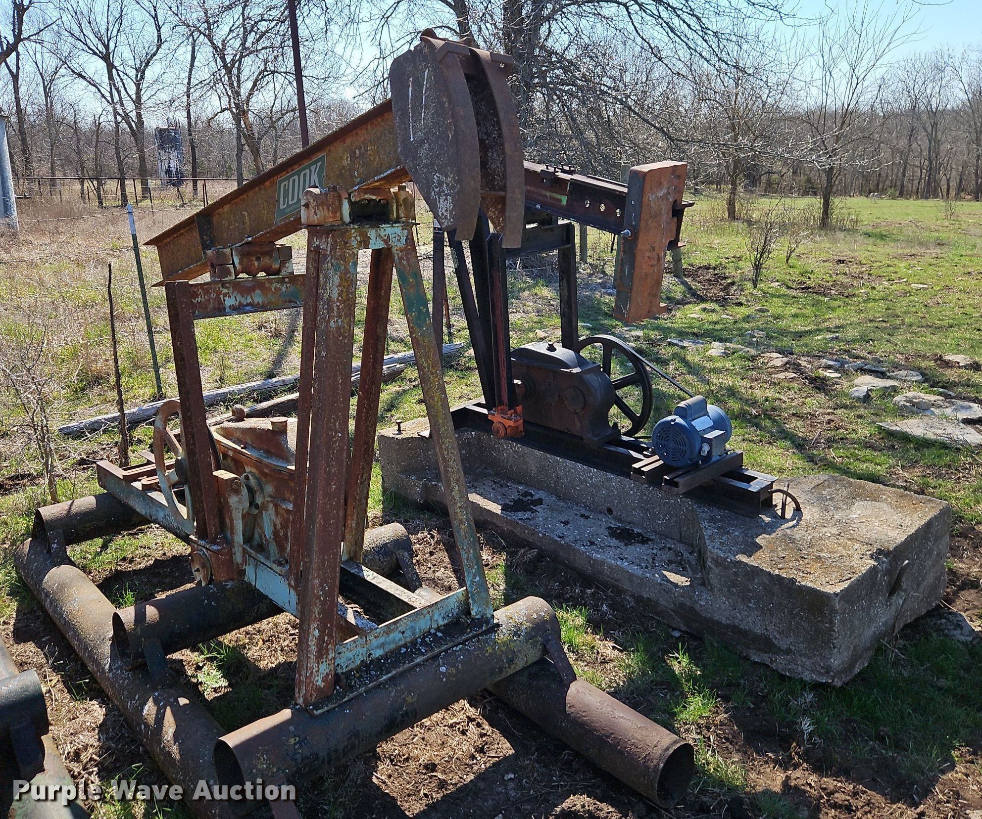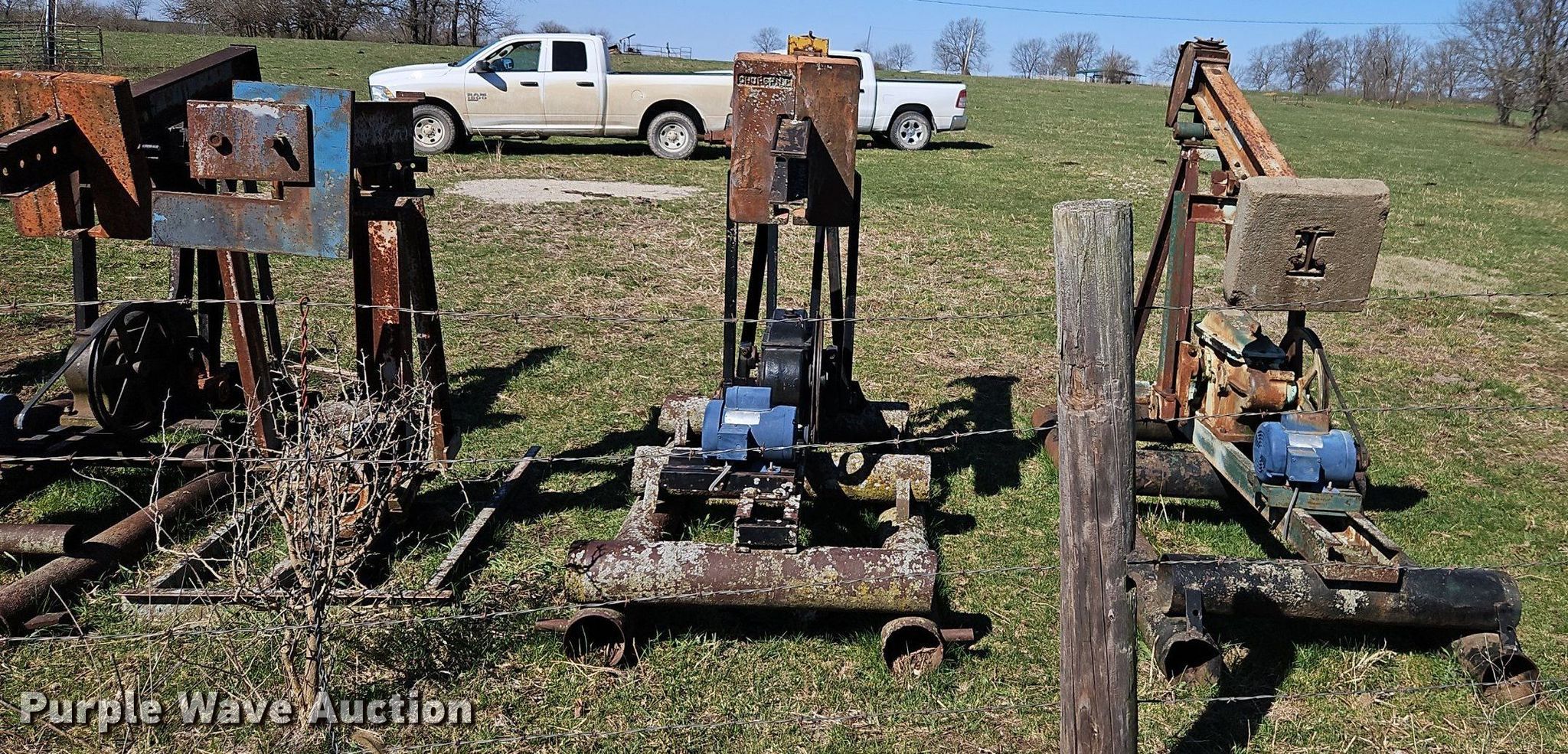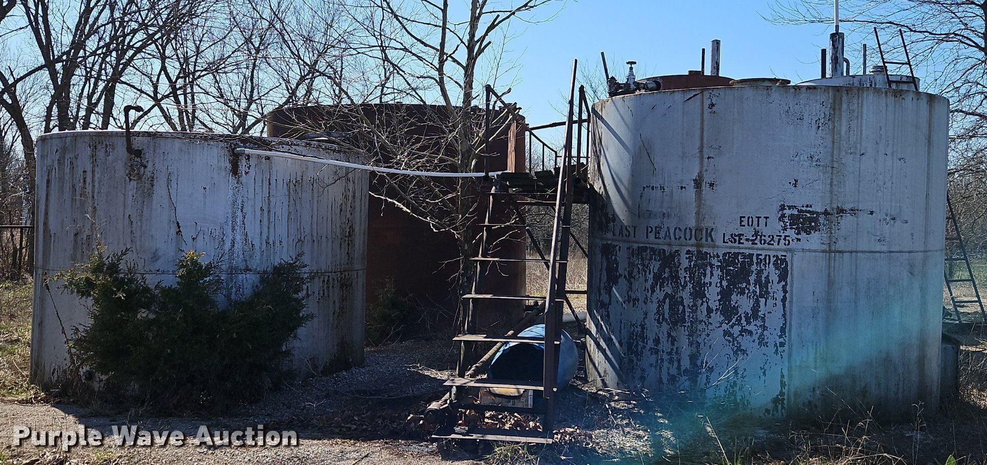 Purple Wave is selling a used Oilfield Equip. in Kansas. This item is a Oilfield equipment with the following: (10) pump jacks, (5) Churchill, (4) have motors, (3) Cook, (2) have motors,, (6) railroad ties, (2) disconnects, Approx. 60 joints of pipe, Approx. 25' L x 1" diameter, Approx. 44 joints of 1" pipe, Plumbing, Pipe, Poly, PVC, (7) pipe panels, Approx. 12 wire fence panels, 12' x 10' tank, Capacity: 200 BBL, (3) approx. 100 BBL tanks, (2) approx. 60 BB gun barrel tanks, Fiberglass tank, Capacity: Approx. 100 BBL, Unit #: 2023FP3-01 - Peacock