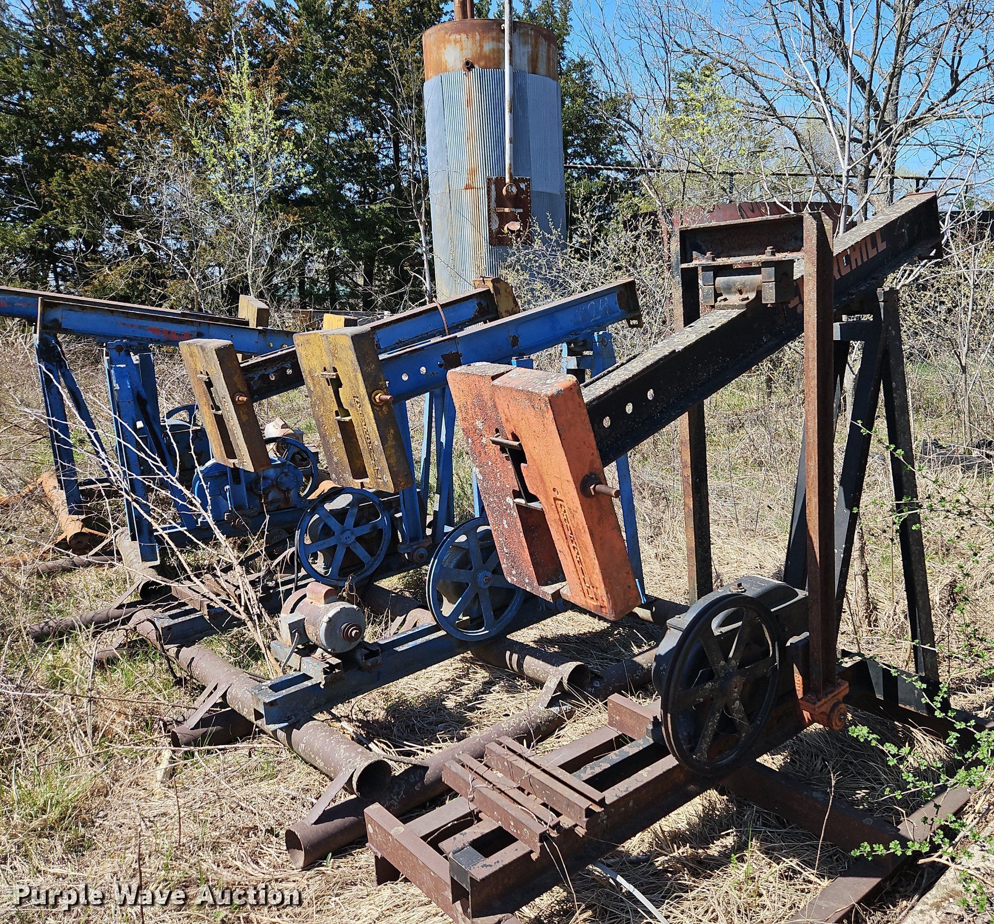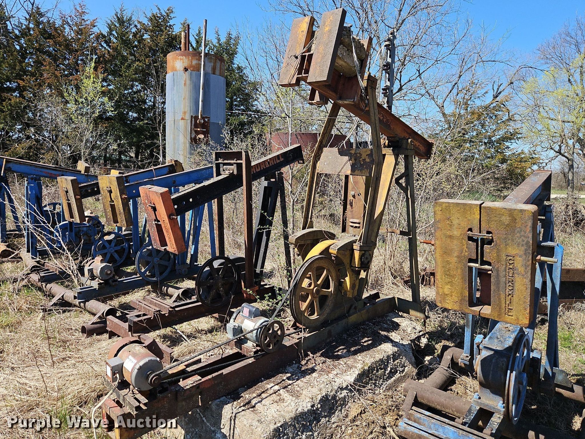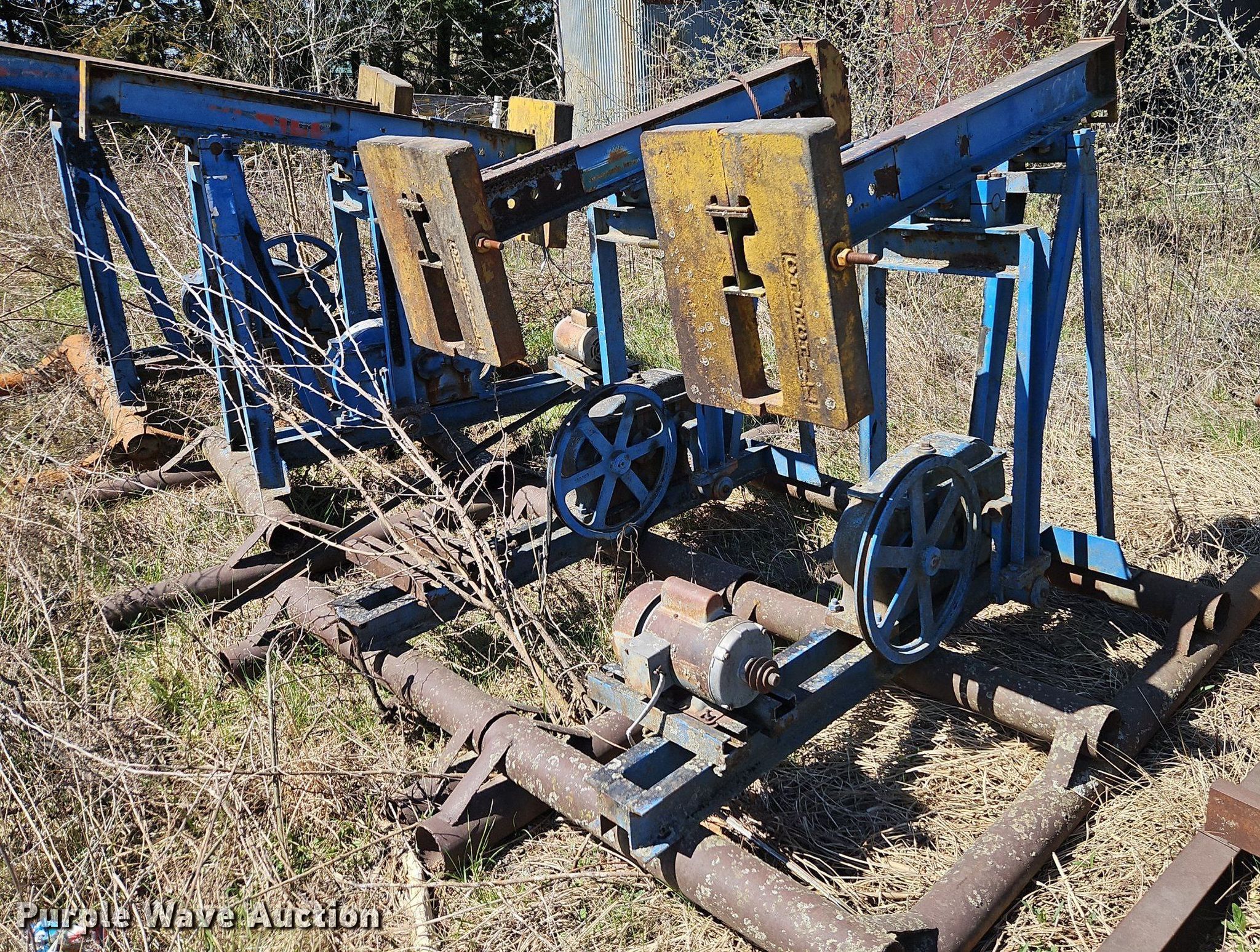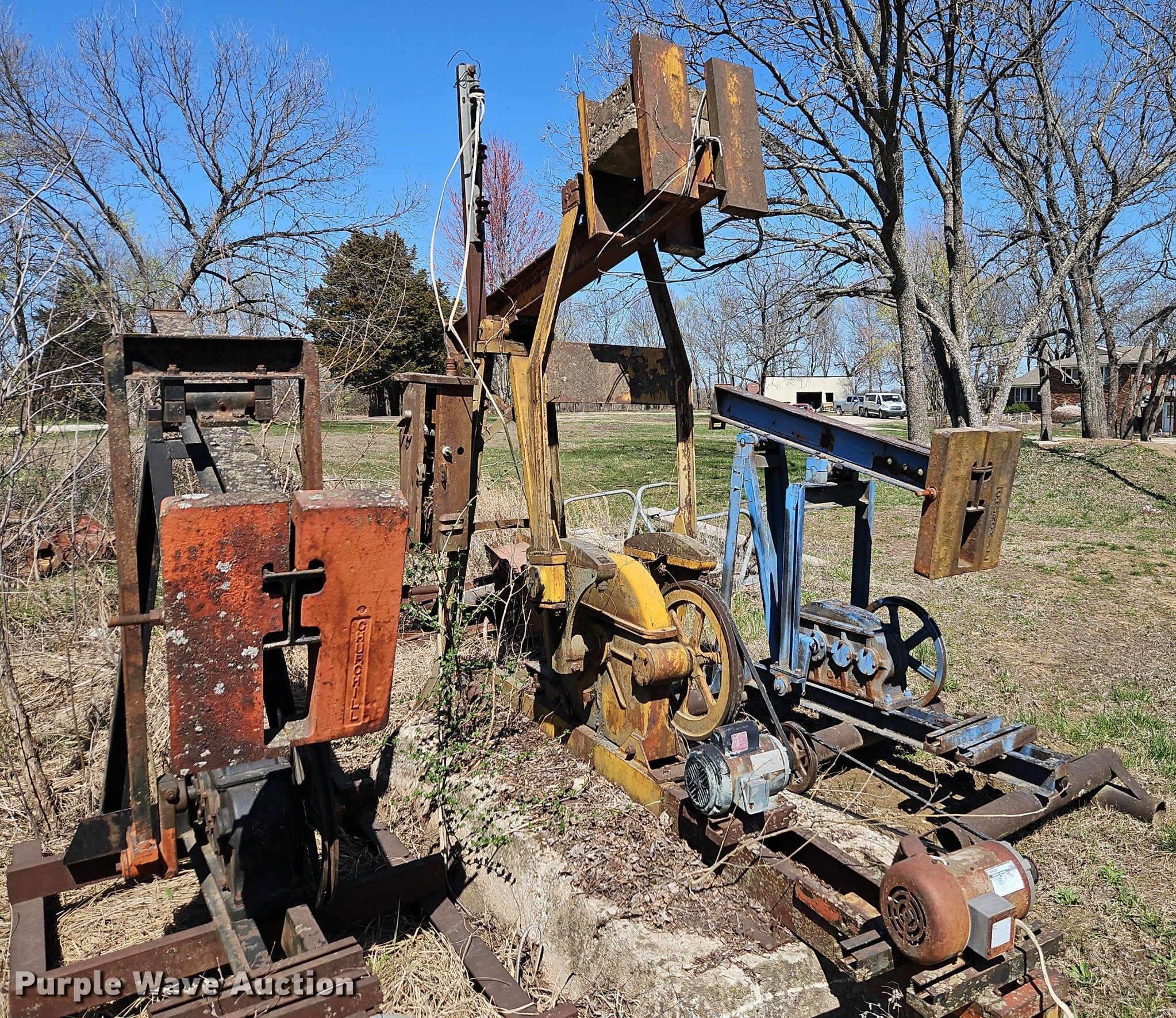 Purple Wave is selling a used Oilfield Equip. in Kansas. This item is a Oilfield equipment with the following: (8) pump jacks, (4) have motors, (2) railroad ties, Disconnect, Approx. 57 joints of pipe, Approx. 25' L x 1" diameter, (3) down hole pumps, Tank, Size: 12' x 8', Capacity: 161 BBL, Tank, Size: 9 1/2' x 8', Capacity: 100 BBL, Gun barrel tank, Capacity: Approx. 60 BBL, Unit #: 2023FP3-01 - Troutman