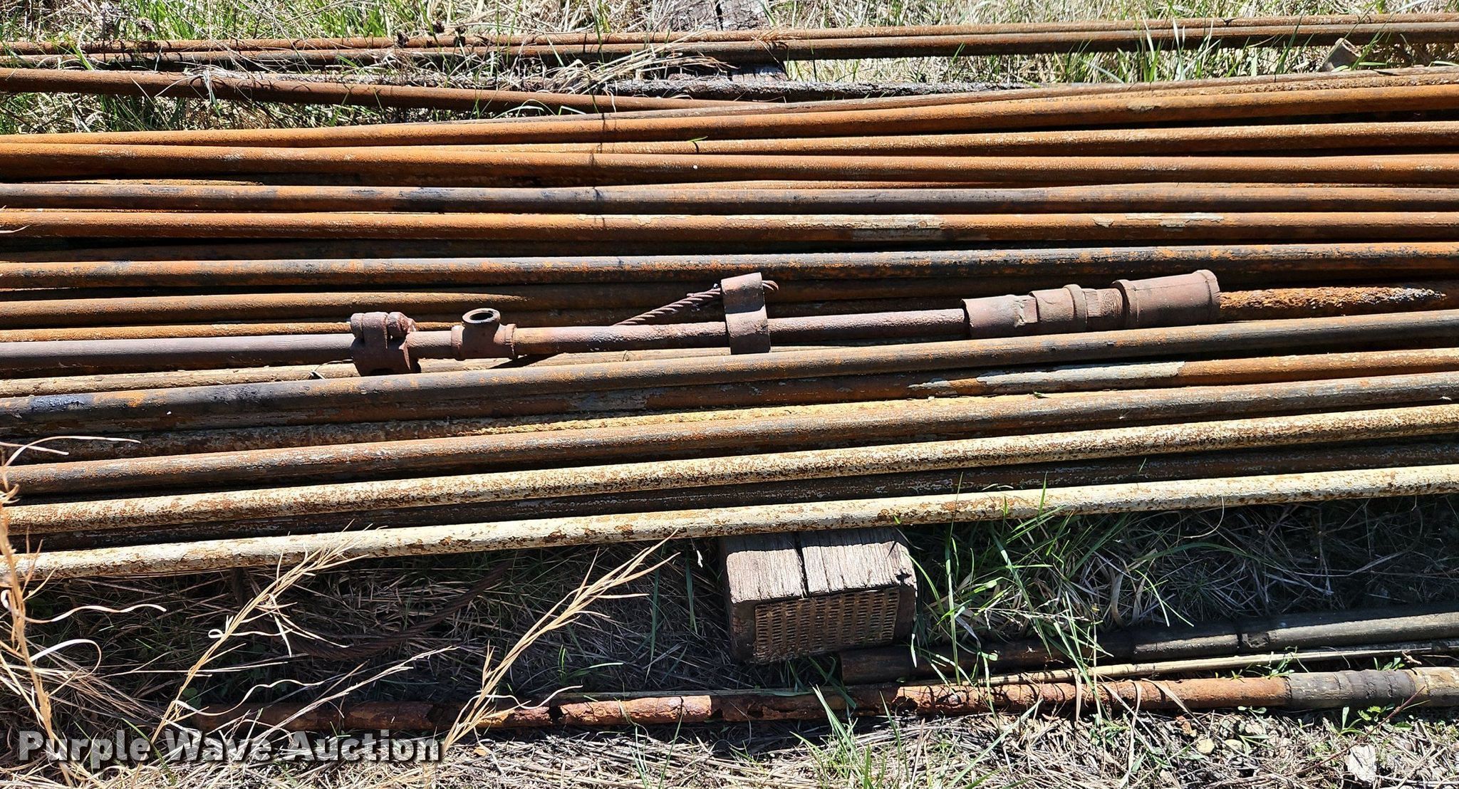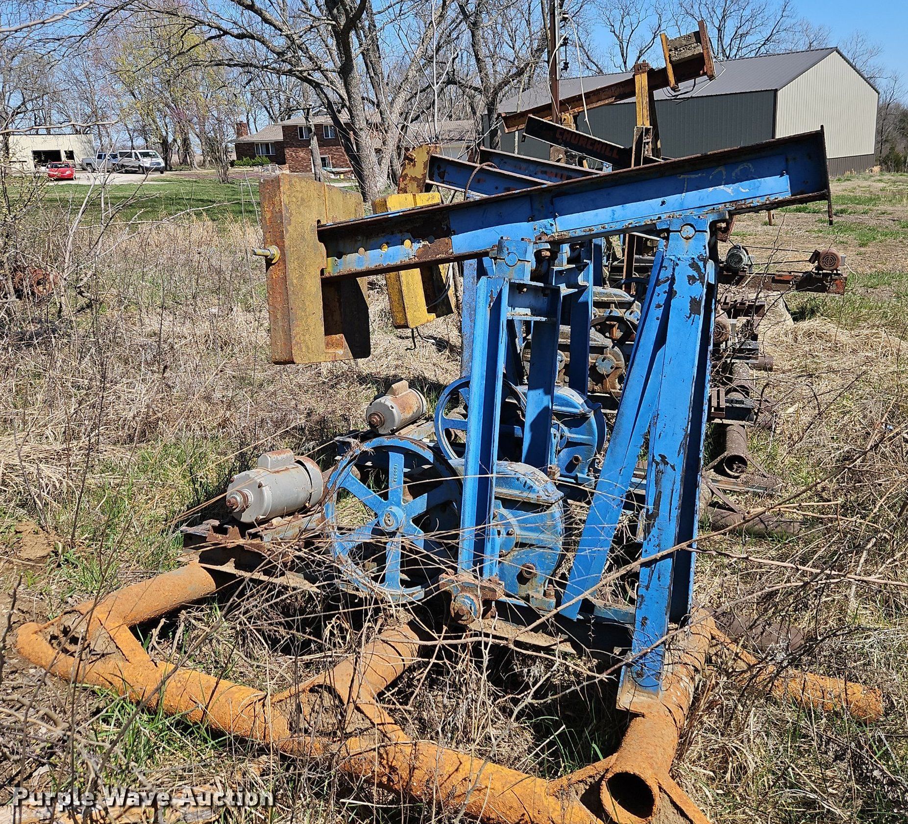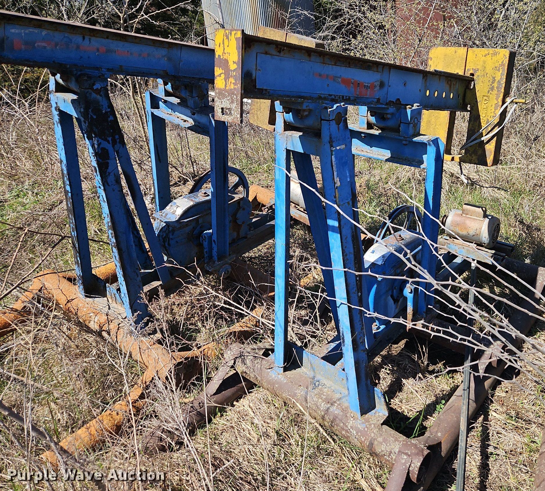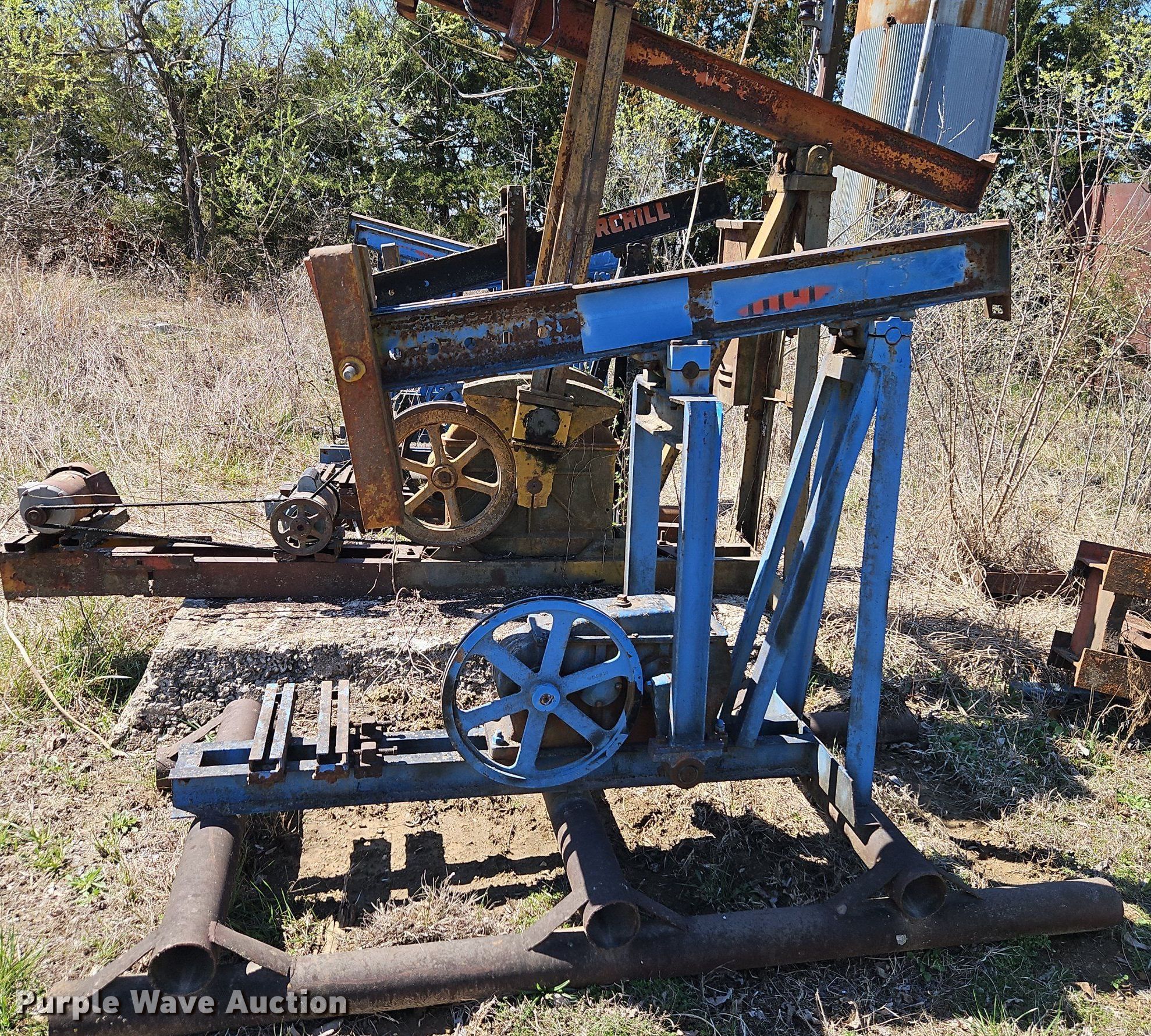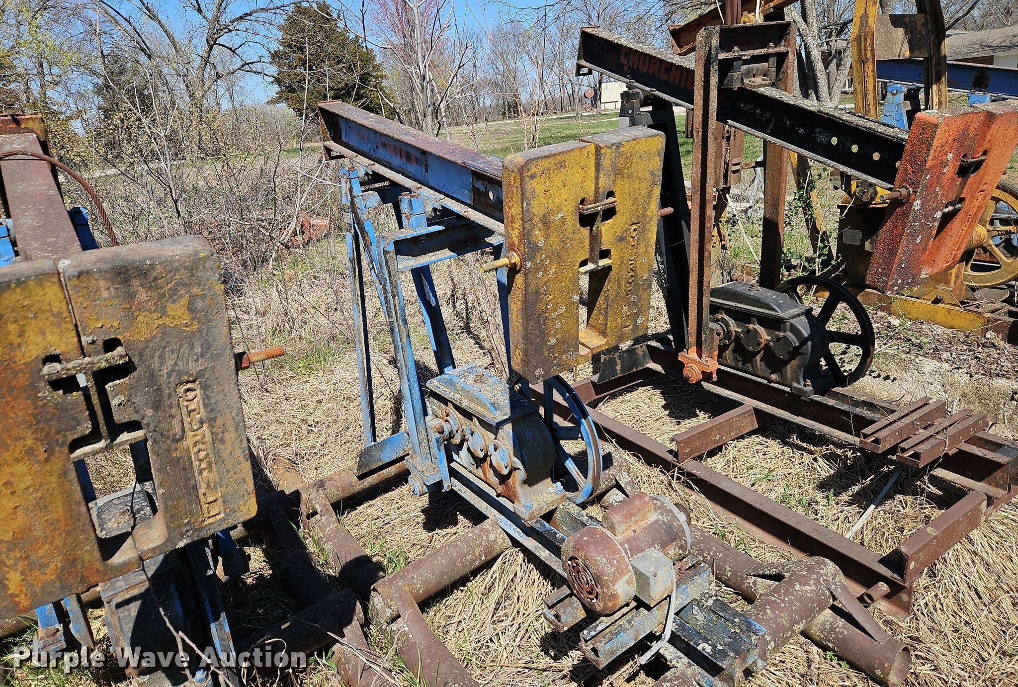 Purple Wave is selling a used Oilfield Equip. in Kansas. This item is a Oilfield equipment with the following: (8) pump jacks, (4) have motors, (2) railroad ties, Disconnect, Approx. 57 joints of pipe, Approx. 25' L x 1" diameter, (3) down hole pumps, Tank, Size: 12' x 8', Capacity: 161 BBL, Tank, Size: 9 1/2' x 8', Capacity: 100 BBL, Gun barrel tank, Capacity: Approx. 60 BBL, Unit #: 2023FP3-01 - Troutman