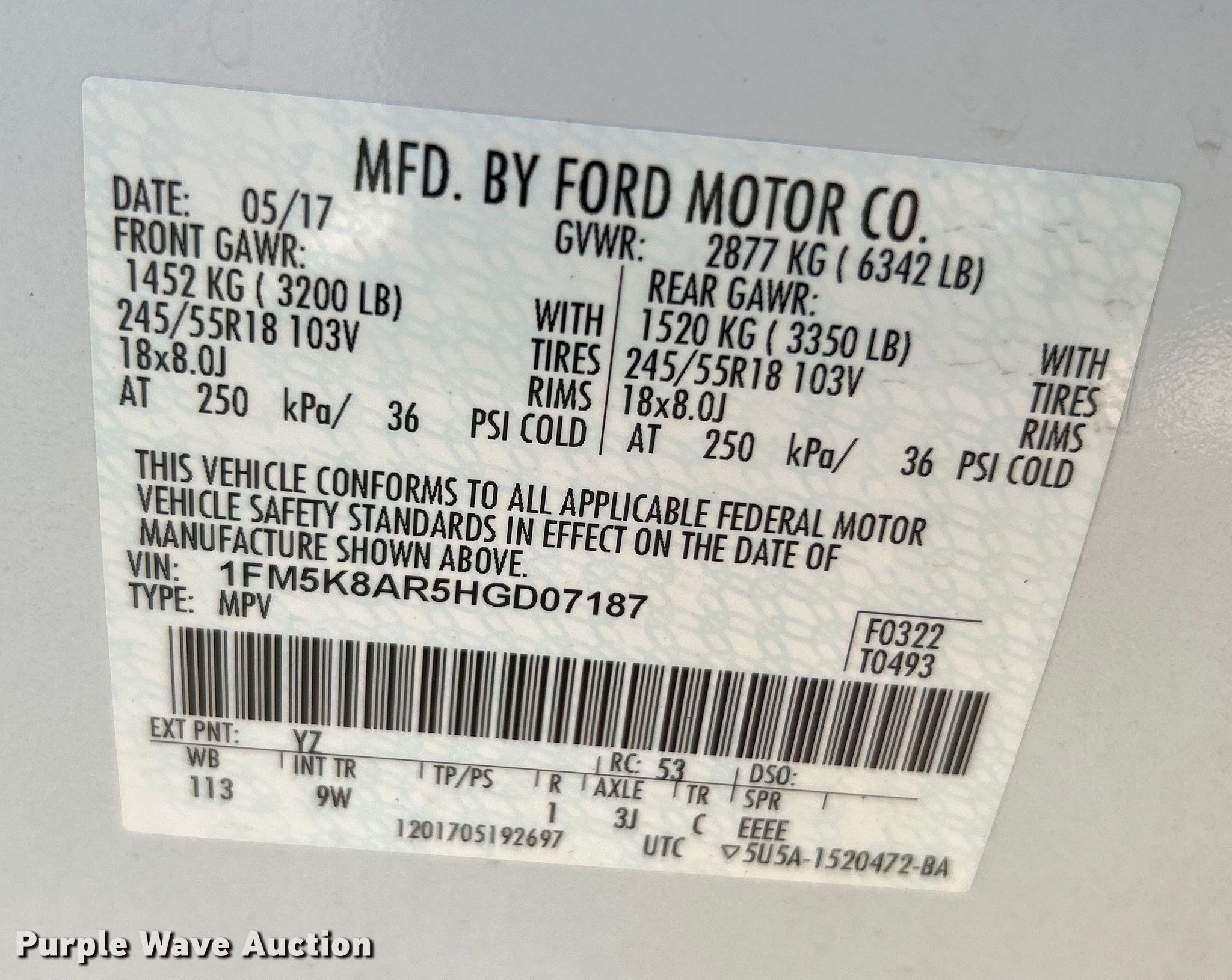 - VIN: 1FM5K8AR5HGD07187