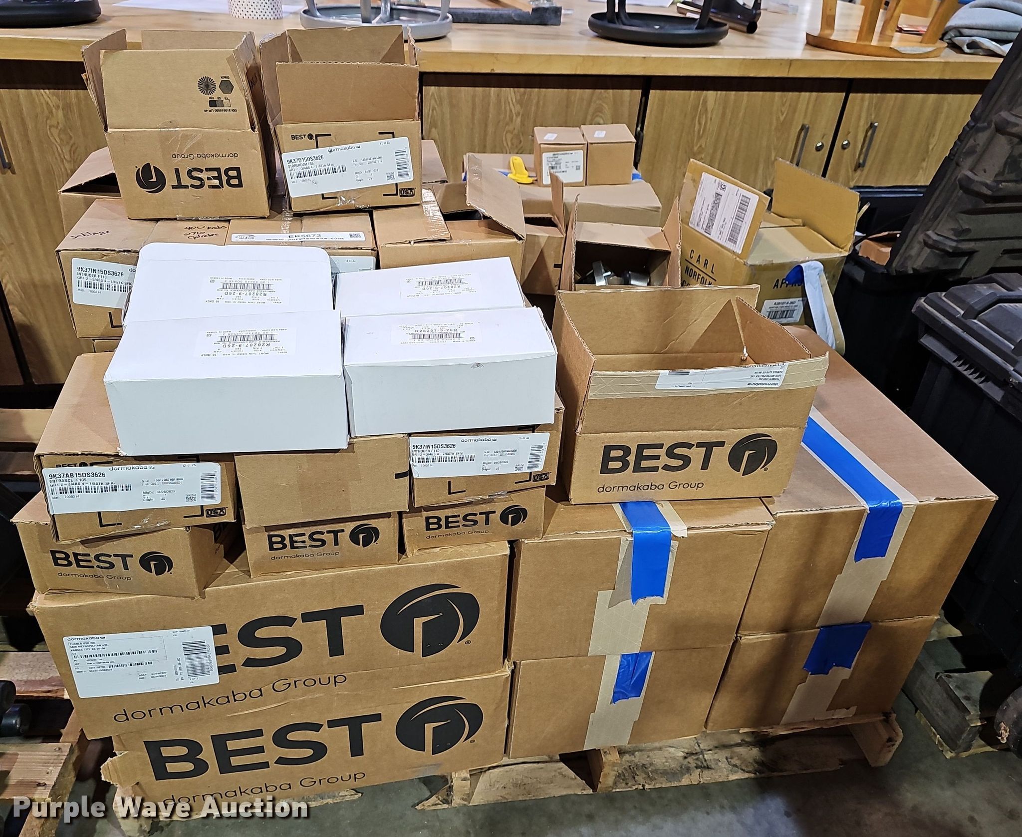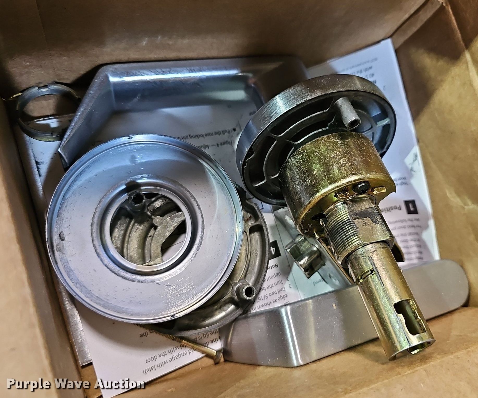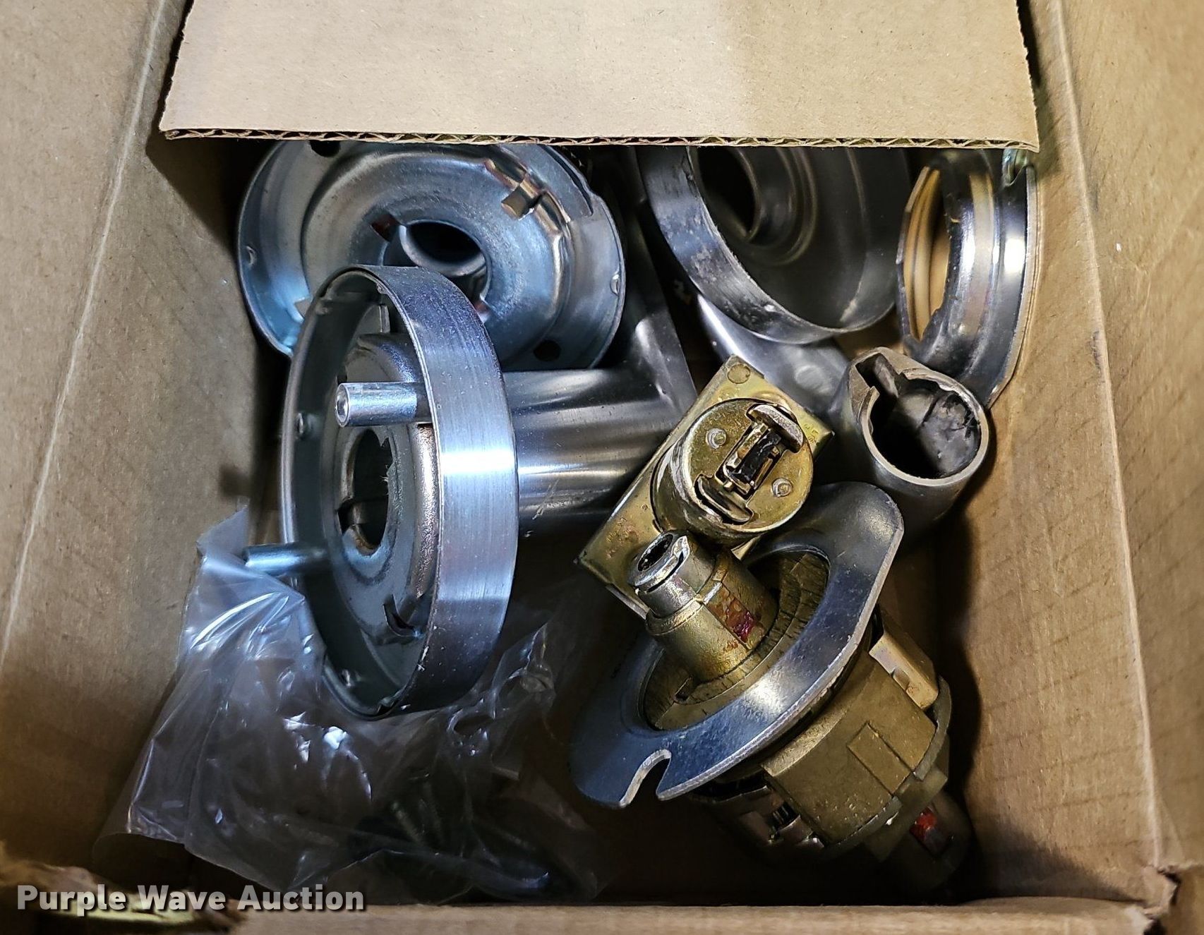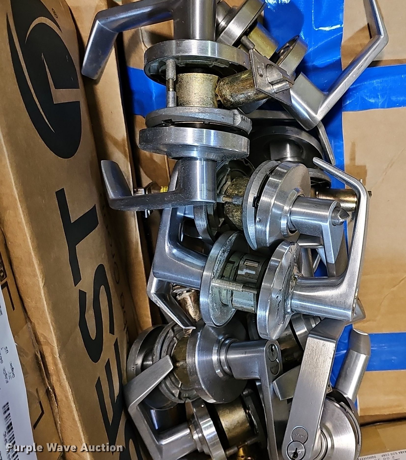 Purple Wave is selling a used Building Materials in Kansas. This item is a Schlage door handles with the following: Approx. 400 knobs, Approx. 276 cylinders, Totes not included