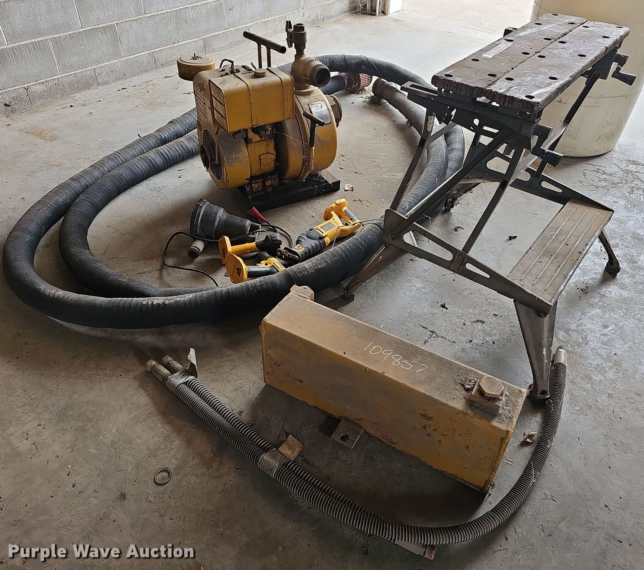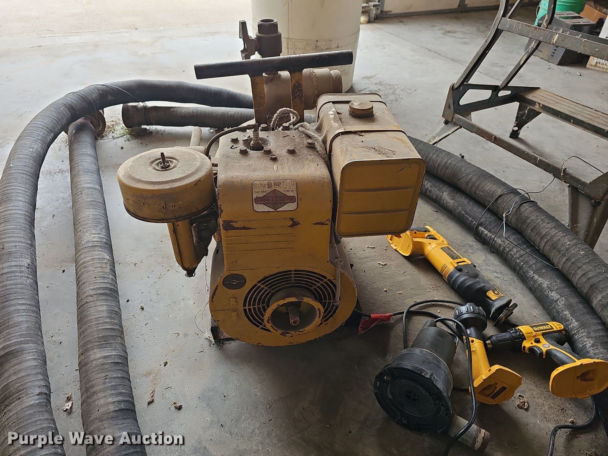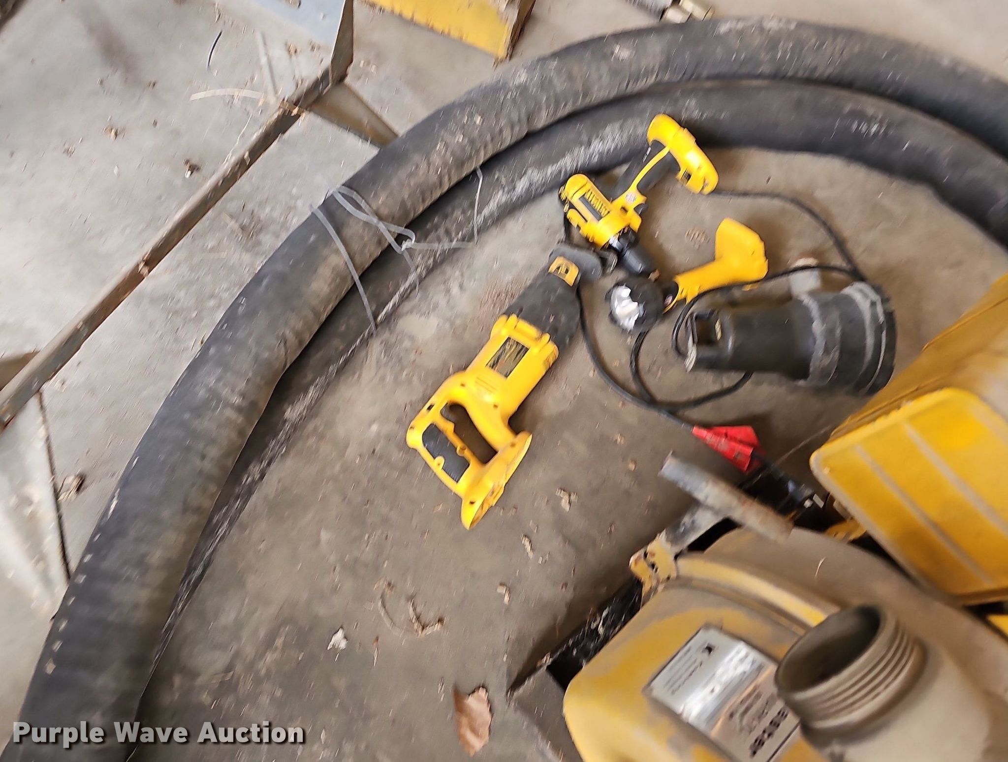 Purple Wave is selling a used Tools in Kansas. This item is a Tools with the following: Koehring Master Mark 70 trash pump, Serial: 0028291, Briggs & Stratton gas engine, HP: 9, Approx. 20'-25' suction hoses, DeWalt tools, Reciprocating tools, Drill, Flashlight, No batteries, (2) hydraulic hoses, Hydraulic oil reservoir tank