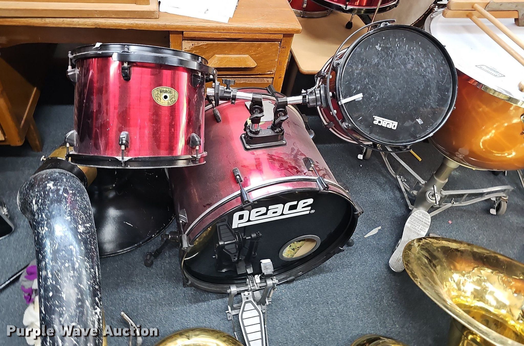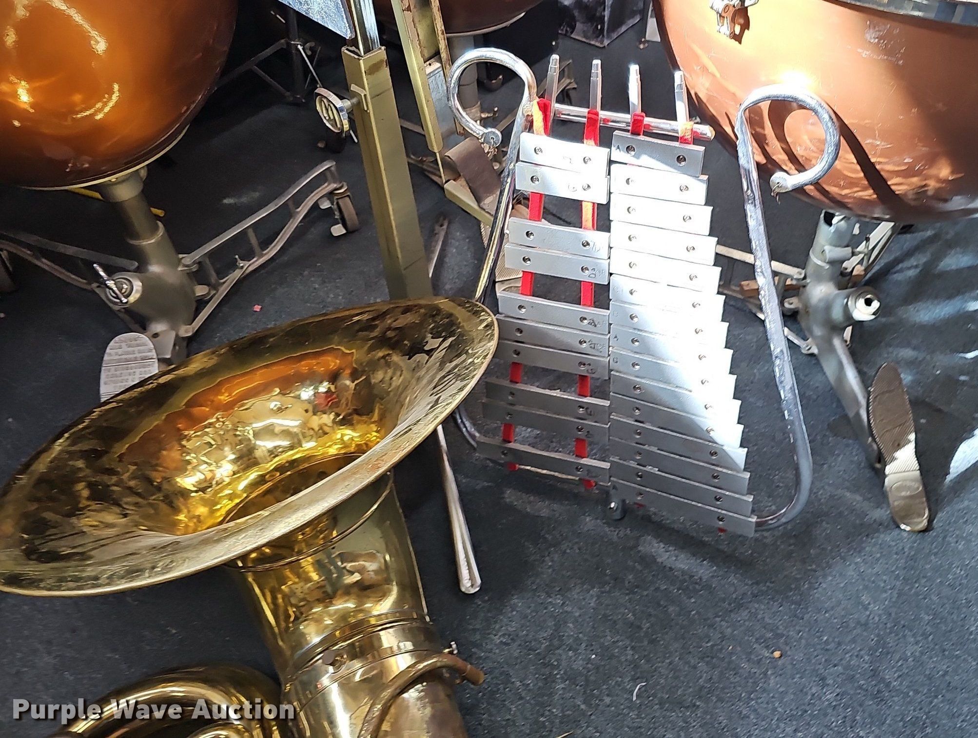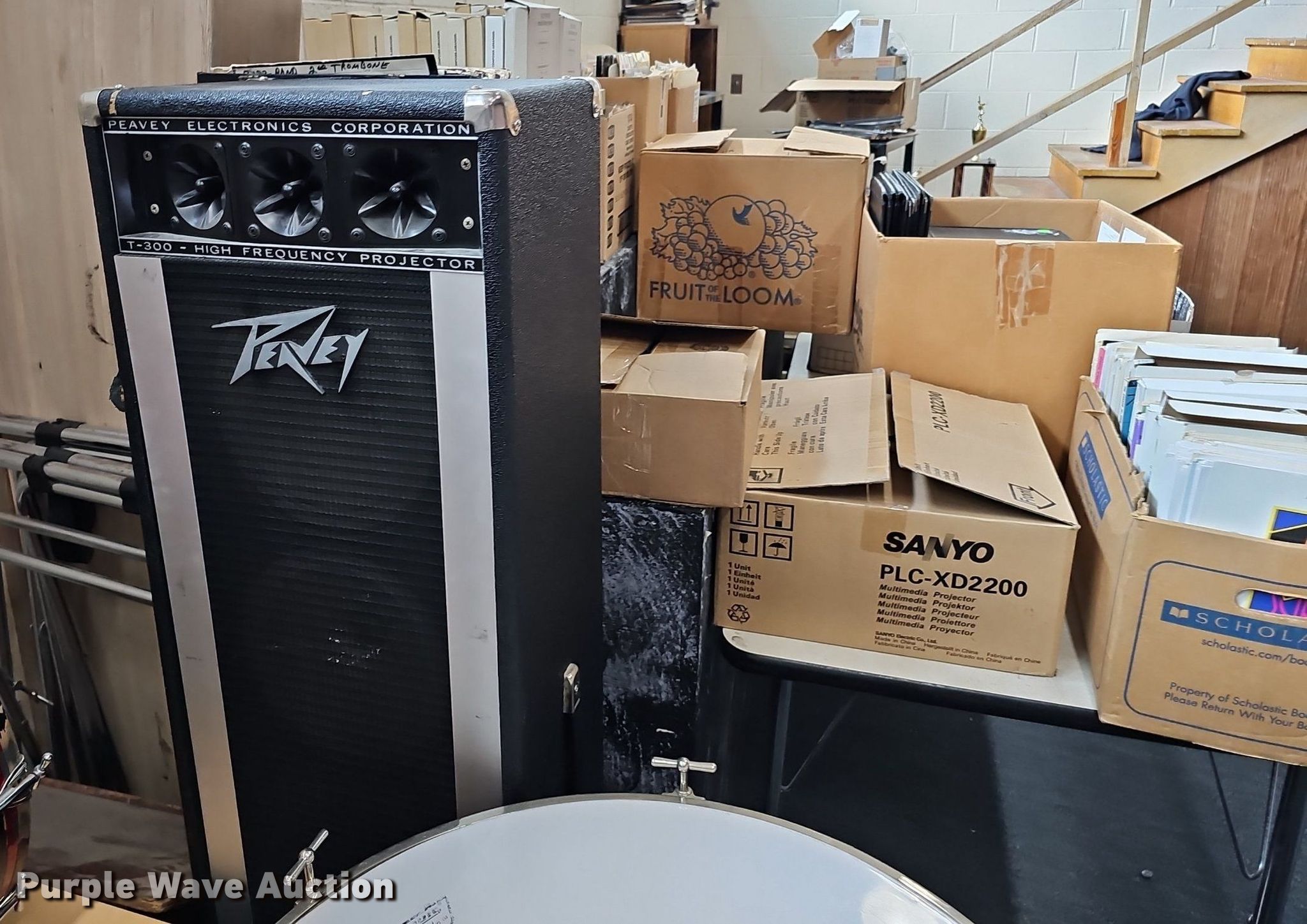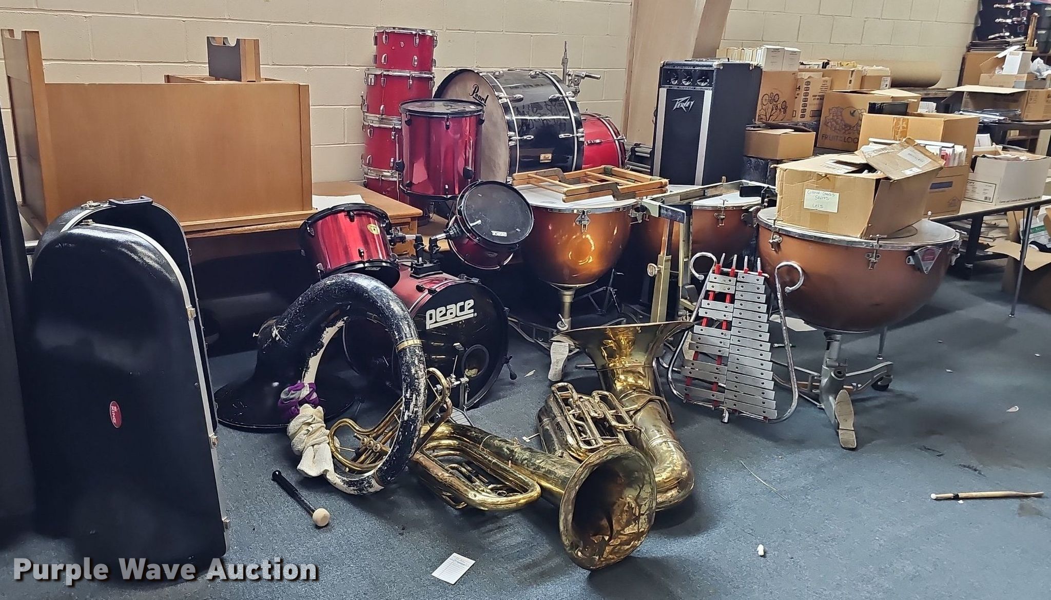 Purple Wave is selling a used Music Equip. in Iowa. This item is a Music equipment with the following: Tubas: 2, Drums: 7, Desks: 2, Peavey T300, (13) boxes of sheet music, Podium, Ball cage
