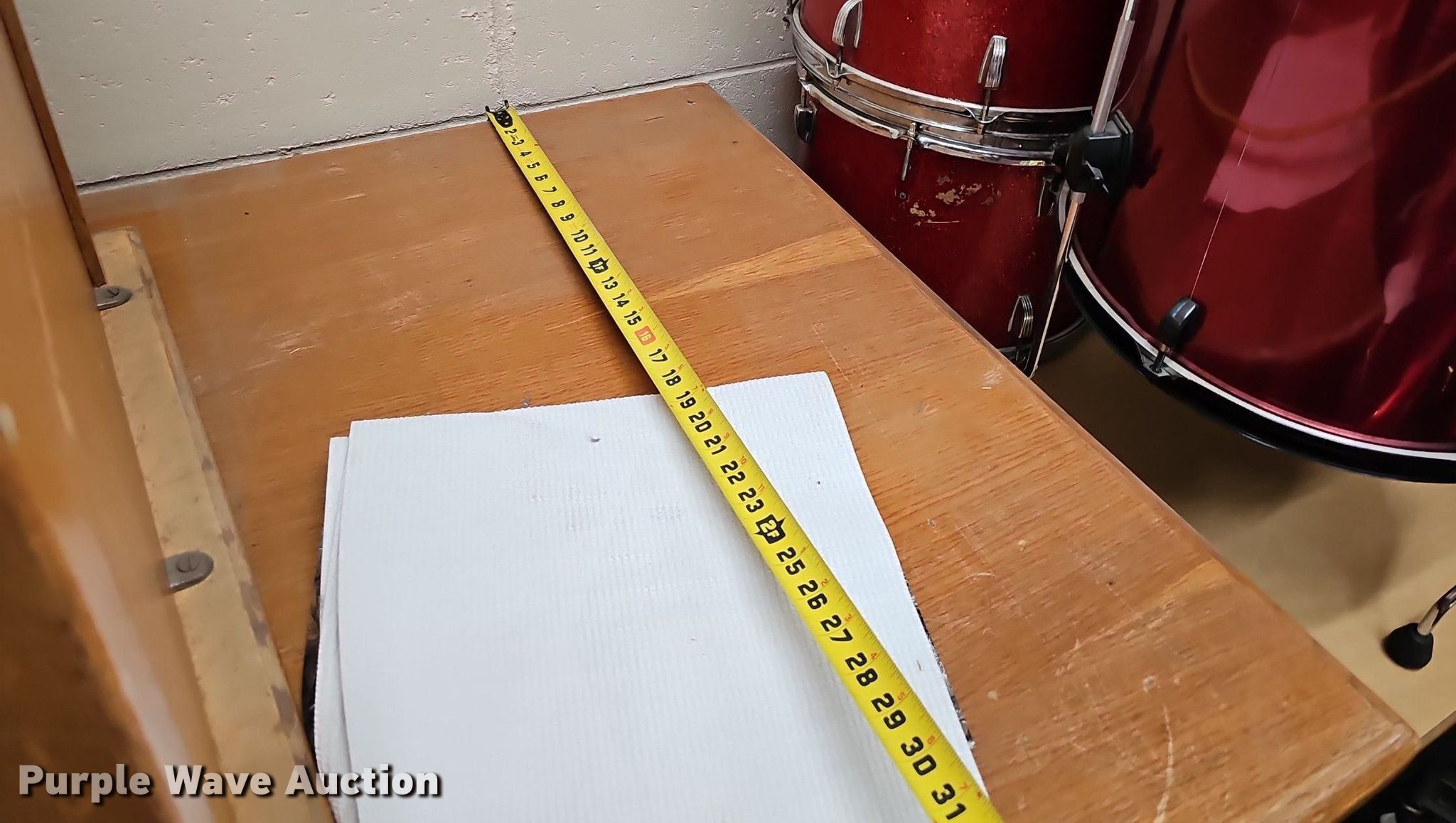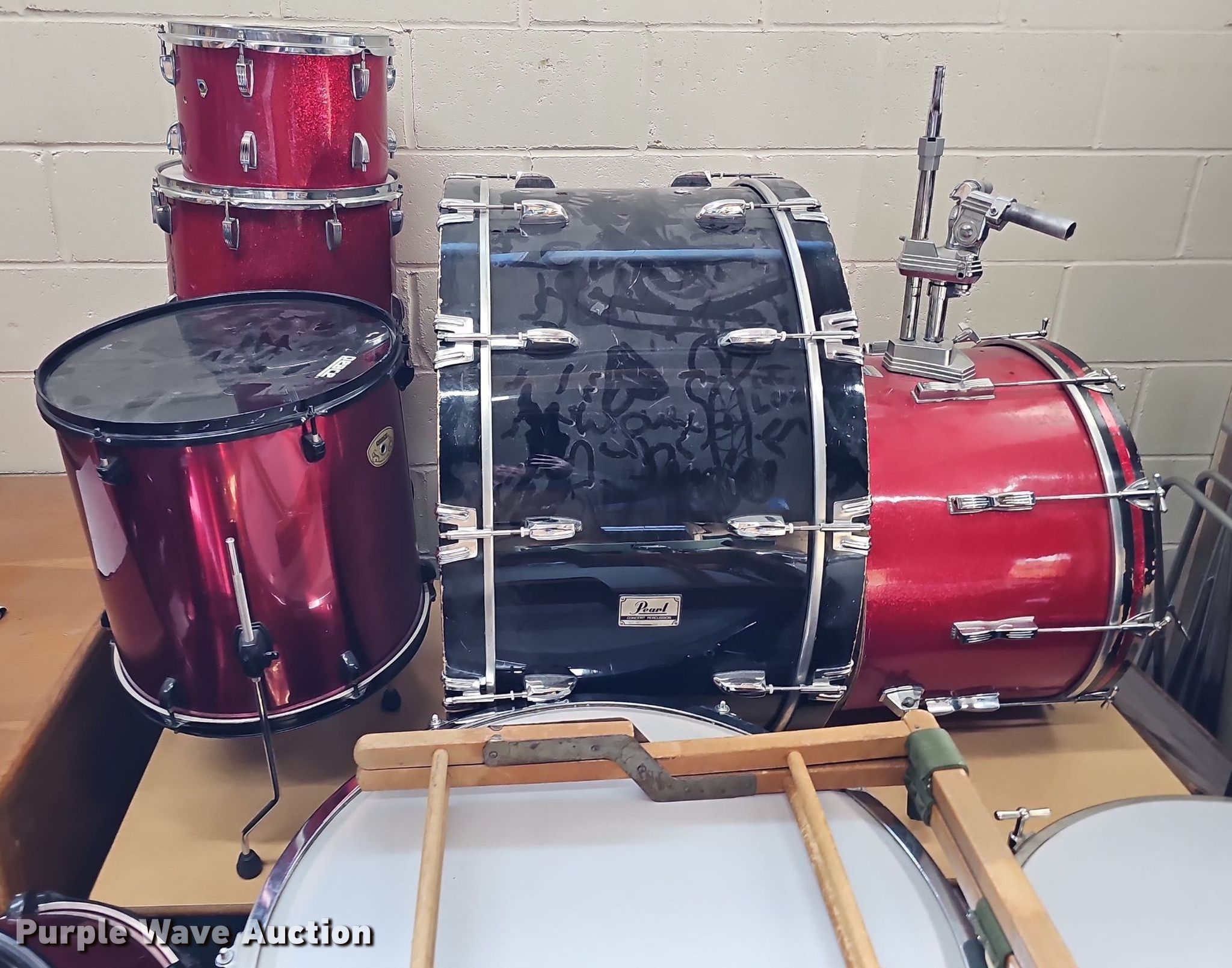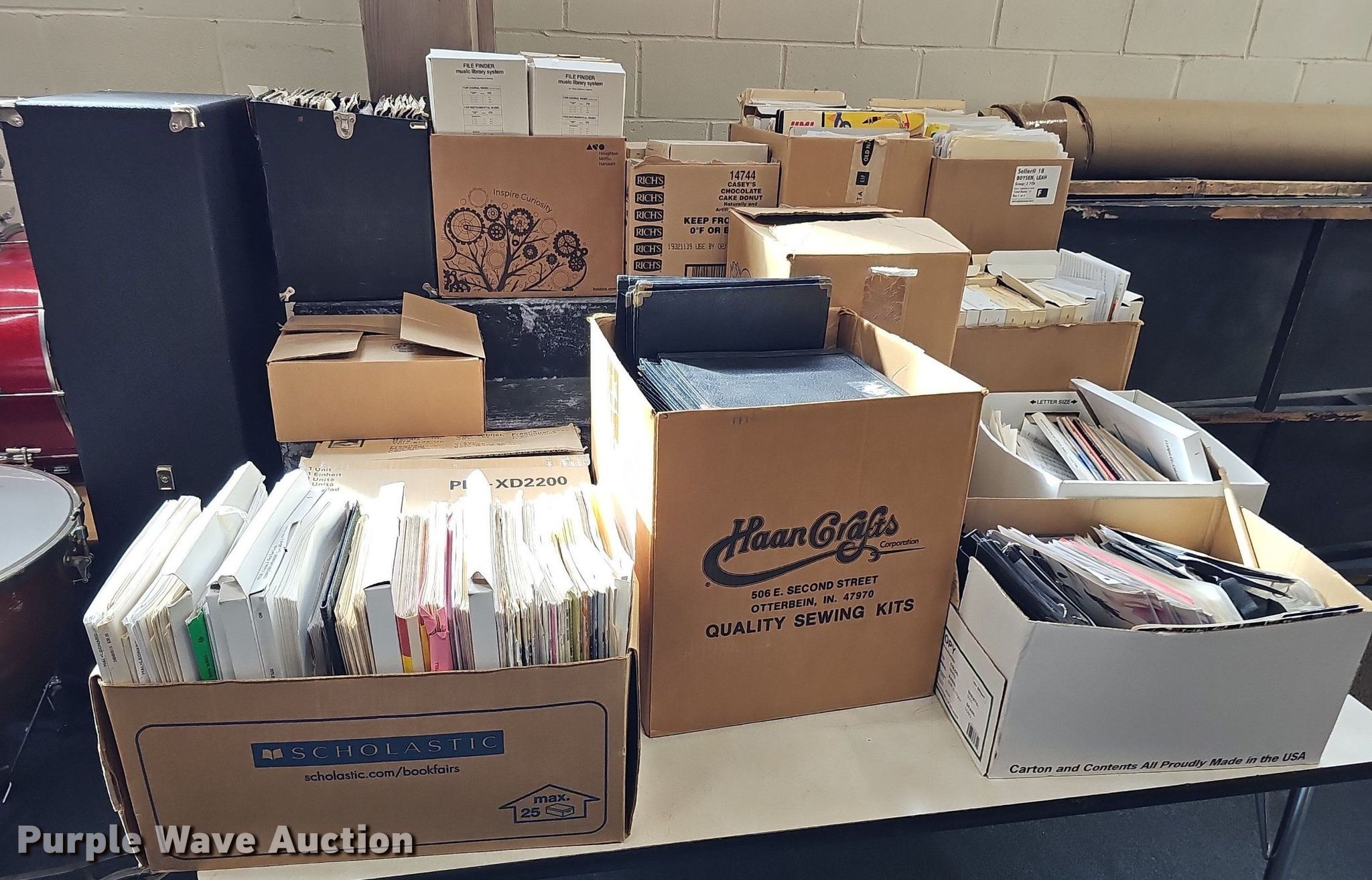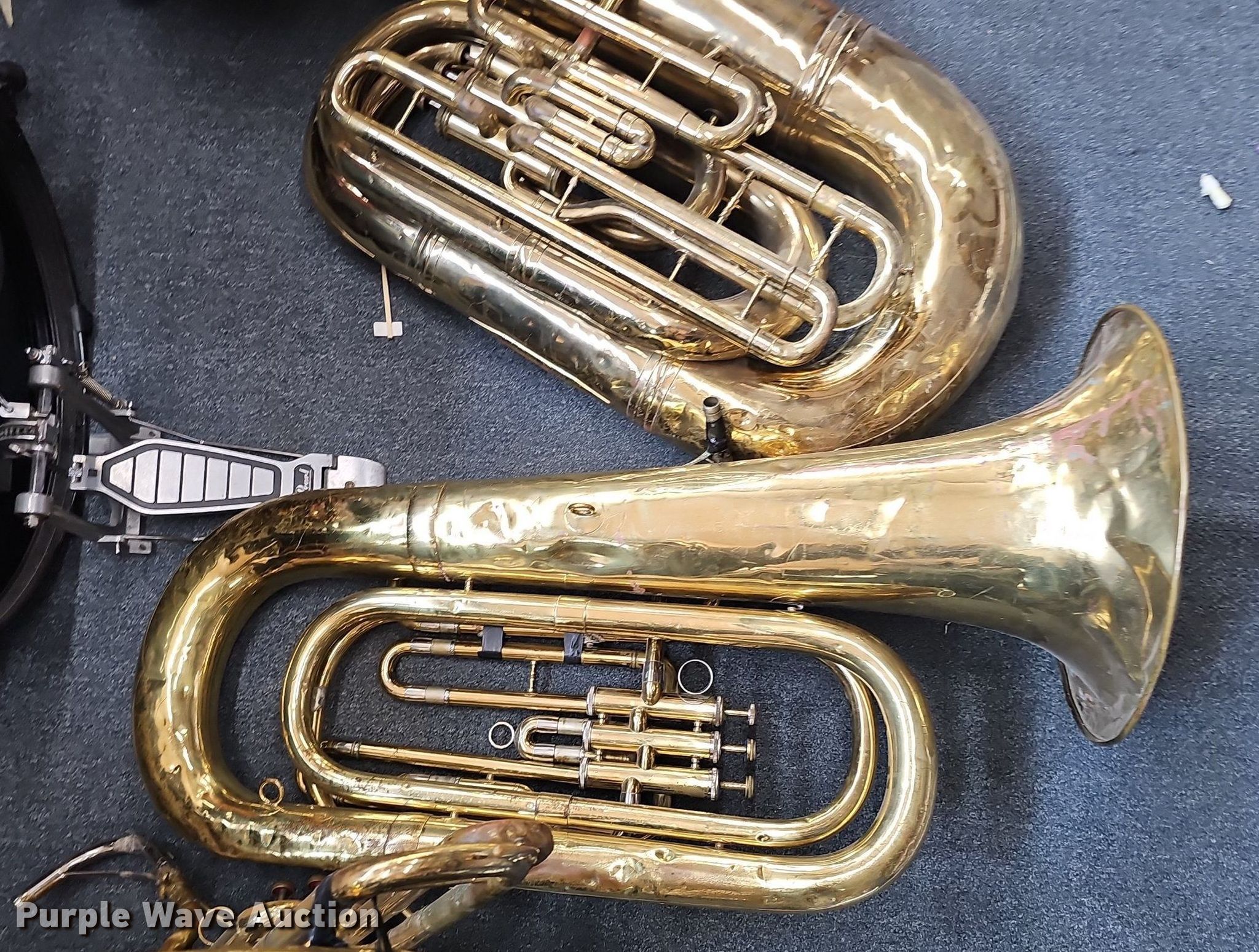 Purple Wave is selling a used Music Equip. in Iowa. This item is a Music equipment with the following: Tubas: 2, Drums: 7, Desks: 2, Peavey T300, (13) boxes of sheet music, Podium, Ball cage