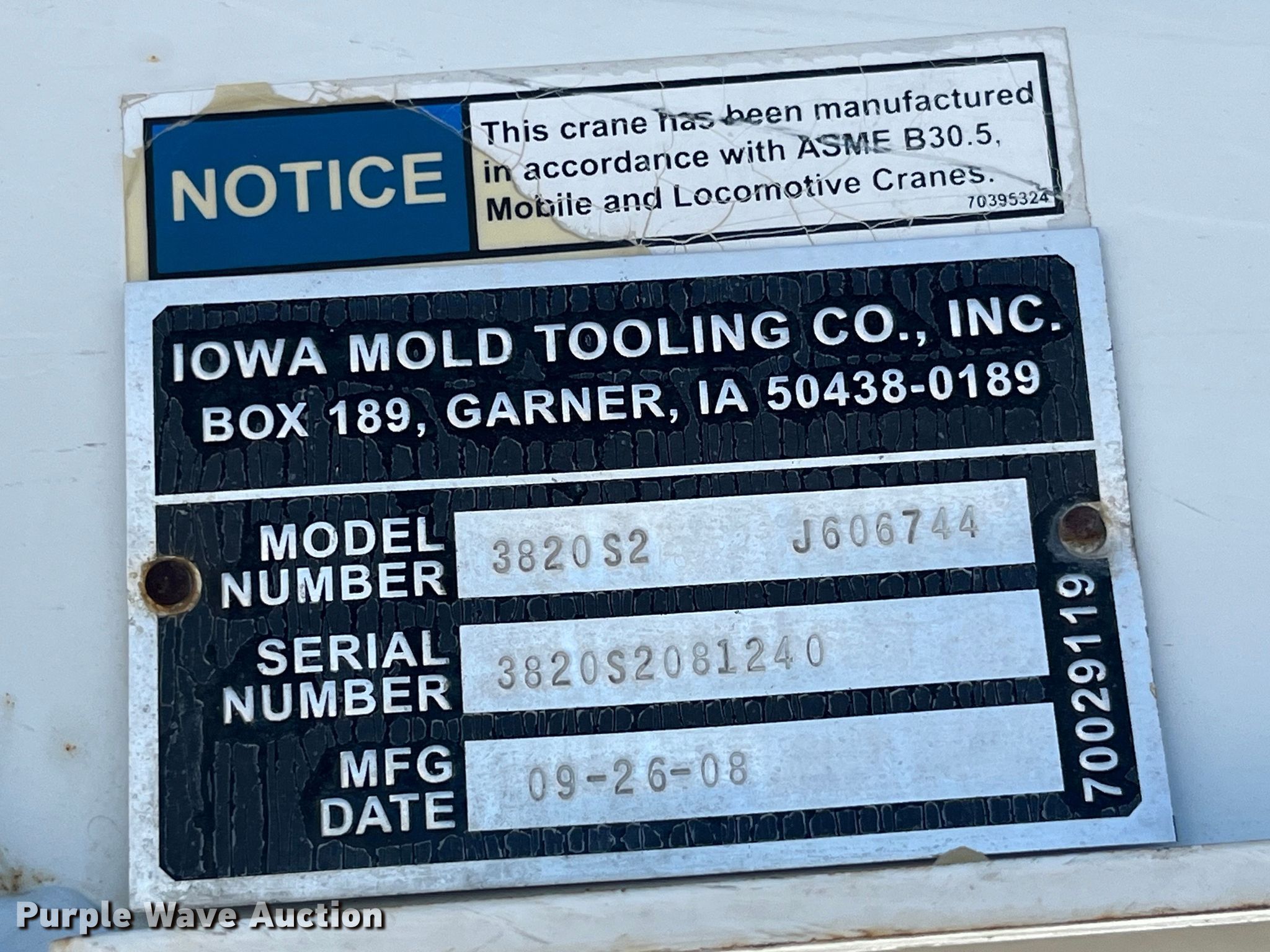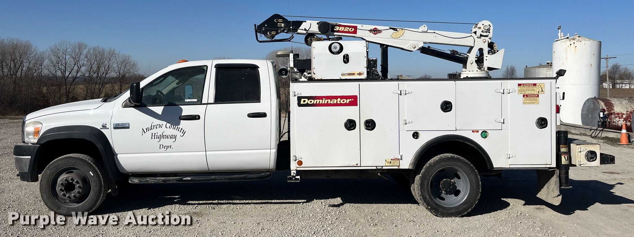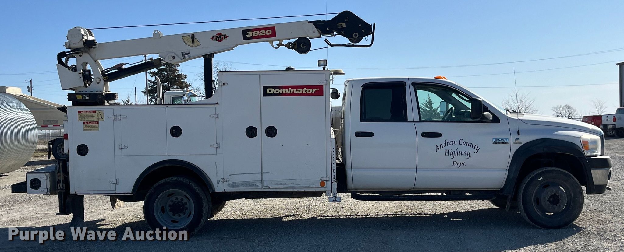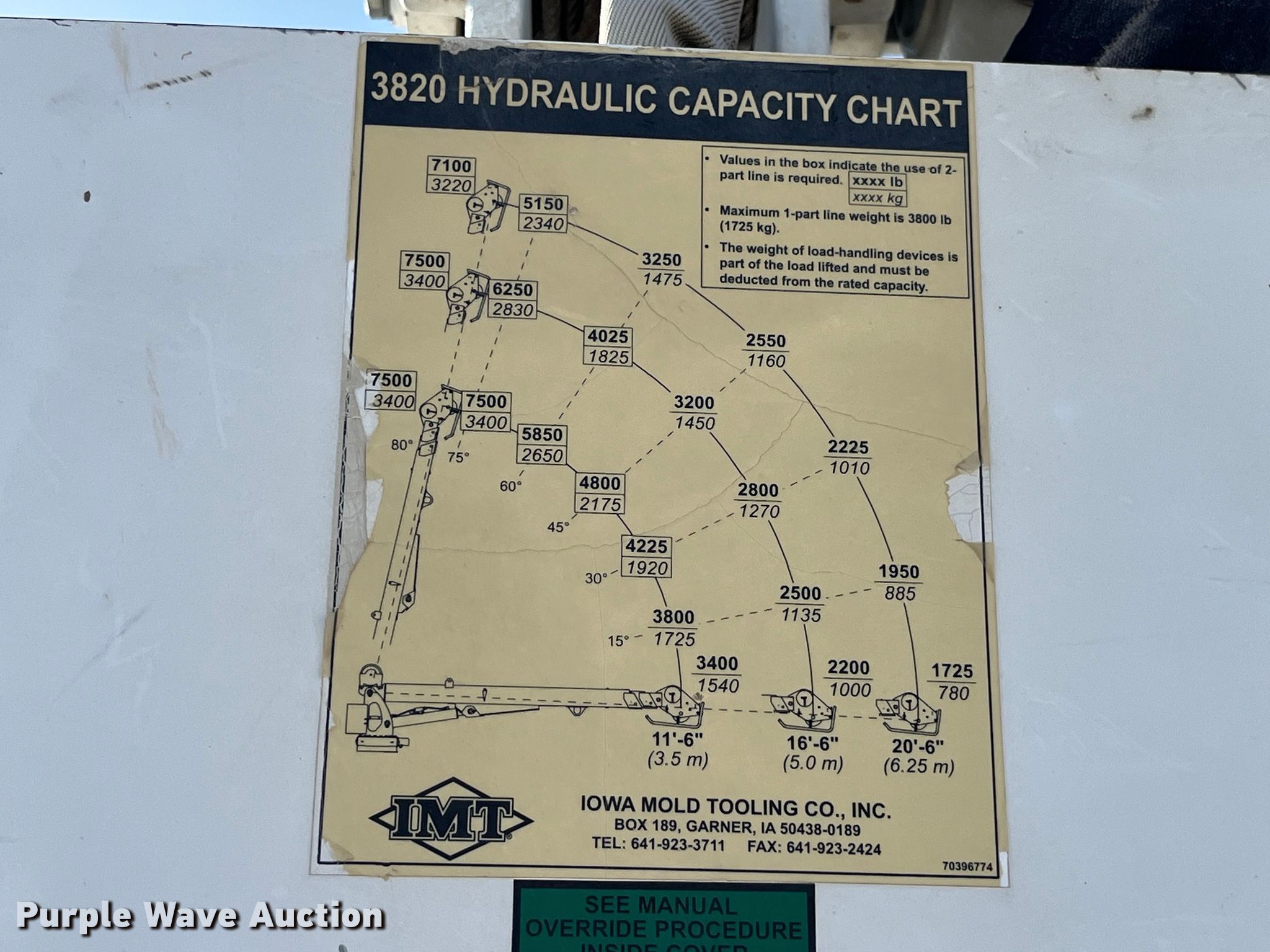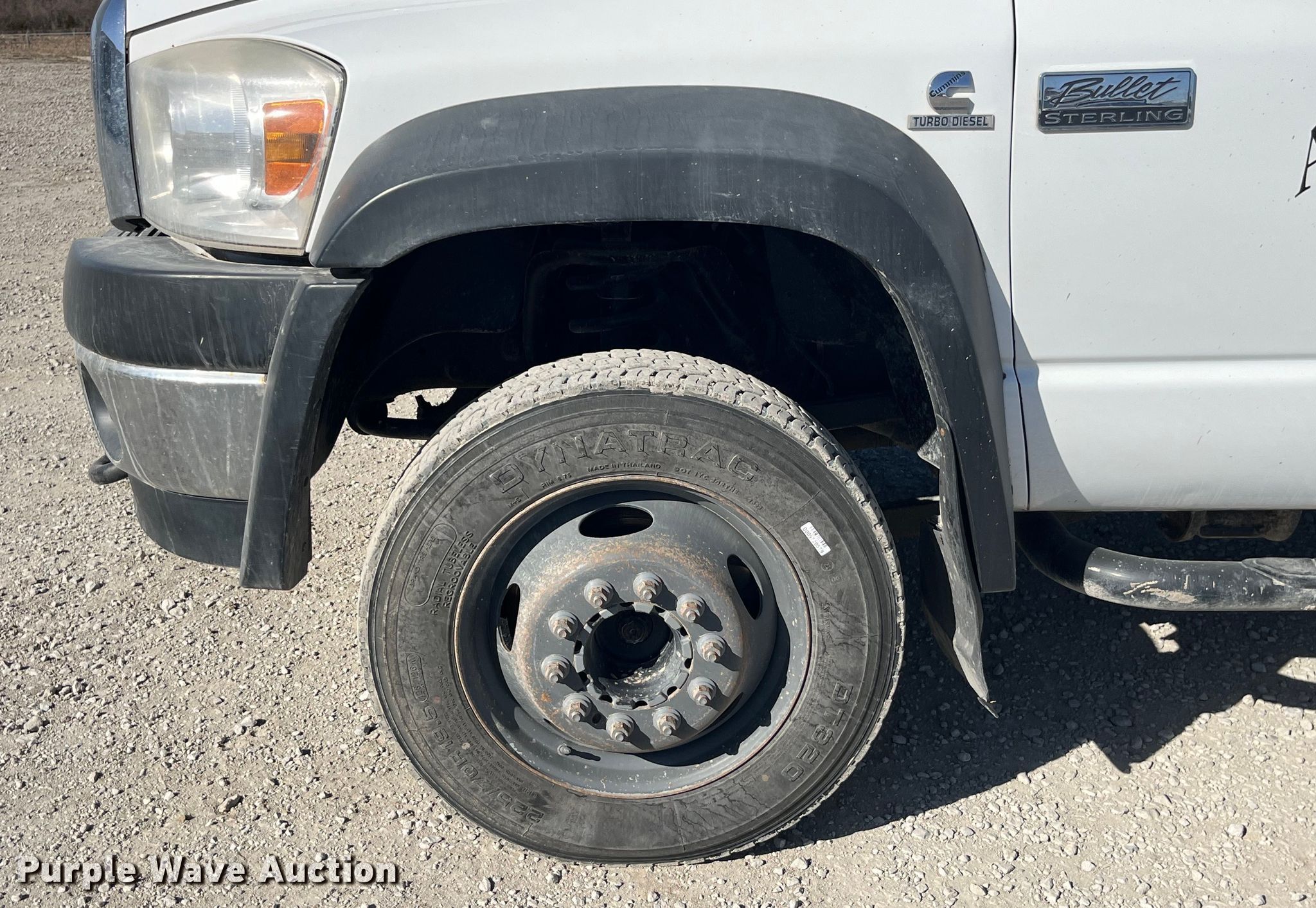 2008 Sterling Bullet utility / service truck. Miles: 265,897 on odometer, VIN: 3F6WK78A18G350688. Engine Cummins, Displacement: 6.7L, Cylinders: 6, Fuel type: Diesel. Transmission Automatic. Chassis Four wheel drive, Axles: Single, Suspension: Spring, Brakes: Hydraulic, PTO, GVWR: 19,500 lbs. Interior AC, heat, Heated mirrors, Cruise control, Brake controller. Features Bed Iowa Mold Tooling Co Inc DOM162 J606743, 10' 11" L x 7' W x 10" W, Torch bottle rack, Air compressor IMT, Crane IMT 3820, Maximum boom length: 20' Maximum lift capacity: 3,800 lbs, Block and hook Capacity: 4 tons. Tires Size: 225/70R19.5. Notes EGR deleted, Dash warning indicator: Check engine, Airbag, Windshield chipped or cracked, Crane cable damaged, needs replaced. Missouri title. Title distribution may be delayed up to 14 days from verification of funds. Andrew County Missouri. 15950 County Road 322. Savannah, MO 64485