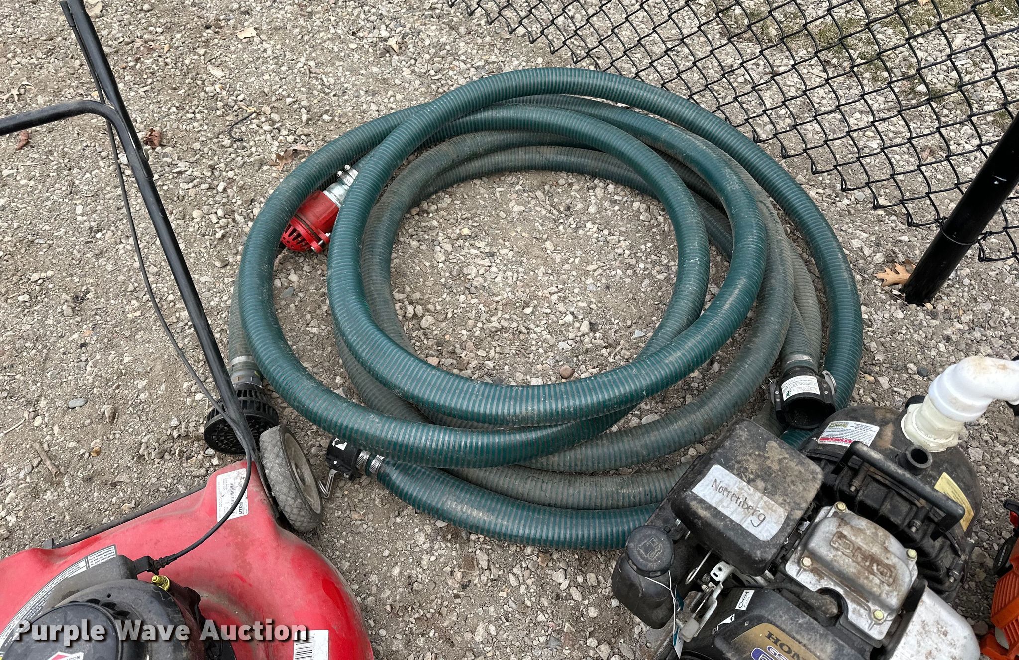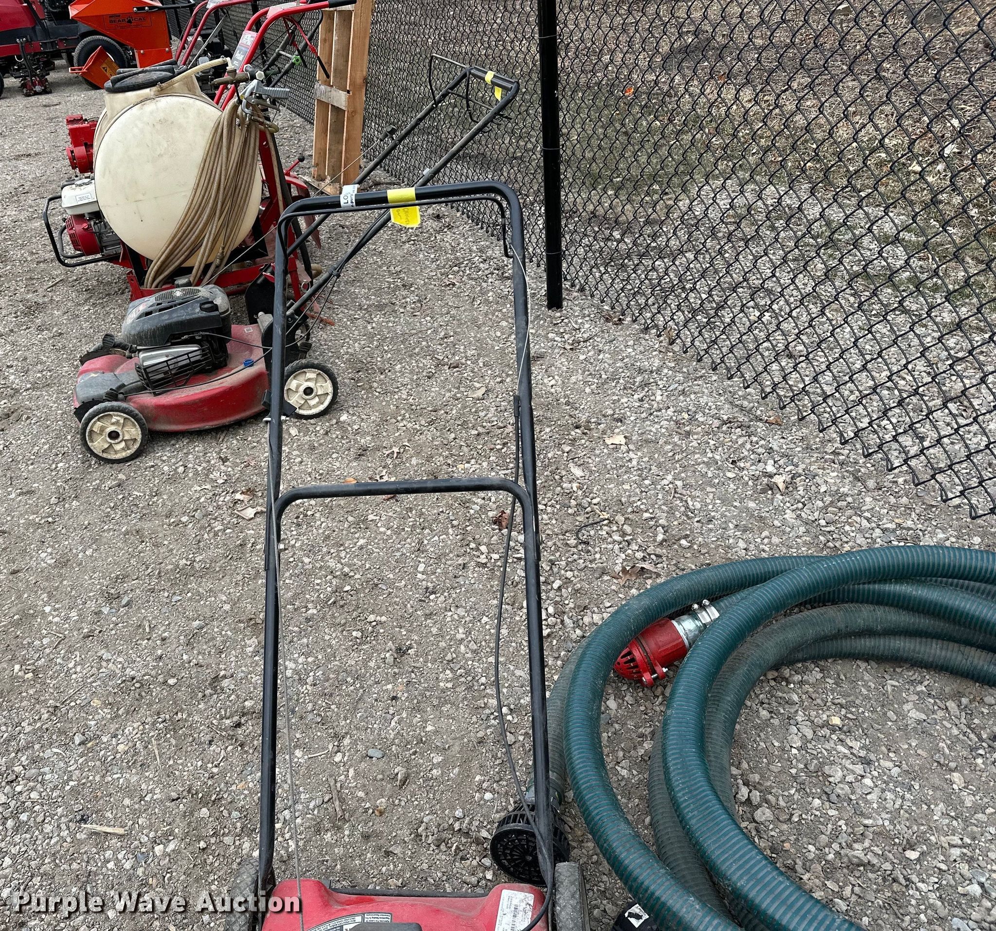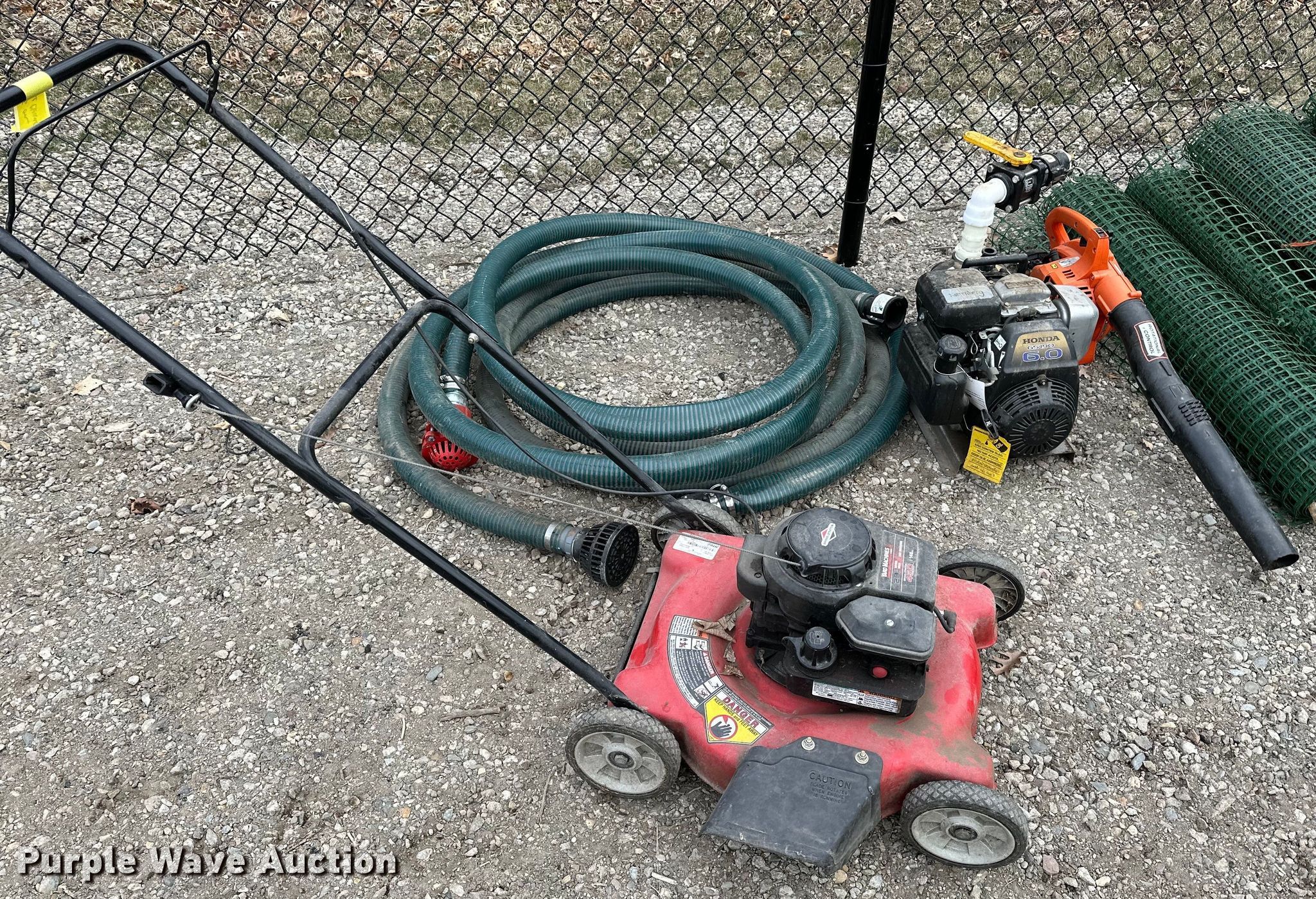 Purple Wave is selling a used Lawn and Garden in Minnesota. This item is a Lawn equipment with the following: Yard Machines push mower, Width: 20", Honda pump, HP: 6, Inlet/outlet: 2", Hose, Echo PB 250LN blower