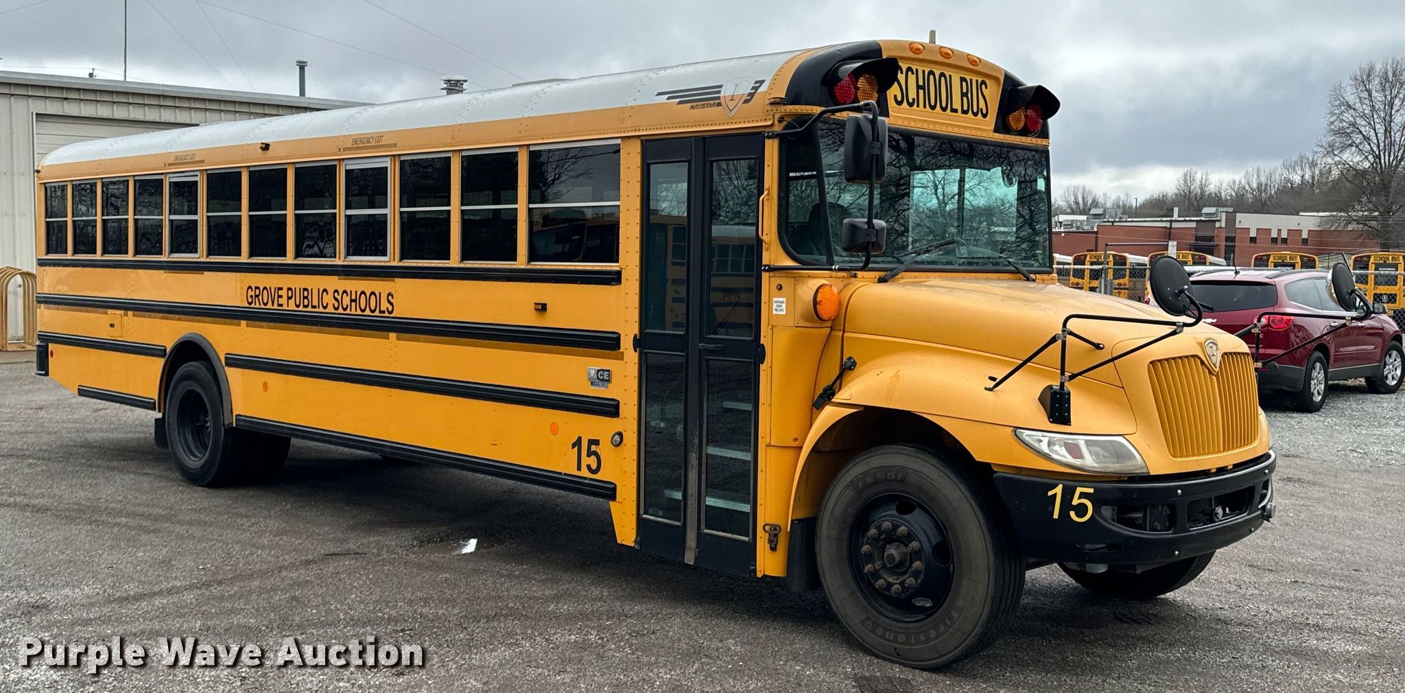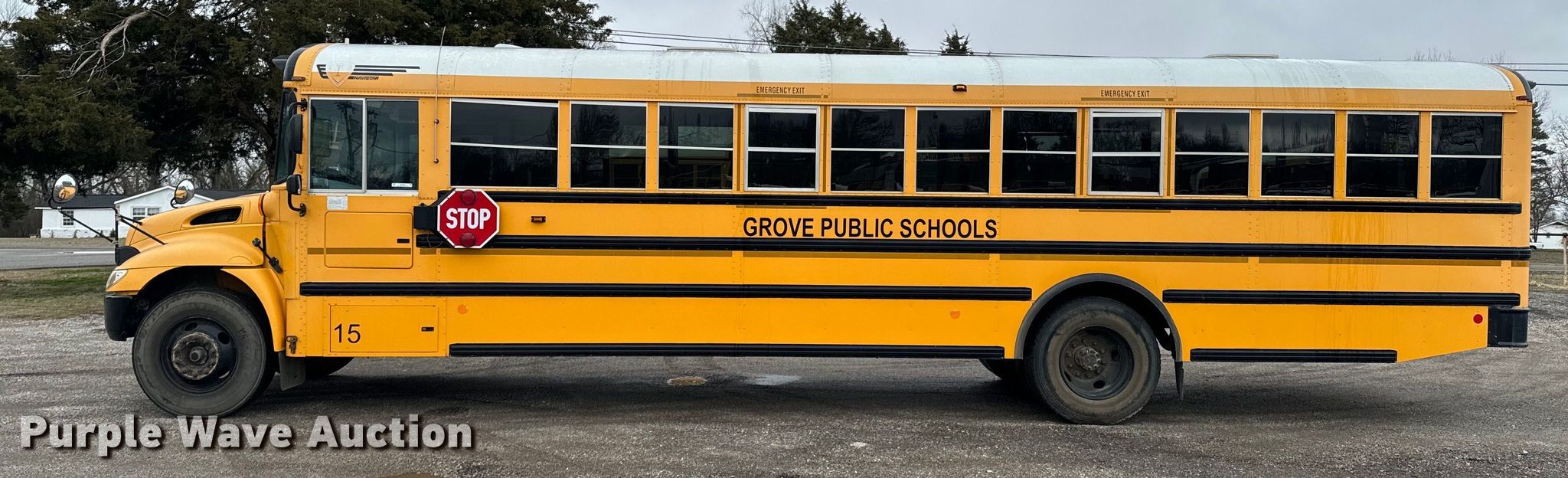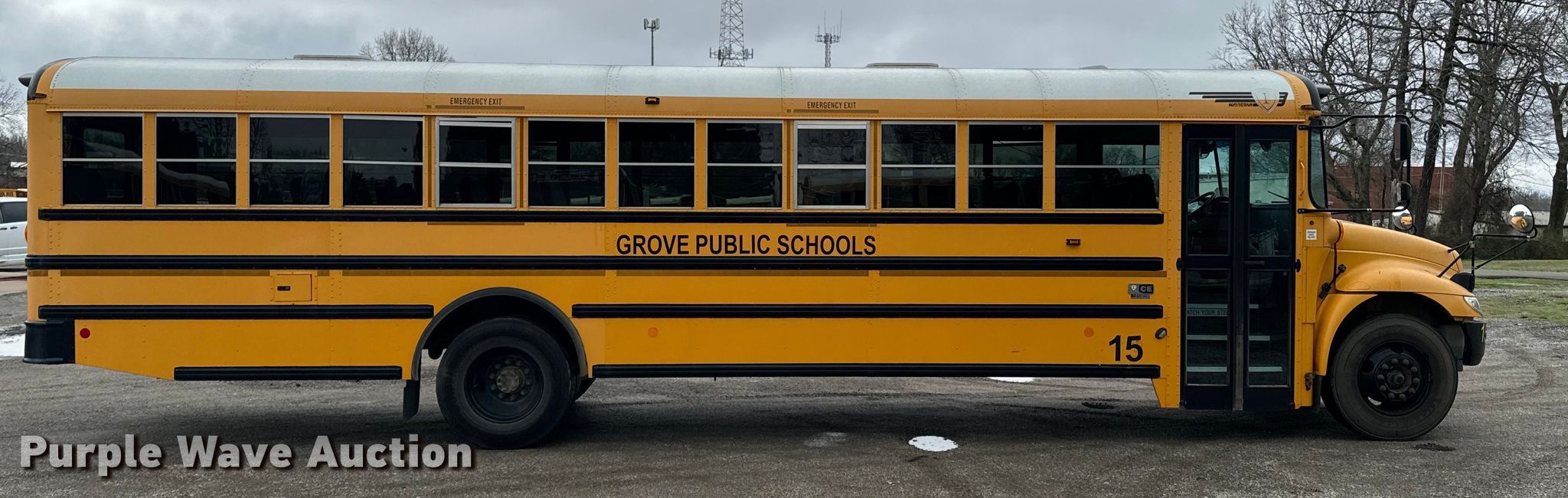 2015 International CE school bus. Miles: 56,424 on odometer, VIN: 4DRBUSKP8FB027779. Engine International MaxxForce 7, Displacement: 6.4L, Cylinders: 8, Fuel type: Diesel. Transmission Automatic. Chassis Axles: Single, Suspension: Spring, Brakes: Hydraulic, GVWR: 29,800 lbs. Interior Heat, Heated mirrors, Cruise control, Auxiliary controls, Adult seats: 24. Tires Size: 11R22.5. Oklahoma title. Title distribution may be delayed up to 30 days from verification of funds. Grove Public Schools. Grove, OK 74344
