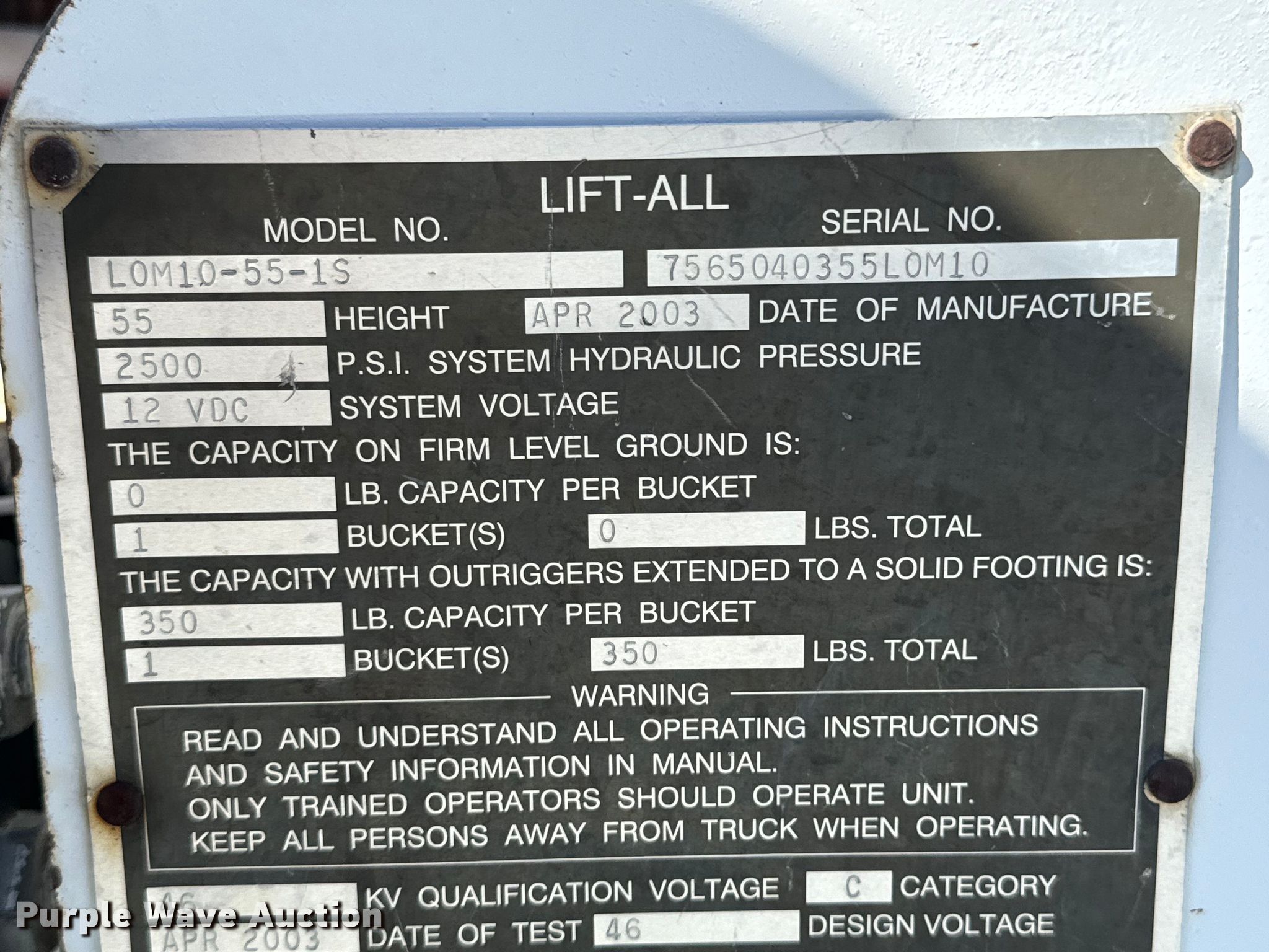 2003 GMC C7500 bucket truck. Miles: 122,112 on odometer, VIN: 1GDM7J1C73F514257. Engine Caterpillar 3126, Displacement: 7.2L, Cylinders: 6, Fuel type: Diesel. Transmission Automatic. Chassis Axles: Single, Suspension: Spring, Brakes: Air, PTO, GVWR: 33,000 lbs. Interior AC, heat, Auxiliary controls. Features Bed 16'L x 7' W x 10" W, Boom Lift-All L0M10-55-1S, Serial: 7565040355L0M10, Maximum lift capacity: 350 lbs, Maximum lift height: 55', Boom type: Articulating, Insulated, Man basket, Boom controls Ground, Platform/ basket.. Tires Size: 11R22.5. Notes Dash warning indicator: ABS, Windshield chipped or cracked. Missouri title. Seller is a government entity who will be assigning and distributing the title. Please contact the seller for distribution questions. Title distribution may be delayed up to 30 days from verification of funds. Missouri Southern State University. Joplin, MO 64801
