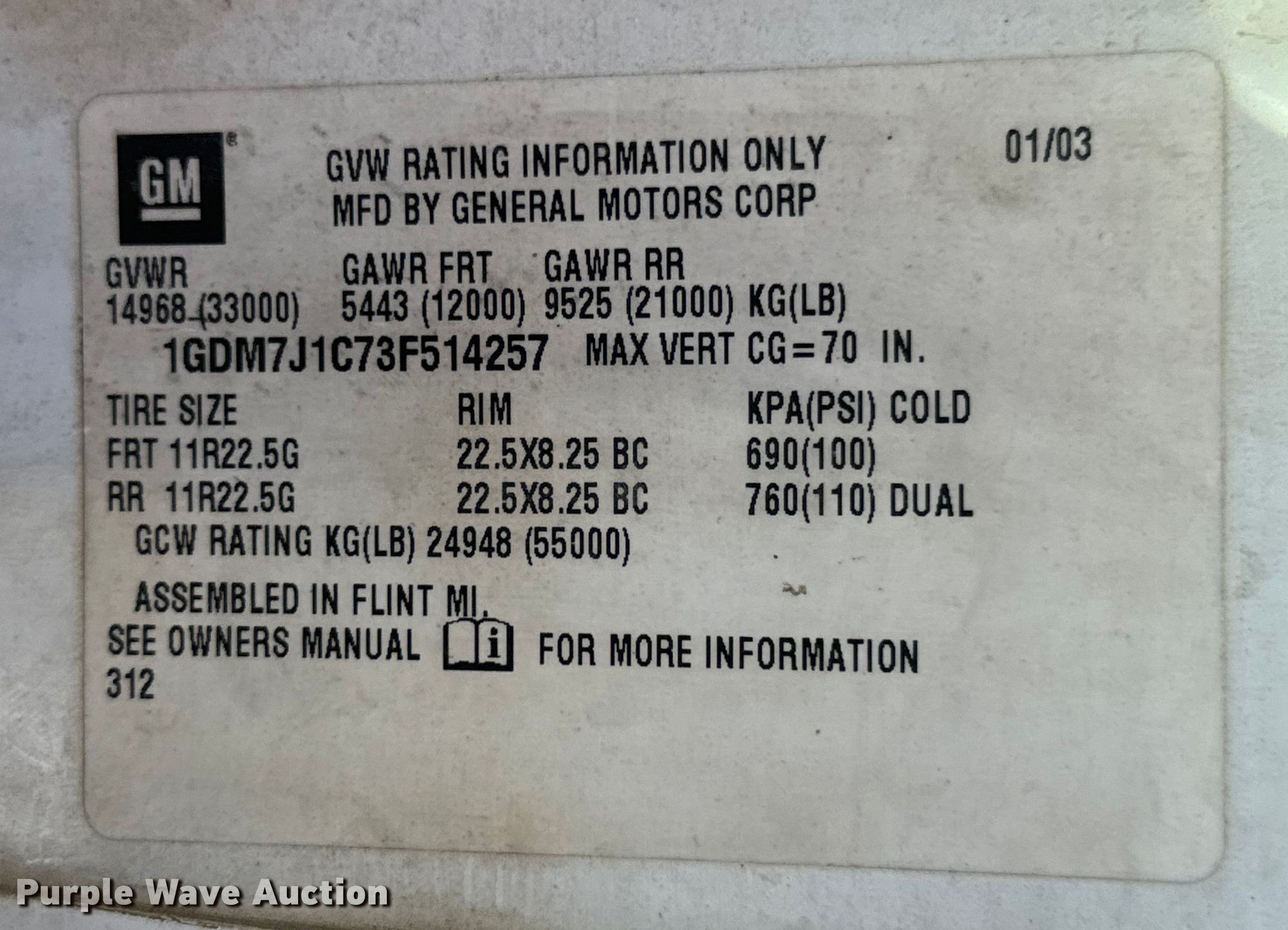 Purple Wave is selling a used Bucket Truck in Missouri. This item is a 2003 GMC C7500 bucket truck with the following: Miles: 122,112 on odometer, VIN: 1GDM7J1C73F514257