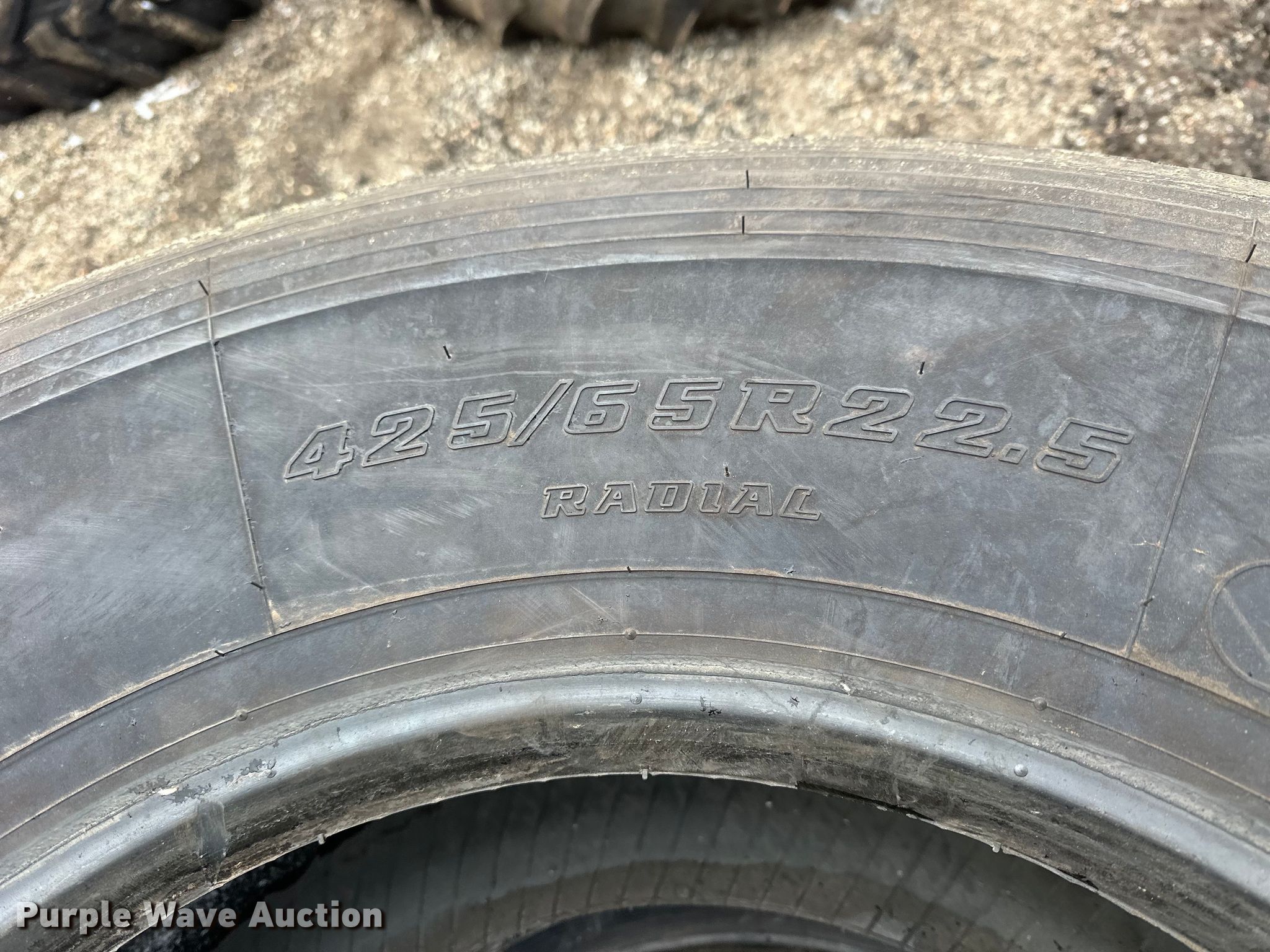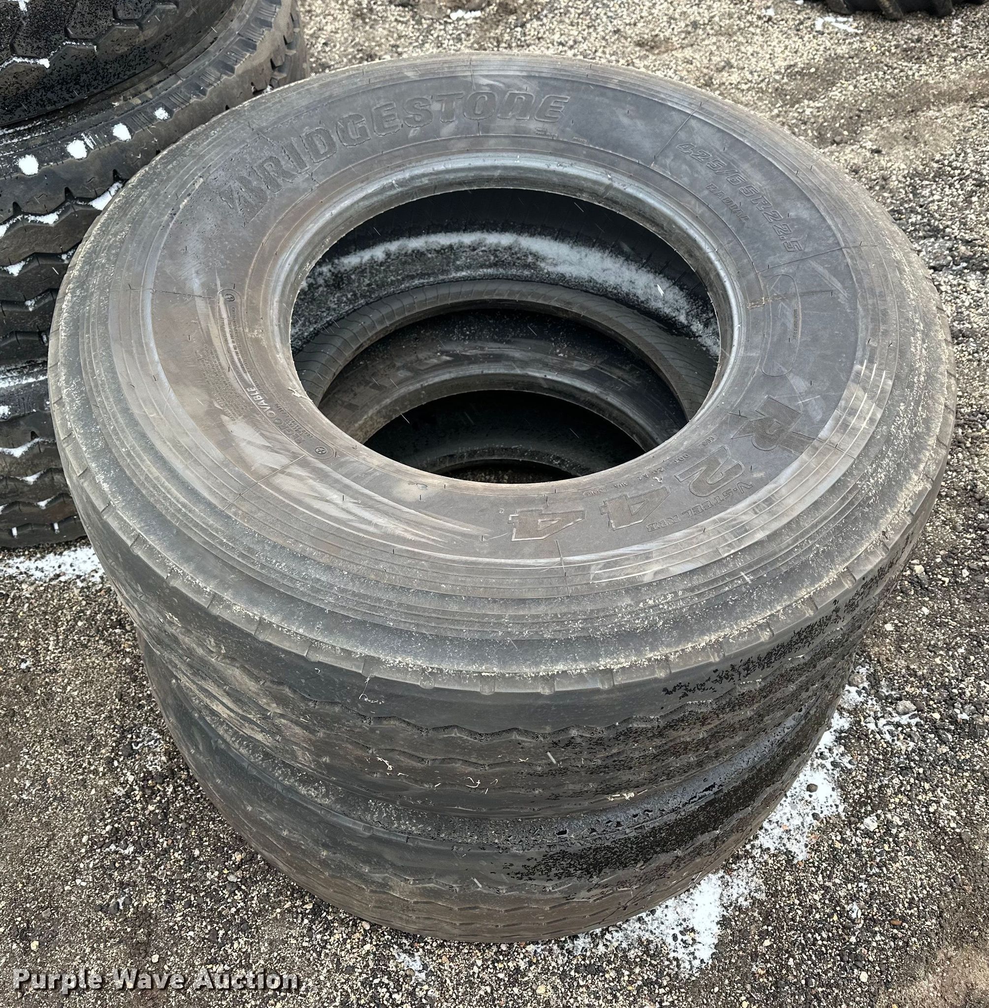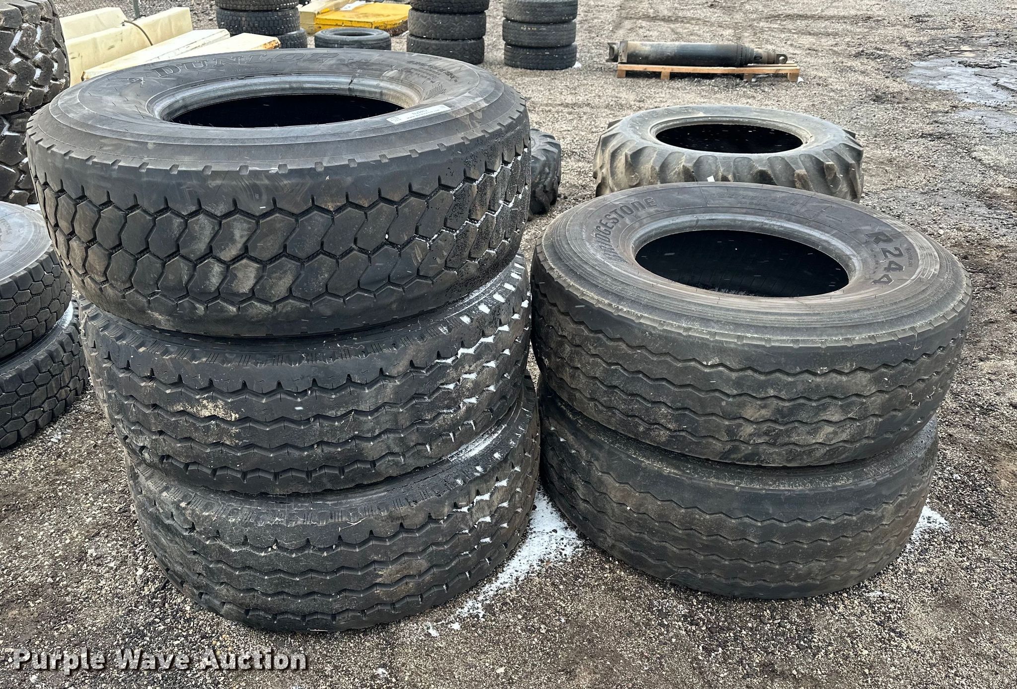 Purple Wave is selling a used Fleet Tires in Kansas. This item is a Tires with the following: (2) Bridgestone 425/65R22.5, (3) Dunlop 425/65R22.5, Goodyear 255/70R22.5, (2) Bridgestone 11R24.5