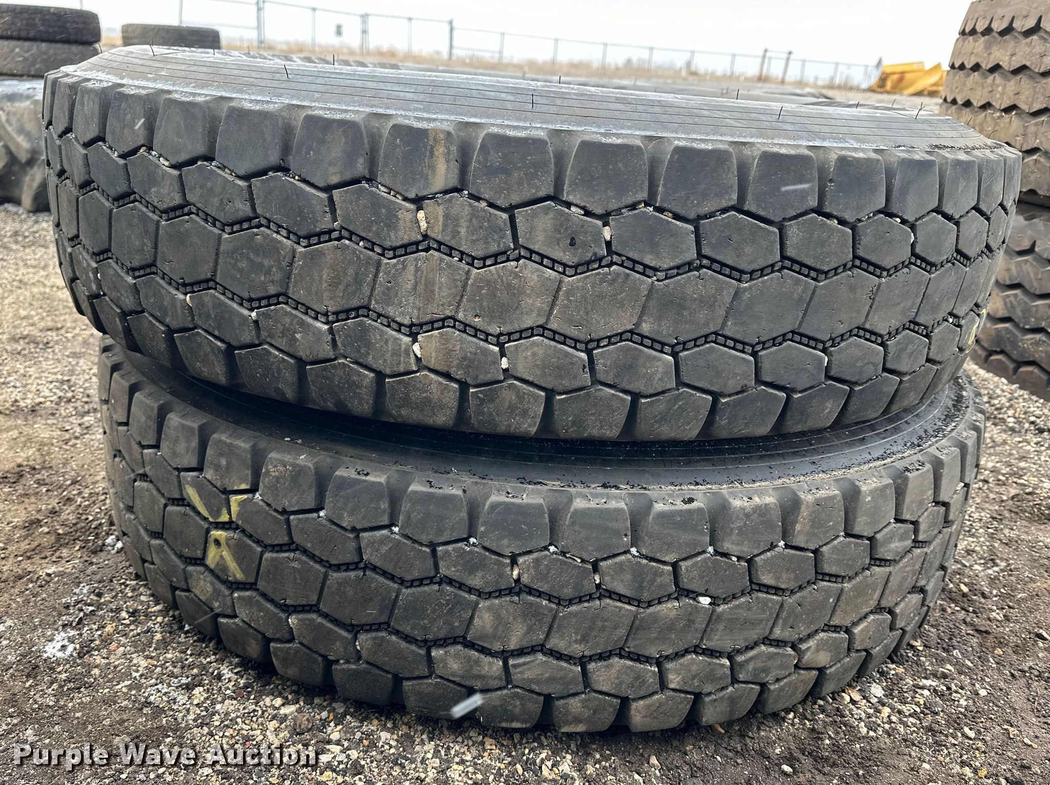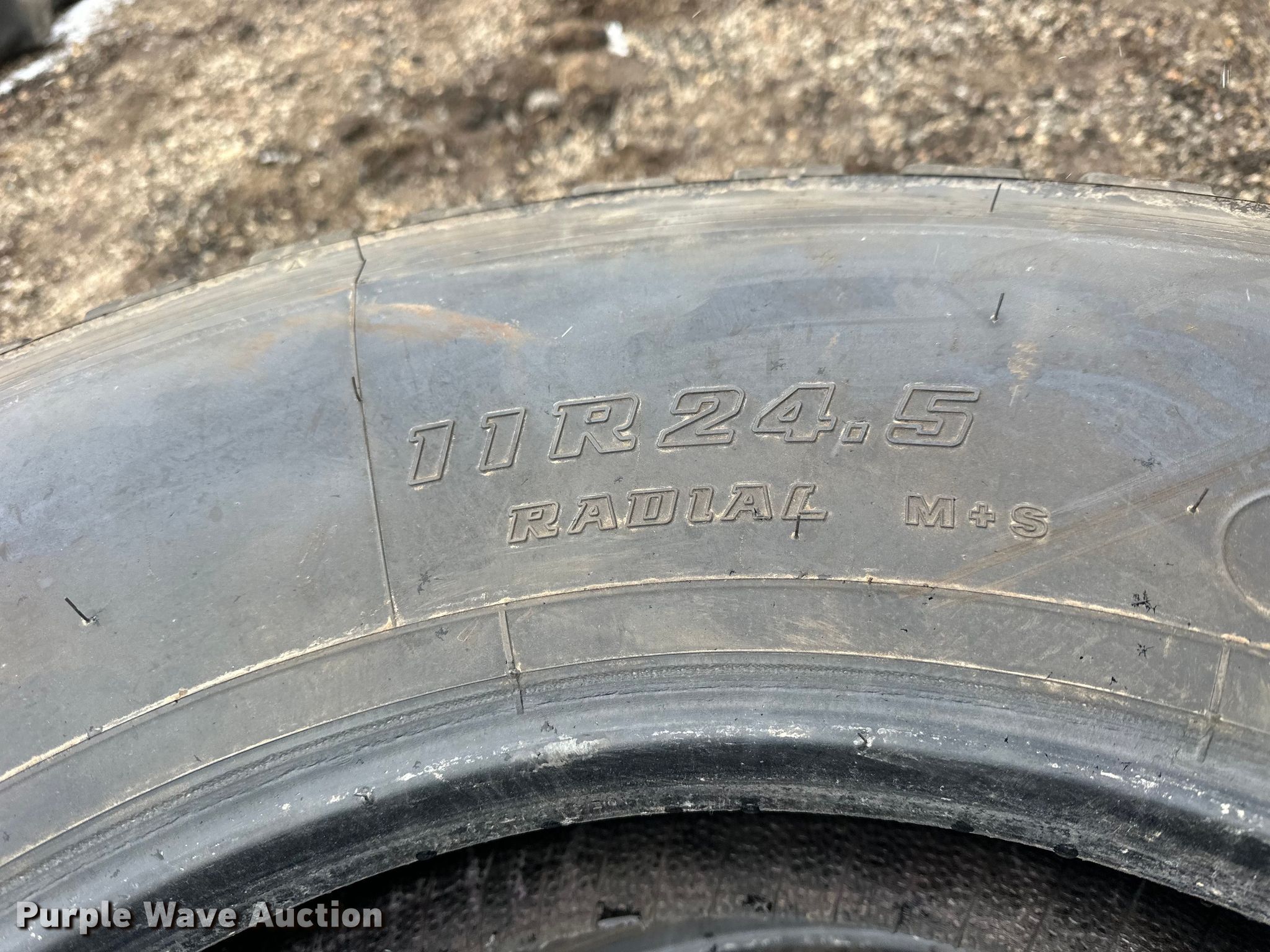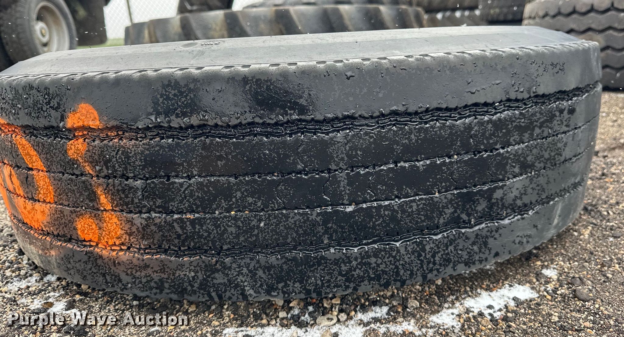 Purple Wave is selling a used Fleet Tires in Kansas. This item is a Tires with the following: (2) Bridgestone 425/65R22.5, (3) Dunlop 425/65R22.5, Goodyear 255/70R22.5, (2) Bridgestone 11R24.5