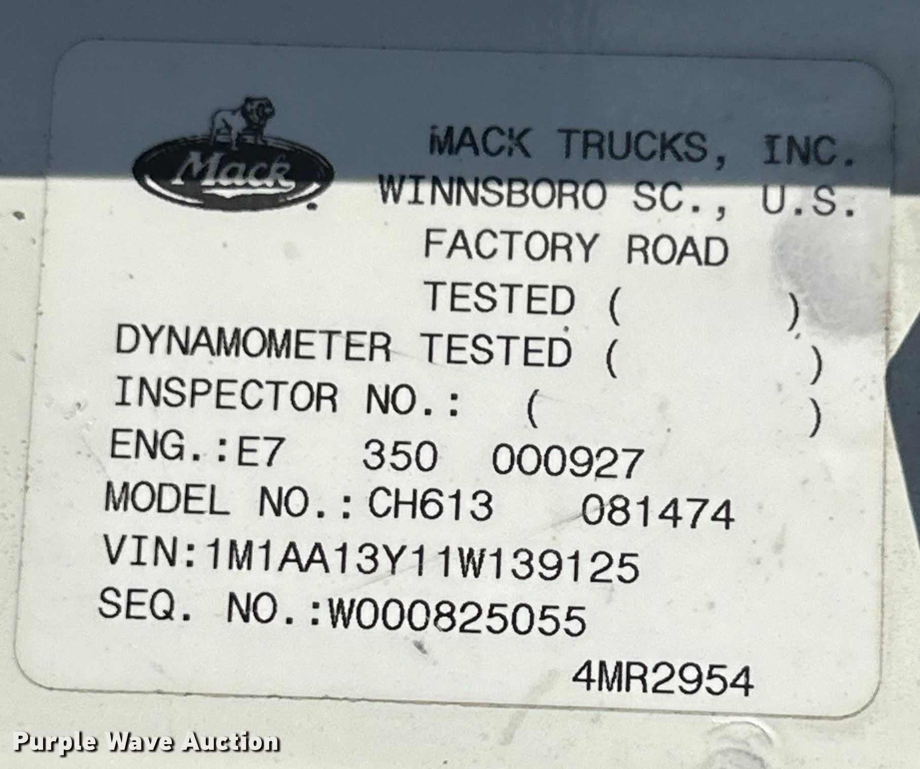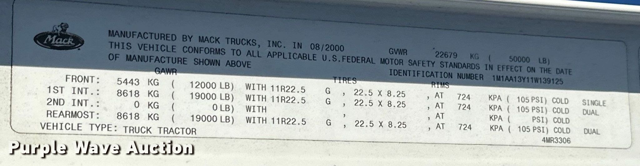2001 Mack CH613 semi truck. Miles: 509,736 on odometer, Hours: 18,827 on meter, VIN: 1M1AA13Y11W139125. Engine Mack, Displacement: 12.0L, Cylinders: 6, Fuel type: Diesel. Transmission Eaton Fuller, Manual, Speed: 10. Chassis Axles: Tandem, Suspension: Air Dump valves, Brakes: Air, Truck chassis: 165", GVWR: 50,000 lbs FAWR: 12,000 lbs, IAWR: 19,000 lbs, RAWR: 19,000 lbs. Interior AC, Heat, Heated mirrors, Cruise control. Features Deck plate: Aluminum, Fifth wheel type: Sliding, Fuel tank: Dual. Tires Size: 11R22.5. Notes Windshield chipped or cracked, Dead battery. Kansas title. Title distribution may be delayed up to 14 days from verification of funds. Phillips County Road and Bridge. 1566 Hwy 183. Phillipsburg, KS 67661