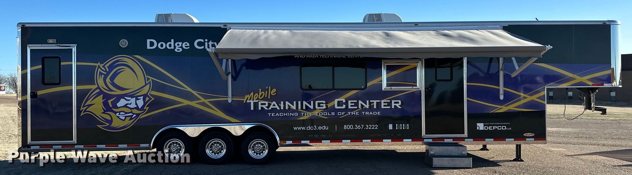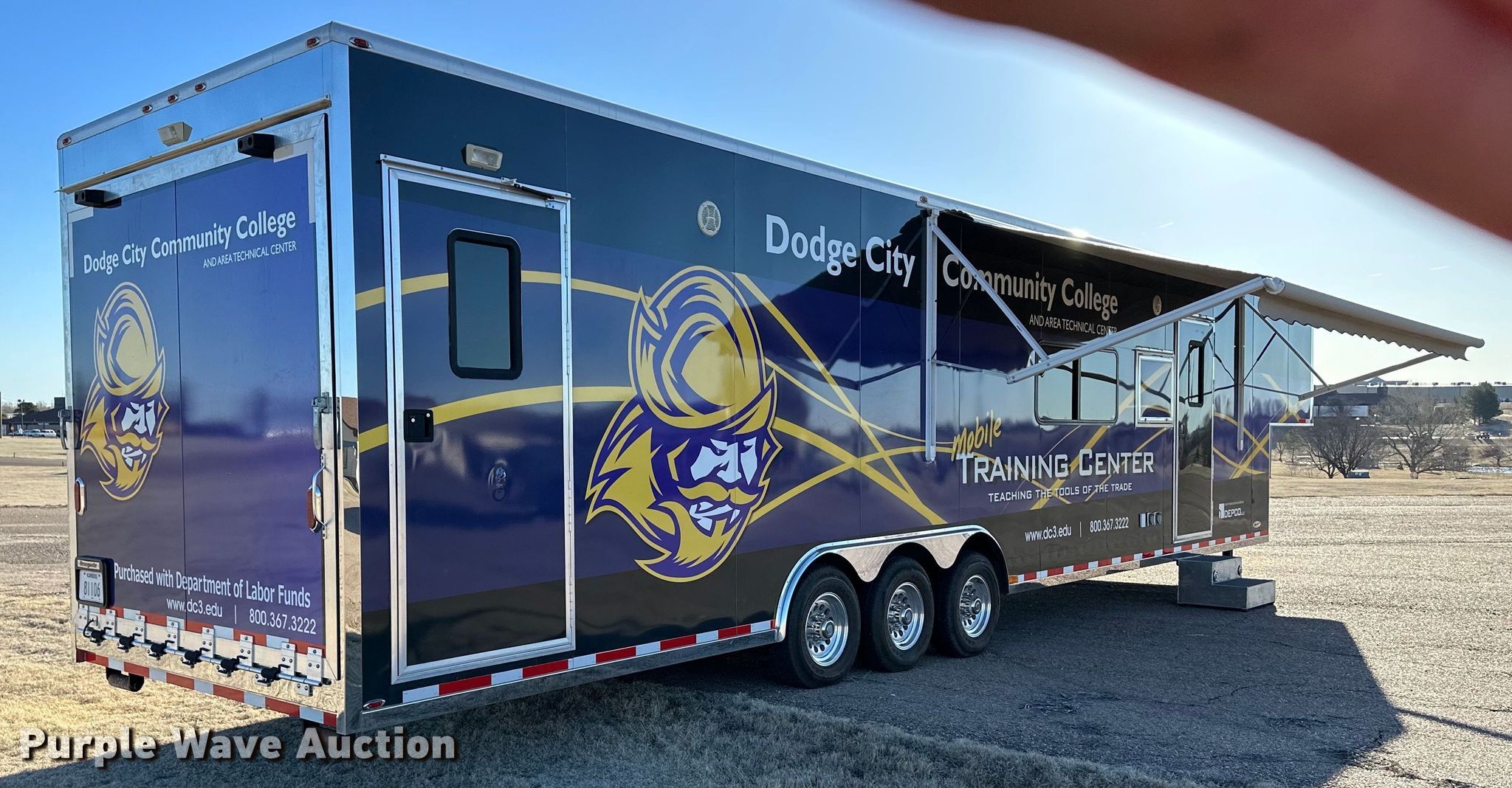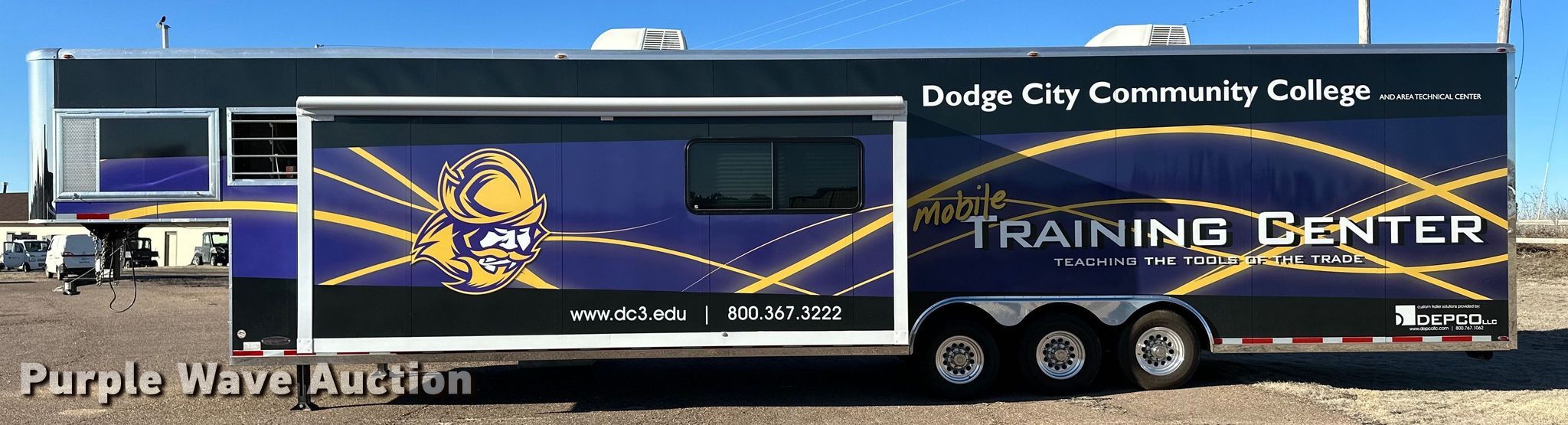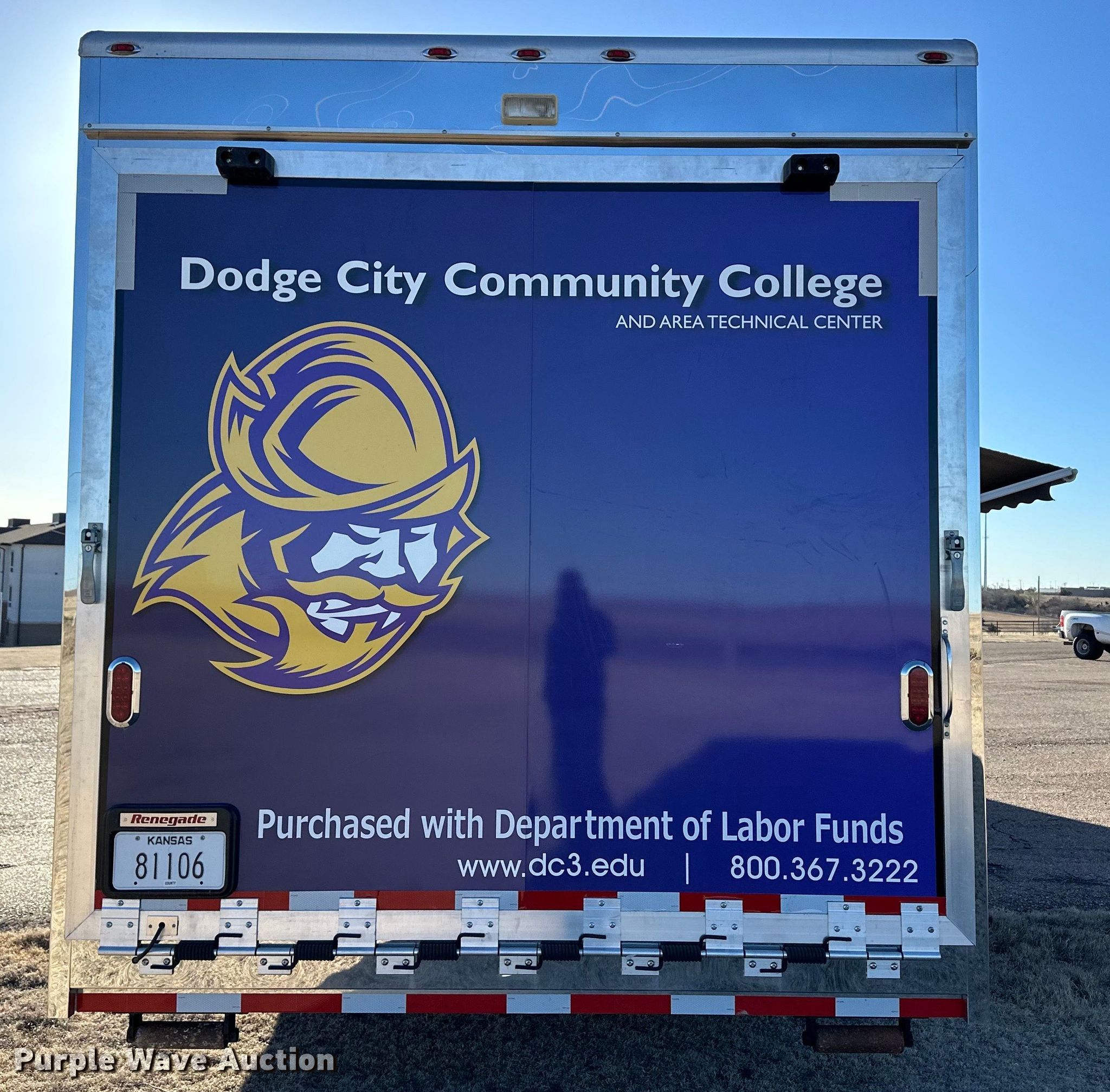2013 Renegade training module enclosed cargo trailer. VIN: 1K9500V36D1160061. Dimensions Overall: 44' L x 102" W, Body: 38' L x 102" W, Rear door / ramp 90" L x 96" W. Chassis Hitch: Gooseneck, Landing gear: Dual, Suspension: Spring, Brakes: Electric, Axles: Triple. Features AC units: 2, Slide outs: 1, Awnings: 1 Awning type: Electric, Generator MagnaPlus 282PSL1705, Kubota engine, Fuel type: diesel, kW: 20, Volts: 240, Amps: 60, Phase: Three. Tires Aluminum wheels, Size: 235/80R16. Kansas title. Title distribution may be delayed up to 14 days from verification of funds. Dodge City Community College. 2501 N 14th Ave. Dodge City, KS 67801