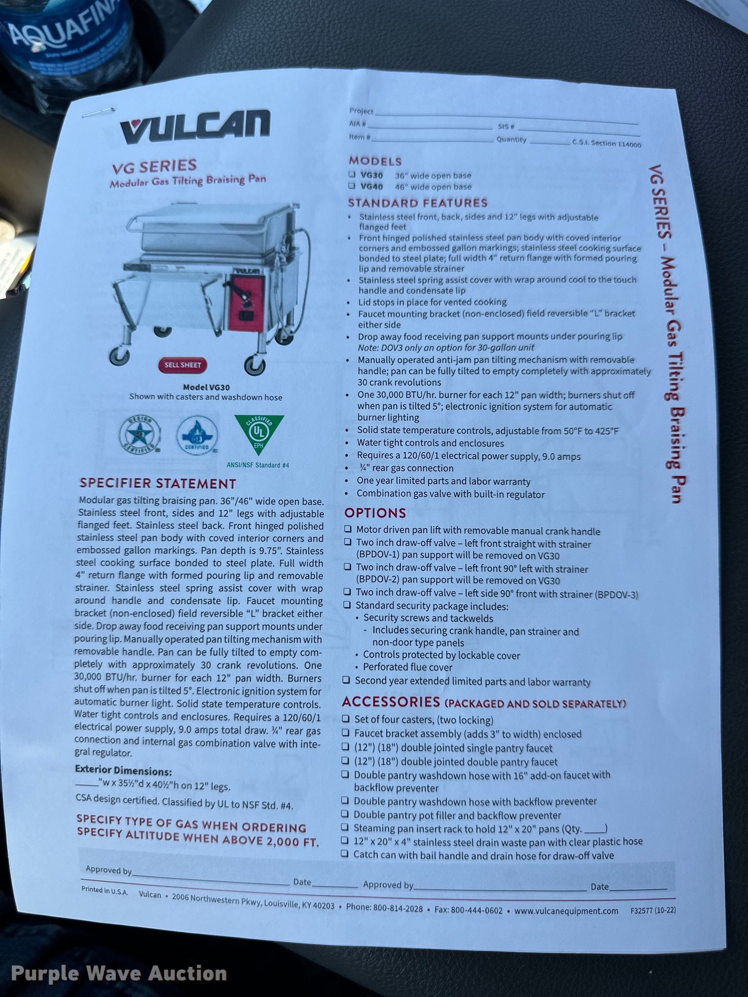 Purple Wave is selling a used Restaurant Equip. in Kansas. This item is a Vulcan braising pan with the following: Unused