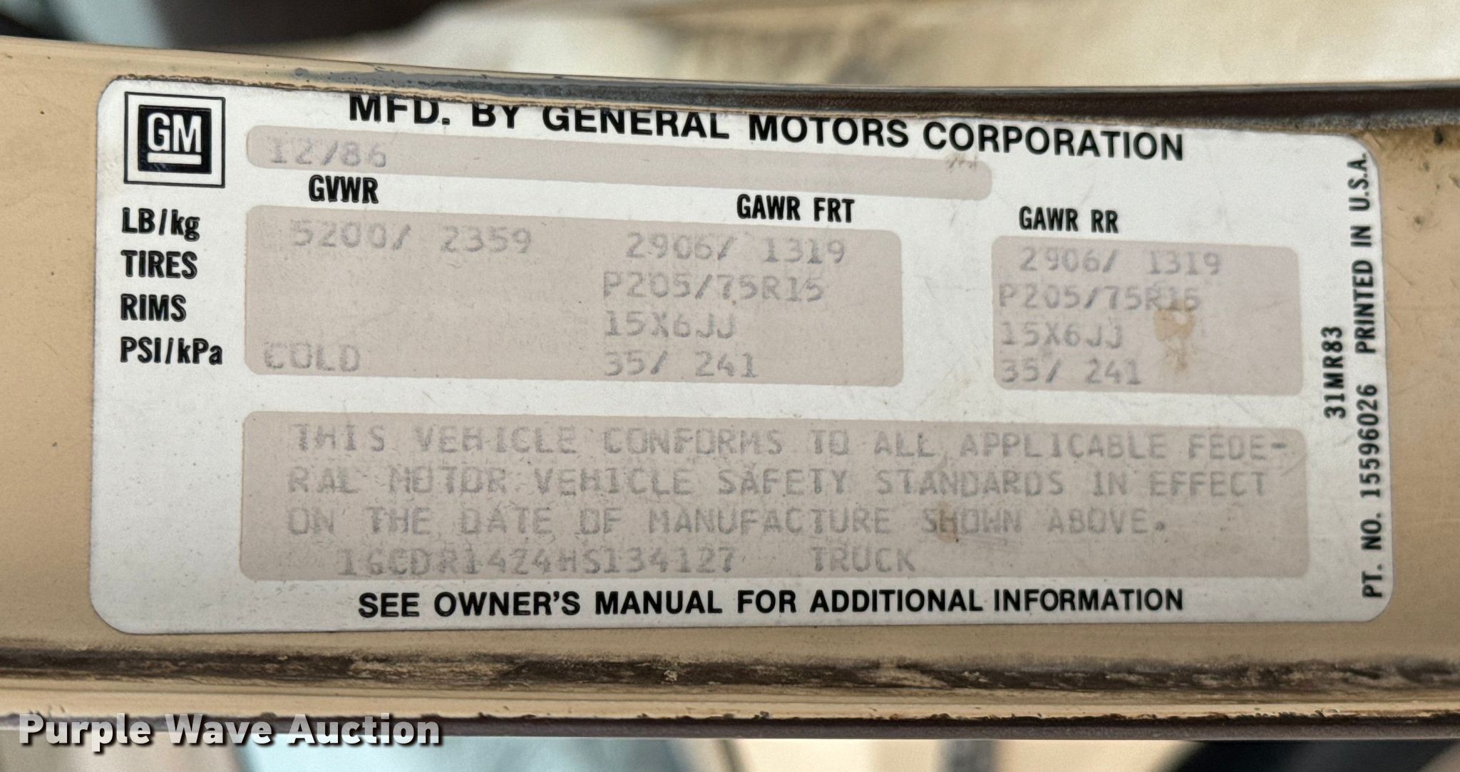 1987 Chevrolet C10 pickup truck. Miles: 61,618 on odometer, VIN: 1GCDR14Z4HS134127. Engine Displacement: 4.3L V6, Cylinders: 6, Fuel type: Gas. Transmission Automatic. Interior AC, Heat. Tires Size: P215/75R15. Kansas title. Title distribution may be delayed up to 14 days from verification of funds. Parsons State Hospital and Training Center. Parsons, KS 67357