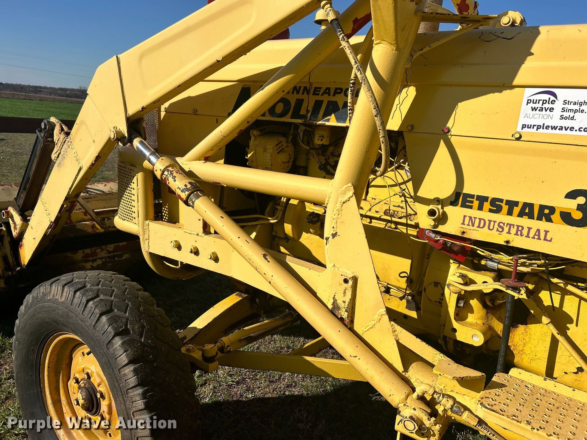 Minneapolis-Moline Jetstar 3 Industrial tractor. Serial: 28301581. Engine Moline, Cylinders: 4, Fuel type: Gas. Transmission Manual, 6F - 1R. Features PTO: 540, Three point Top link, Loader Controls: Two-lever, Bucket Width: 60".. Tires Front: 7.50-16LT, Rear: 16.9-30, Wheel weights: 5. Notes Hydraulic leak, Possible three point issue. Agra, OK 74824