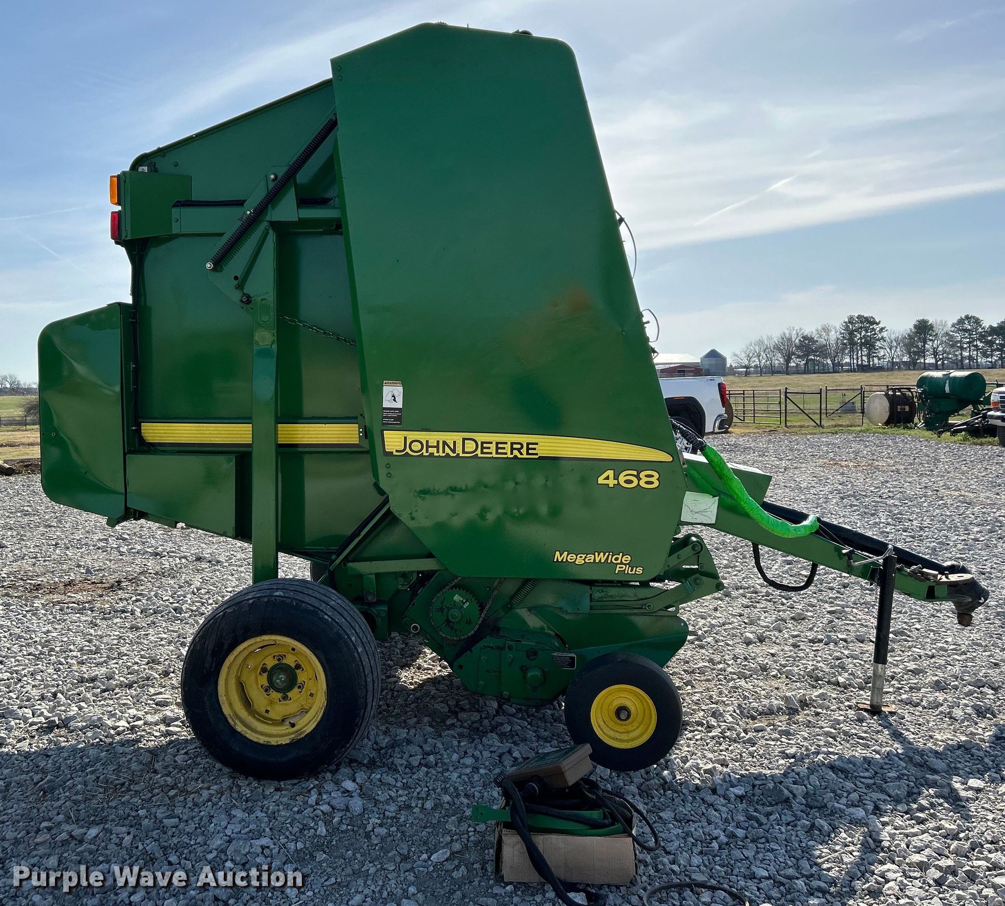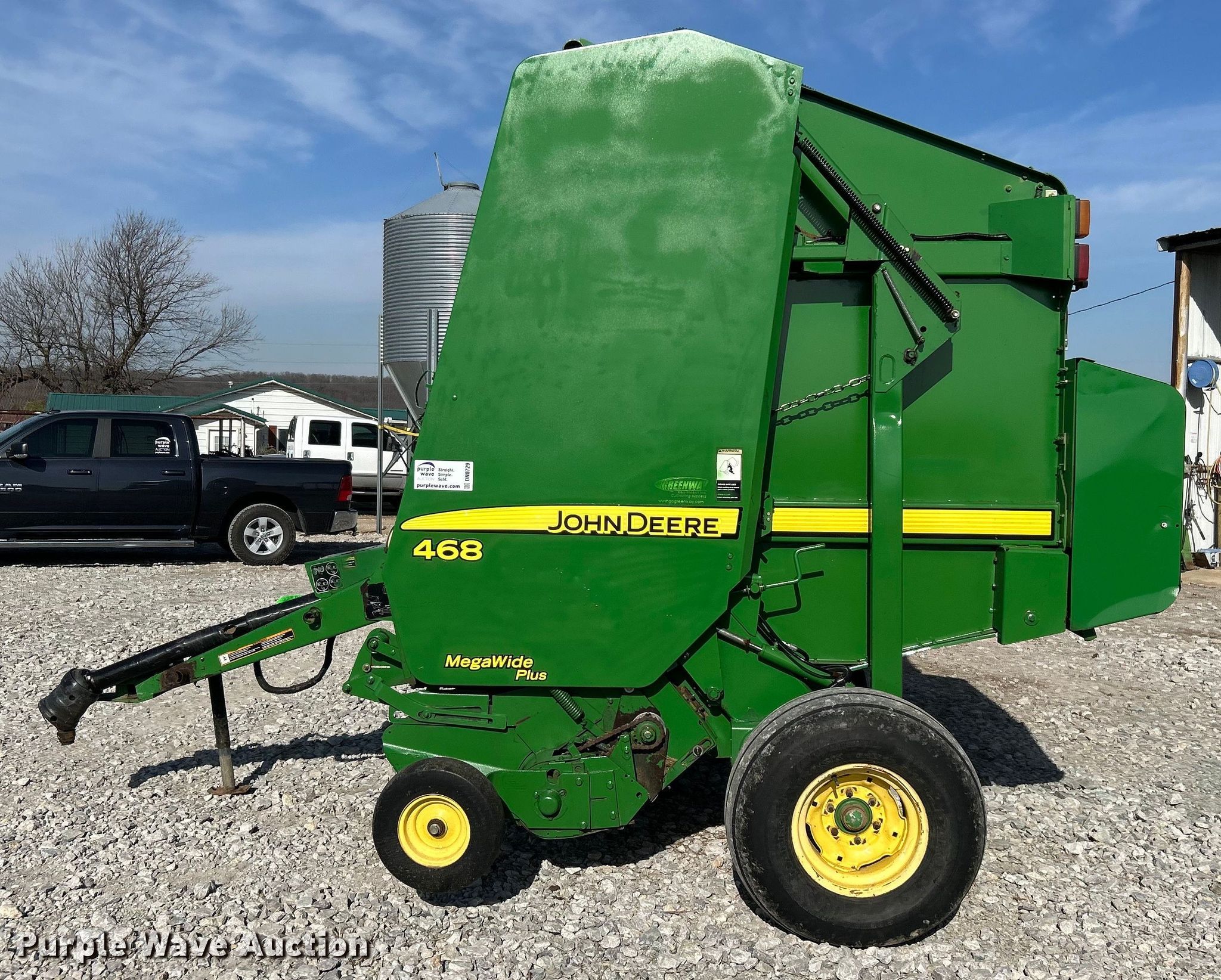 Purple Wave is selling a used Round Baler in Oklahoma. This item is a 2008 John Deere 468 round baler with the following: Bale count: 13,902, Serial: E00468X343593