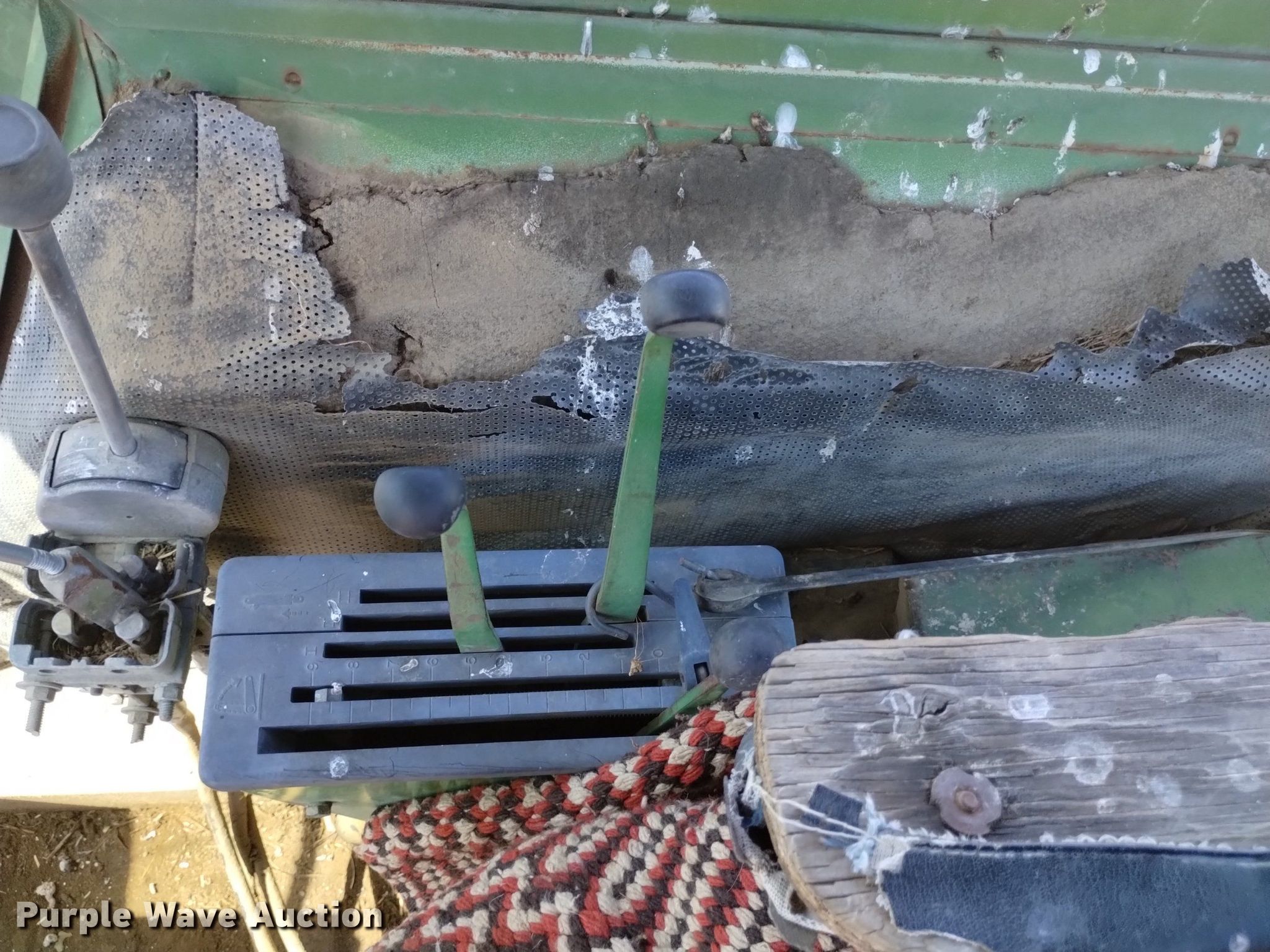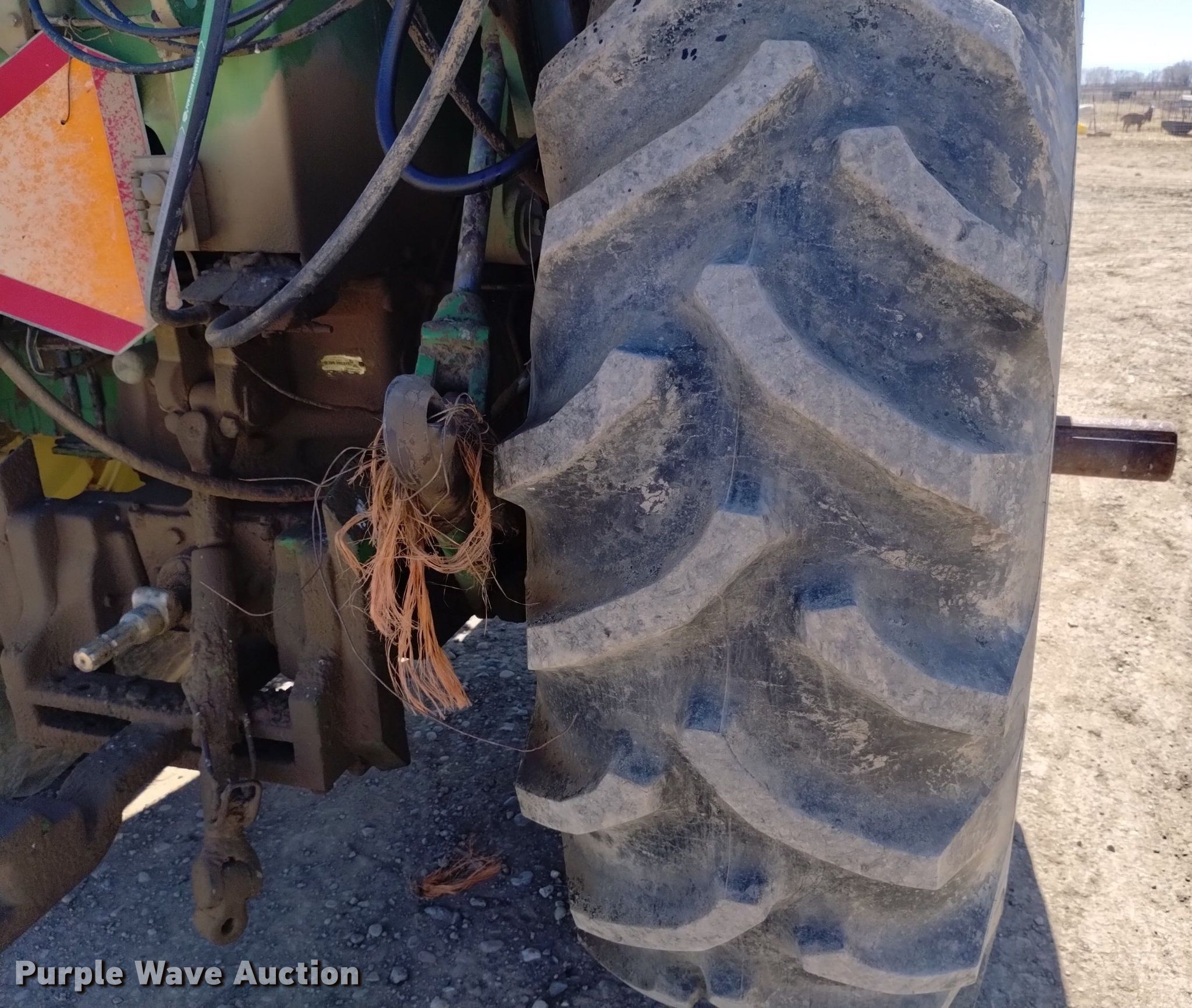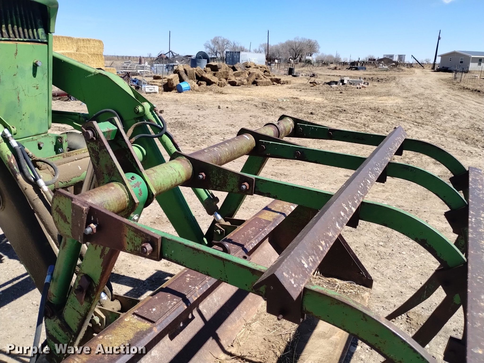 1971 John Deere 4620 tractor. Hours: 8,278 on meter, Serial: 006743R. Engine John Deere, Cylinders: 6, Fuel type: Diesel. Transmission Synchro, 8F - 2R, Differential lock. Features PTO: 1,000, Three point Top link, Hydraulic remote sets Rear: 1, Loader John Deere 158, Controls: Two-lever, Grapple bucket Width: 85".. Tires Front: 14L-16.1, Rear: 20.8-38. Notes 540 PTO adapter, Glass missing, Grapple lever issues, needs adjustment. Ordway, CO 81063