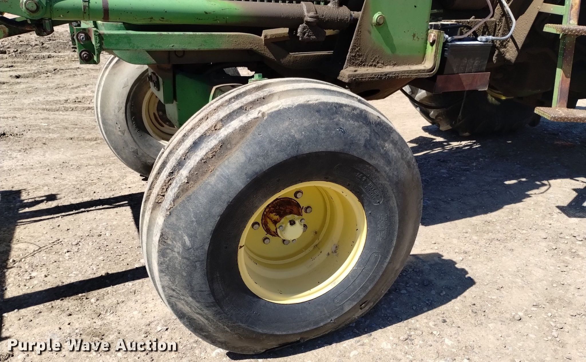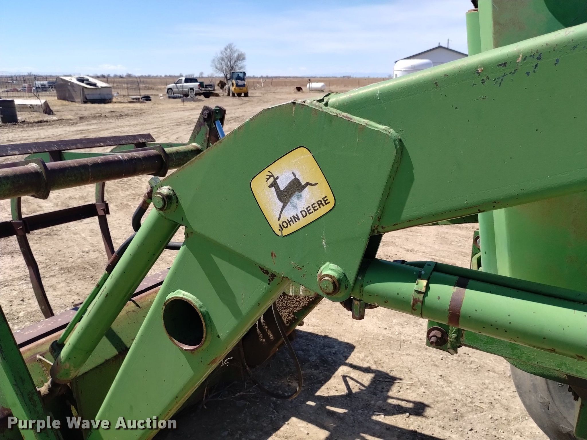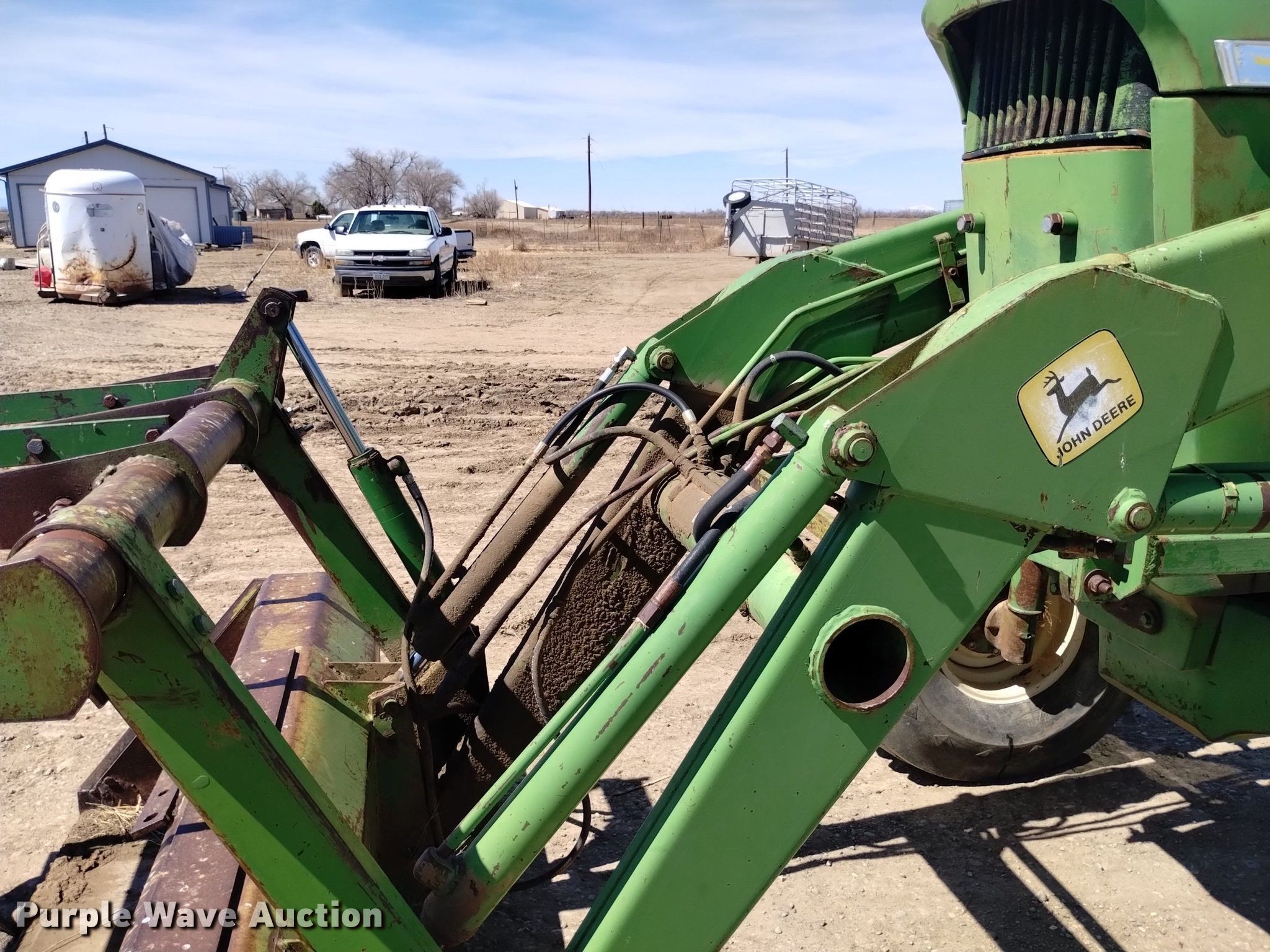 1971 John Deere 4620 tractor. Hours: 8,278 on meter, Serial: 006743R. Engine John Deere, Cylinders: 6, Fuel type: Diesel. Transmission Synchro, 8F - 2R, Differential lock. Features PTO: 1,000, Three point Top link, Hydraulic remote sets Rear: 1, Loader John Deere 158, Controls: Two-lever, Grapple bucket Width: 85".. Tires Front: 14L-16.1, Rear: 20.8-38. Notes 540 PTO adapter, Glass missing, Grapple lever issues, needs adjustment. Ordway, CO 81063