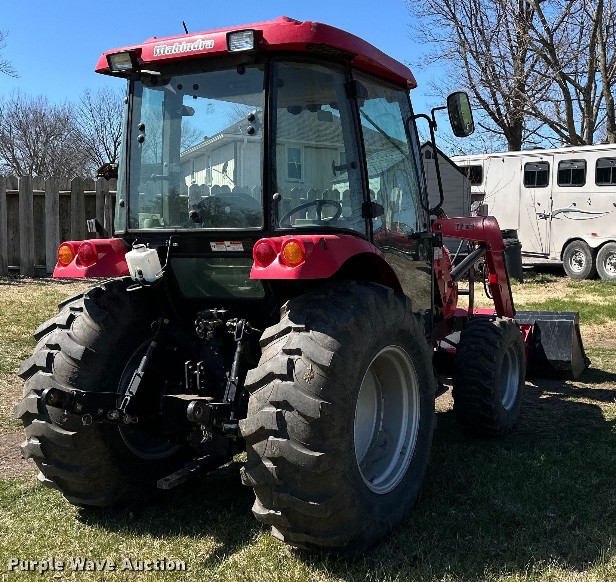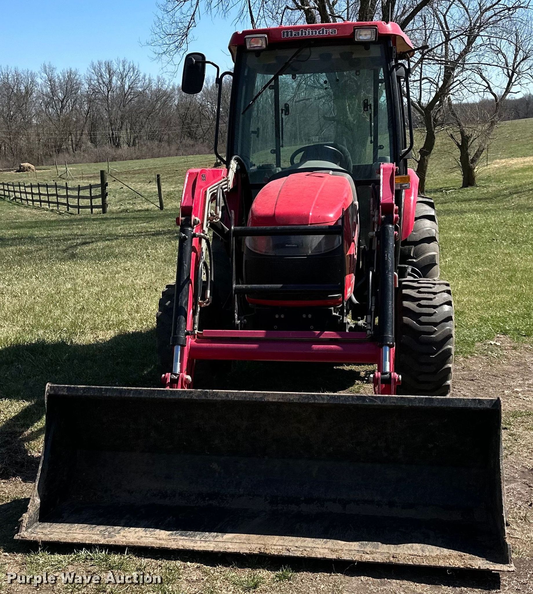 2011 Mahindra 5010 HST MFWD tractor. Hours: 455 on meter, Serial: 50HCE0800370. Engine Cylinders: 4, Fuel type: Diesel. Transmission Hydrostatic, Differential lock. Operators station AC, Heat. Features PTO: 540, Three point, Rear: 2, Loader Mahindra 155, Quick attach, Controls: Joystick, Bucket Width: 72".. Tires Front: 12x16.5, Rear: 16.9-24. Notes Bucket tilt cylinder linkage damaged, Door glass missing. Gower , MO 64454