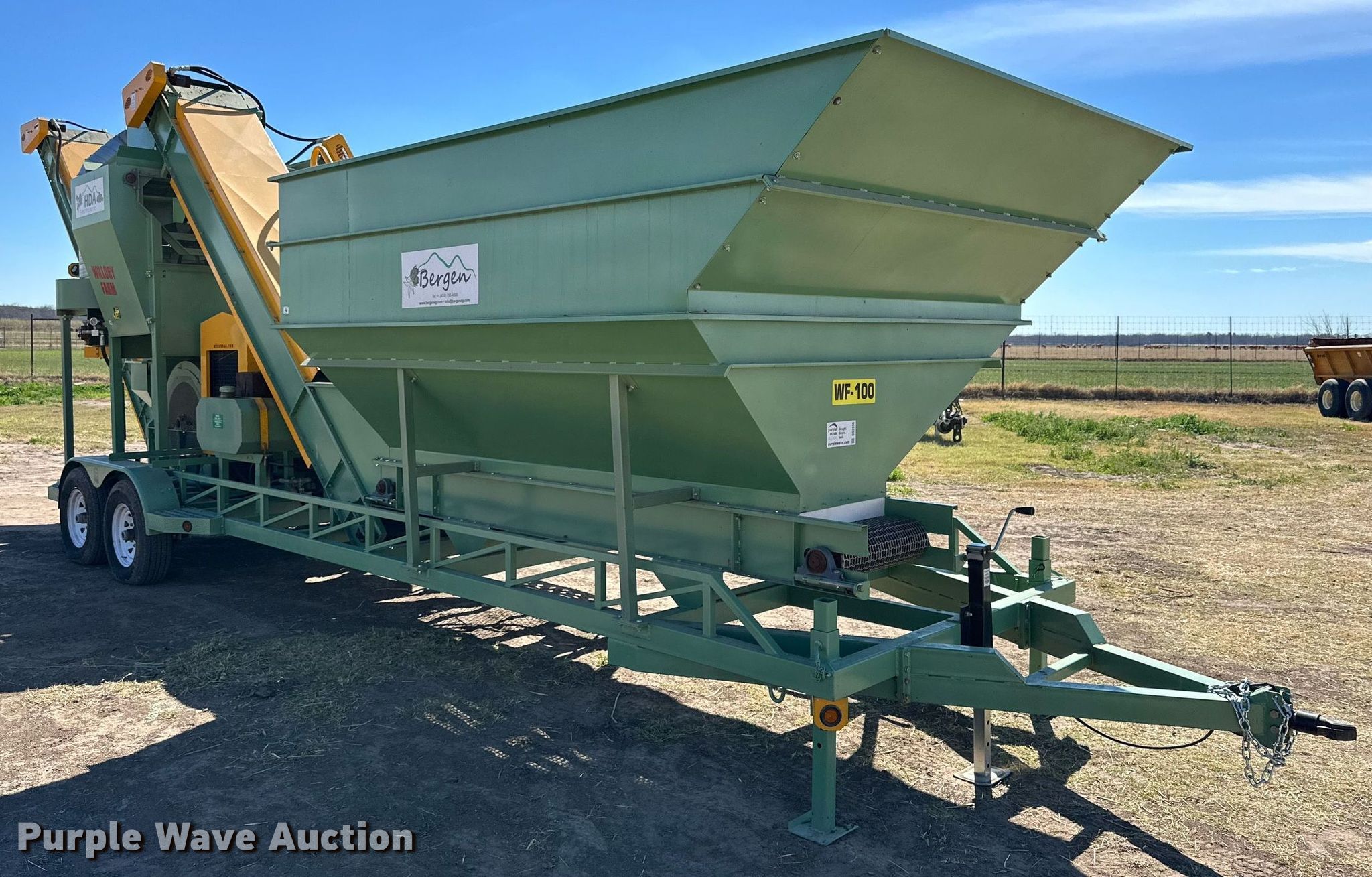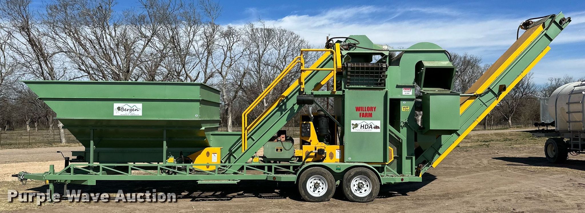 Bergen PC-CH24-HDAA pecan cleaner. Hours: 14, Serial: 220011. Dimensions Hopper: 12� x 8�, Hopper conveyor: 10� x 24�, Input conveyor: 14� 6" x 24�, Discharge conveyor: 13� x 24�, Screen: 4� x 3.5�, Blower discharge chute: 24�, Blower fan: 3'. Engine John Deere, Cylinders: 4, Fuel type: Diesel. Chassis Ball hitch: 2�, Landing gear: Single, Stabilizers: 2. Tires Size: 235/80R16. 338 Willory Farm Road LLC. 338 Willory Farm RD. Quemado, TX 78877