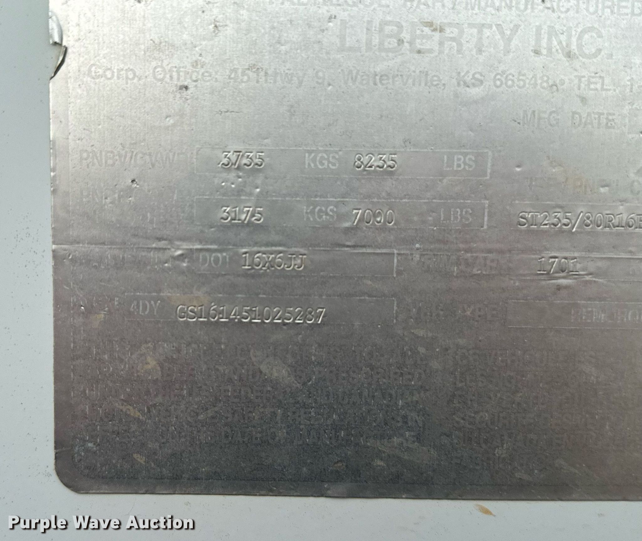 2005 Liberty livestock trailer. VIN: 4DYGS161451025287. Dimensions Overall: 23' L x 84" W, Body length: 16'. Features Center gates: 1, Ground load. Chassis Hitch: Gooseneck, Landing gear: Single, Suspension: Spring, Brakes: Electric, GVWR: 8,235 lbs. Tires Size: 235/85R16. Transfer of ownership documentation will be a bill of sale. C & C Contracting Services, Inc.. 90 OK-110. Davis, OK 73030