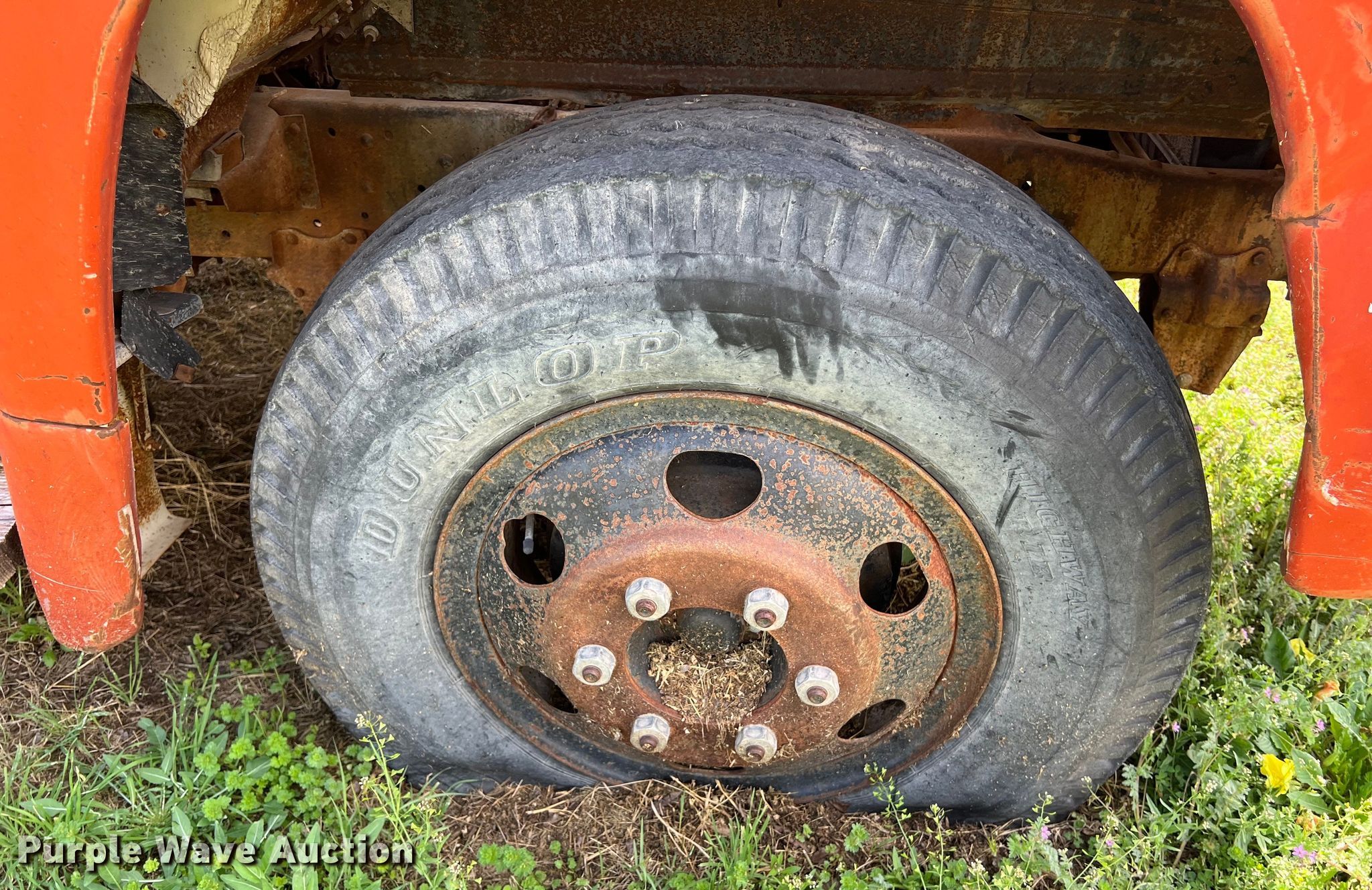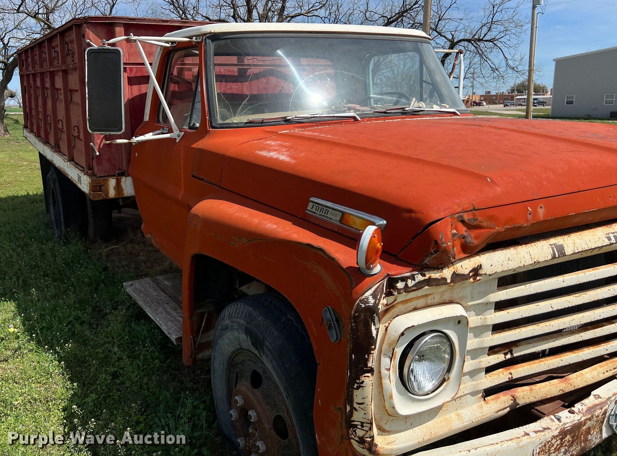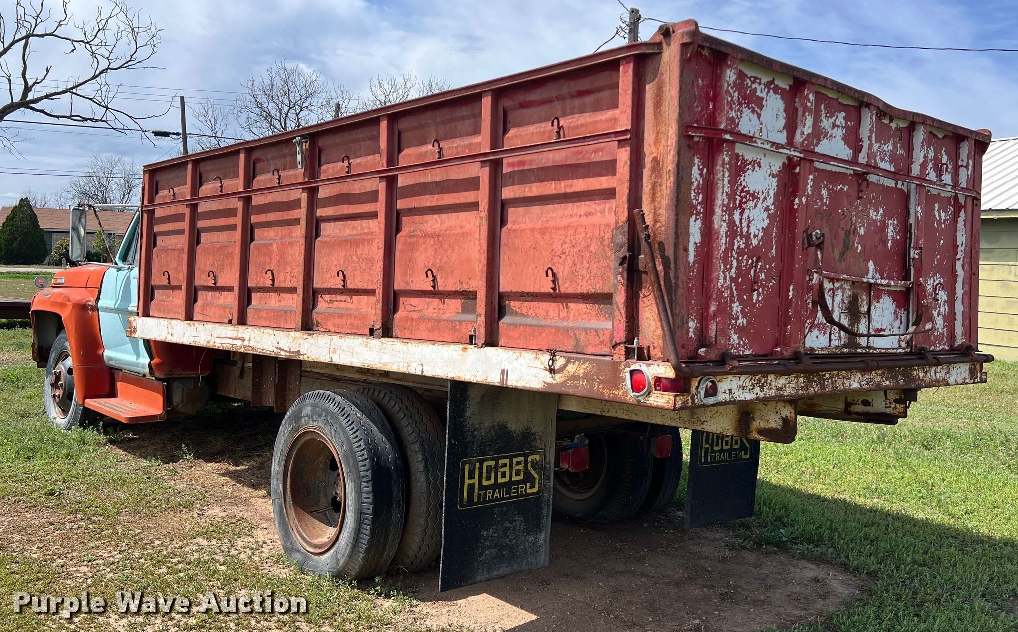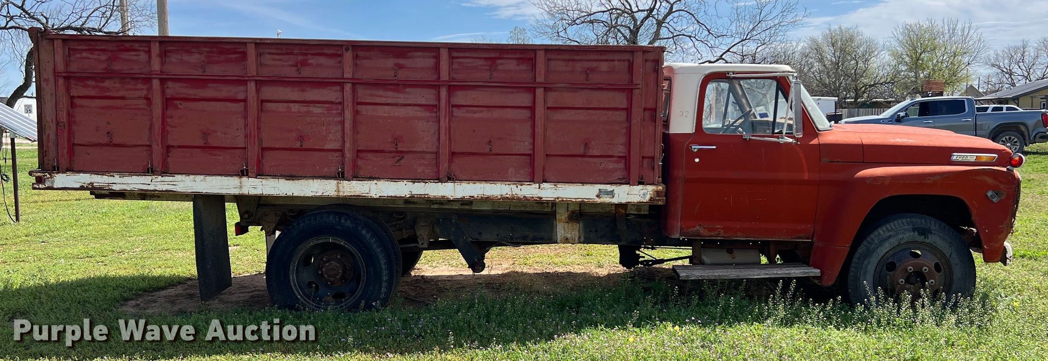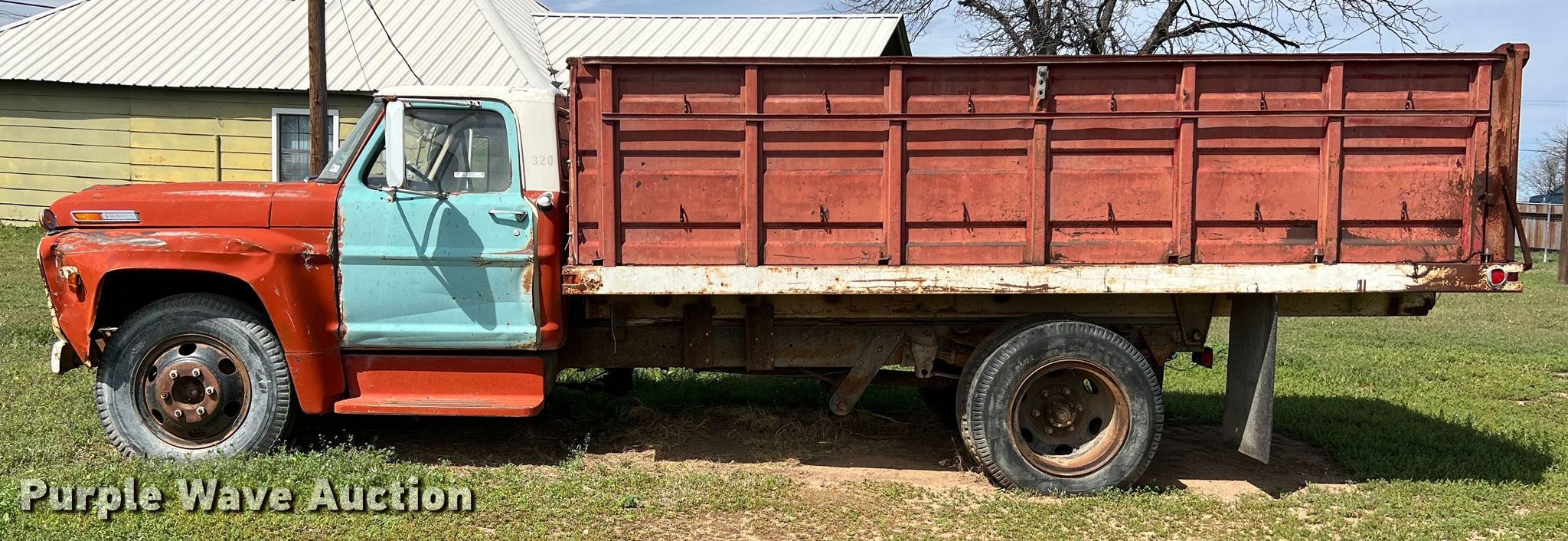 1968 Ford F600 grain truck. Miles: 59,205 on odometer, VIN: F60CKC75260. Engine Cylinders: 8, Fuel type: Gas. Transmission Manual, Speed: 5. Chassis Axles: Single, Suspension: Spring, Brakes: Hydraulic, PTO. Interior Heat. Features Dump bed Fruehauf, 15' 6" L x 7' 10" W, Side board height: 40", Bed type: Steel, Ram: Dual, End gate: Manual. Tires Size: 9.00-20. Notes Windshield chipped or cracked, Bed contents included, Flat tires, Non-operational unit. Texas title. Title distribution may be delayed up to 14 days from verification of funds. 1400 Avenue C. Ballinger, TX 76821
