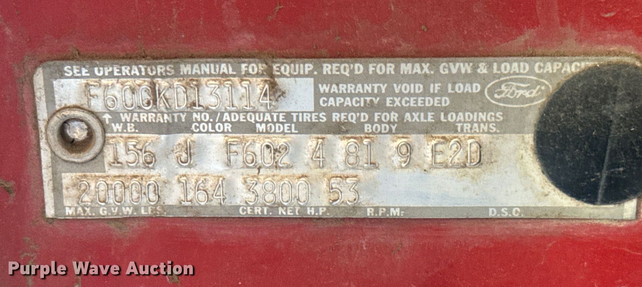 1968 Ford 600 dump flatbed truck. Miles: 48,205 on odometer, VIN: F60CKD13114. Engine Cylinders: 8, Fuel type: Gas. Transmission Manual, Speed: 5, plus 2. Chassis Axles: Single, Suspension: Spring, Brakes: Hydraulic, PTO, GVWR: 20,000 lbs. Interior Heat. Features Dump bed 13' 6" L x 94" W, Side height: 40", Bed type: Steel, Ram: Single. Tires Size: 8.25-20. Notes Unknown operating condition , Fuel system issues, needs fuel line and fuel pump. Kansas antique title. Mileage has not been verified. Exempt will be written in the odometer disclosure on the title. Ellinwood, KS 67526