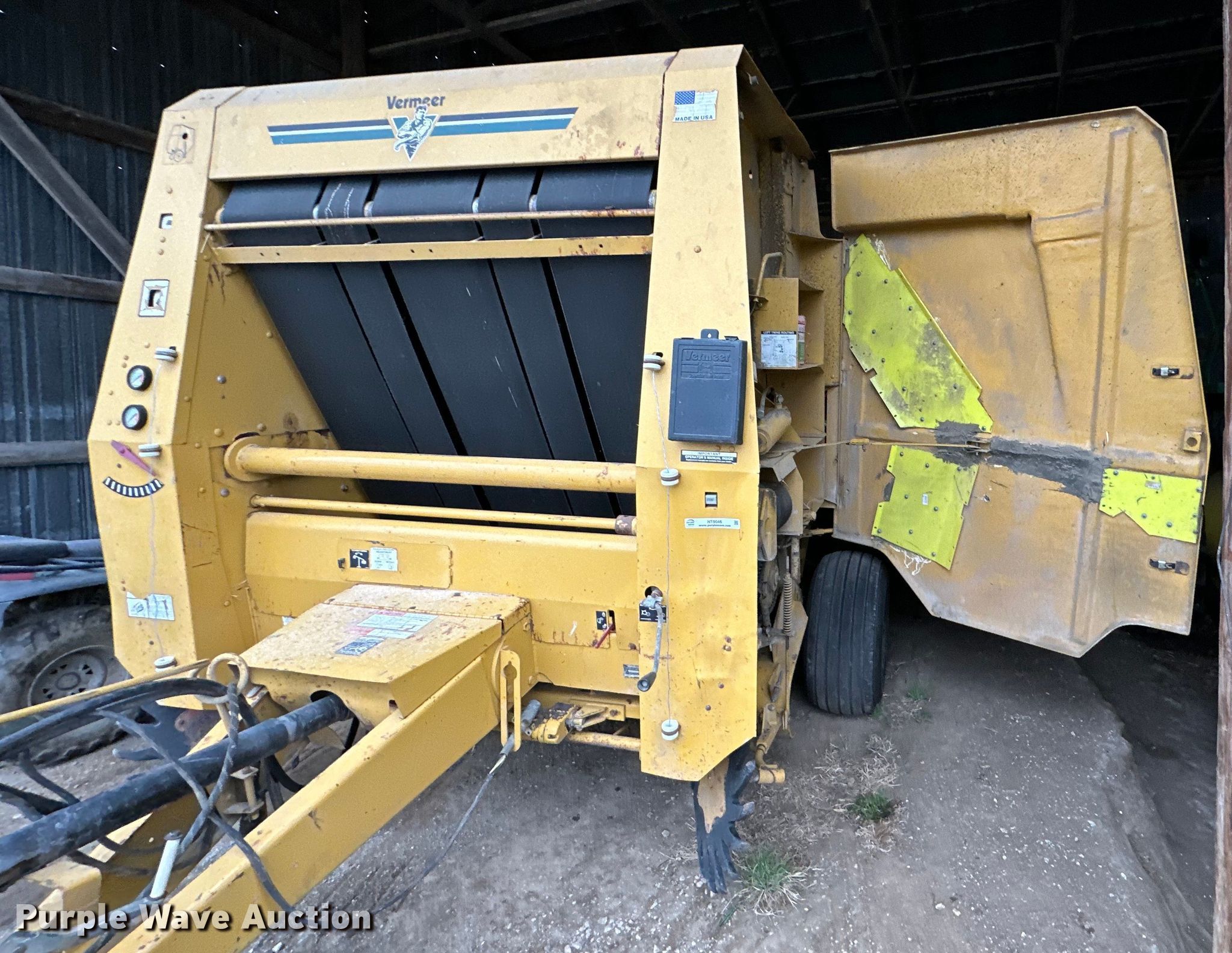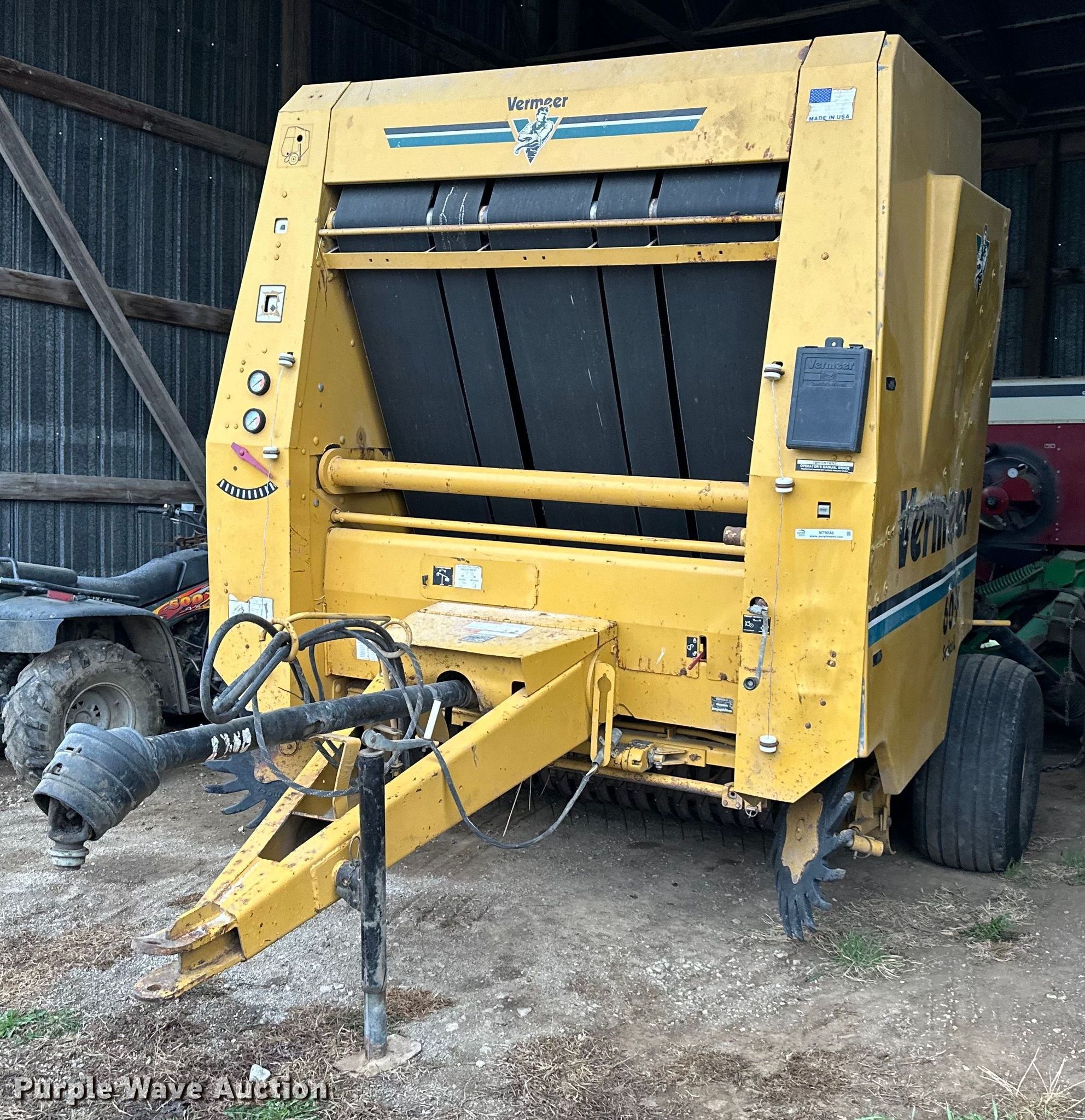 Purple Wave is selling a used Round Baler in Kansas. This item is a Vermeer 605L round baler with the following: PTO: 1000, Monitor, Vermeer, Gathering wheels, Pickup width: 60", Bale size: 5'x6', Auto-tie, Twine tie