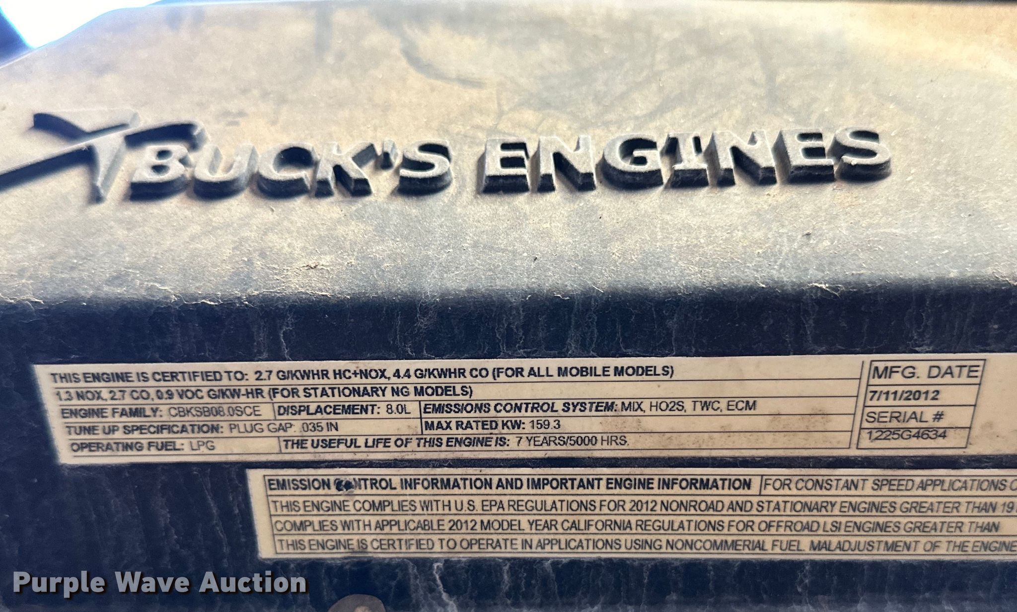 Purple Wave is selling a used Irrigation Pump in Kansas. This item is a Irrigation pump with the following: Buck's engine, Displacement: 8.0L, Cylinders: 8, Fuel type: LPG