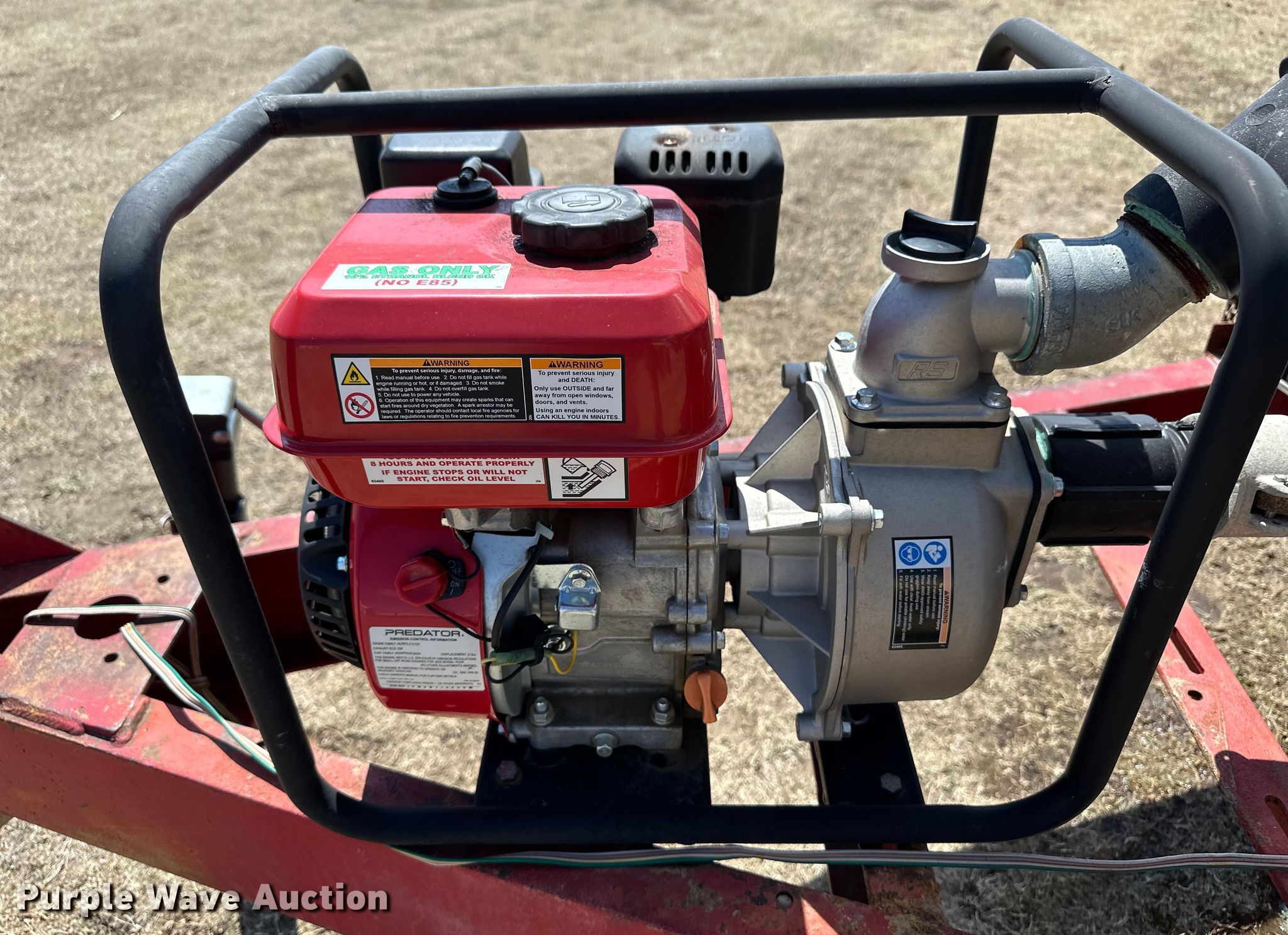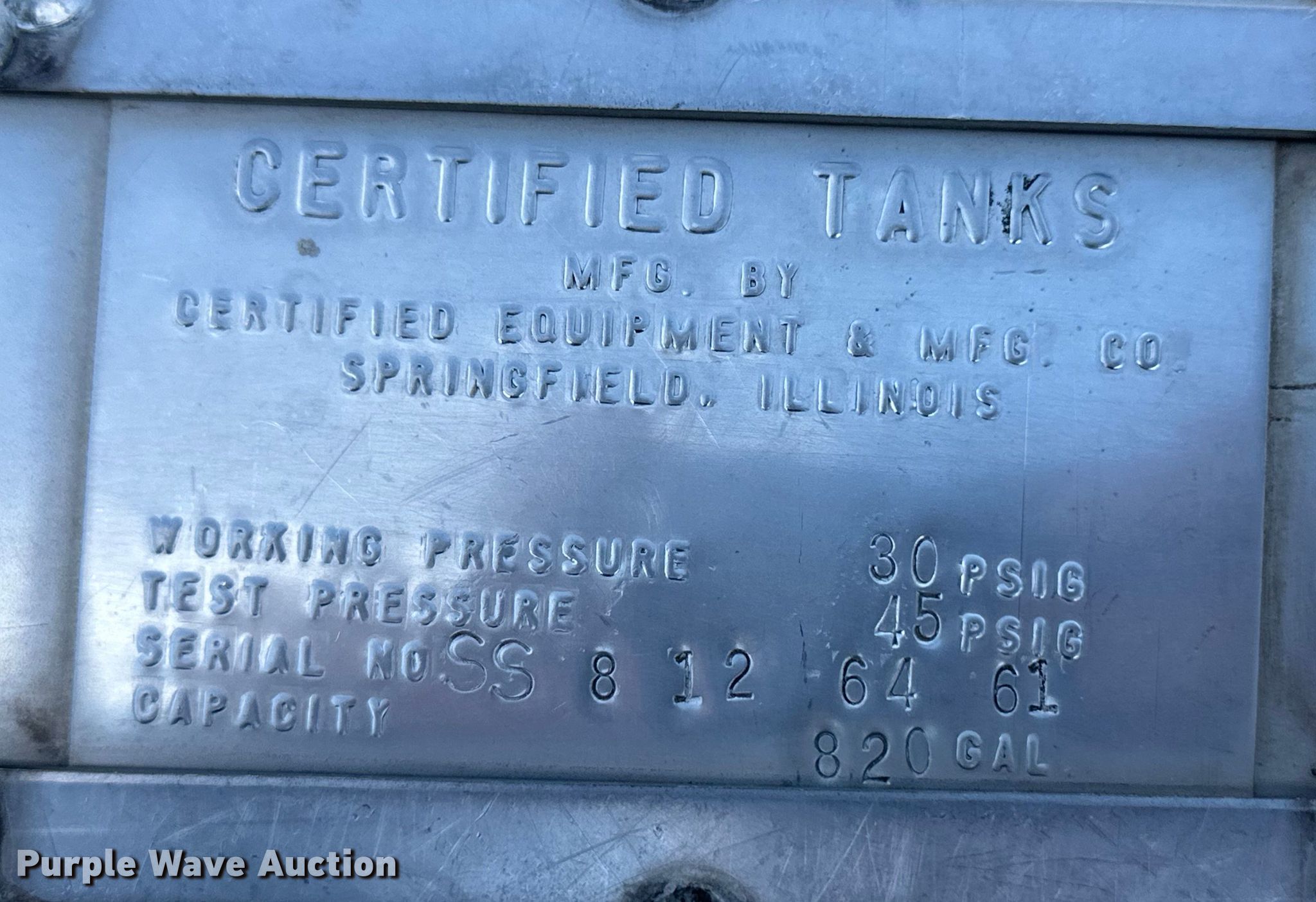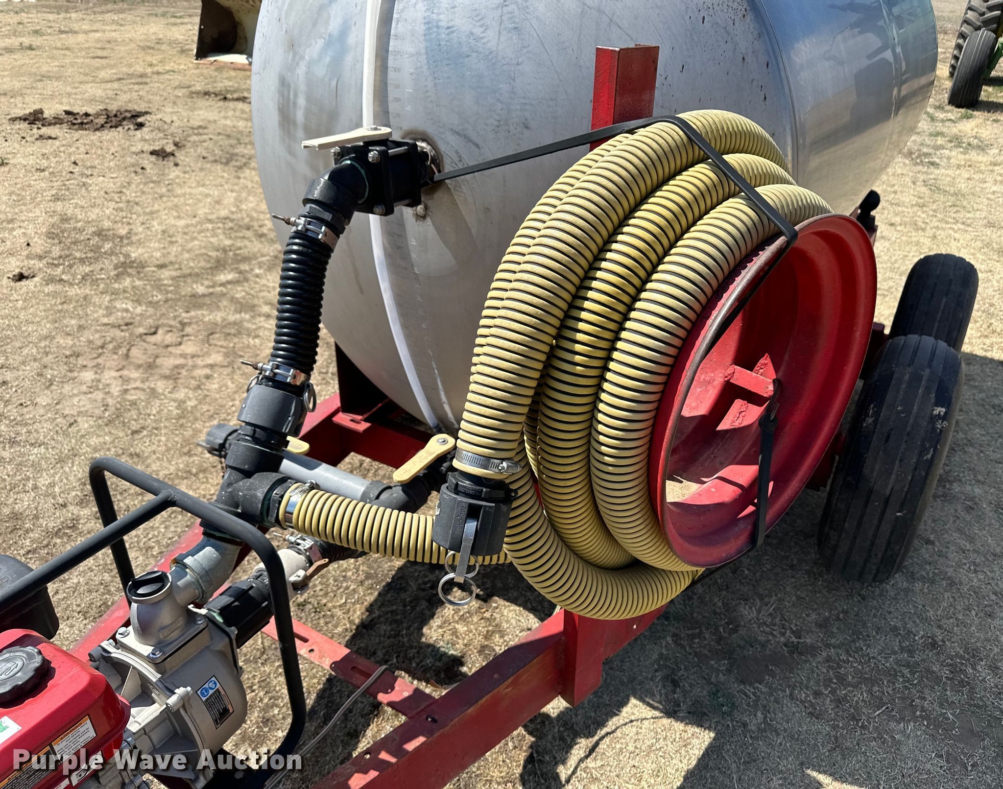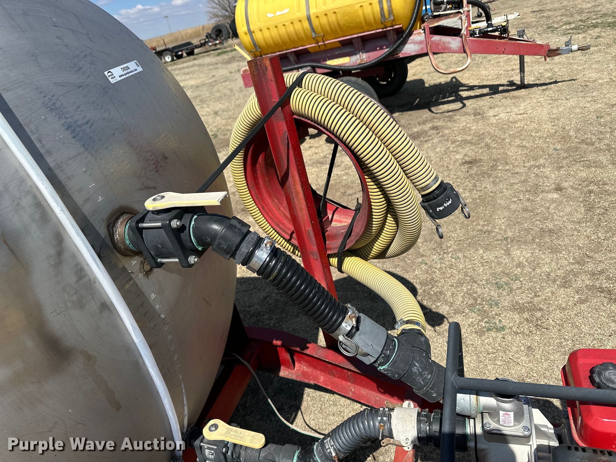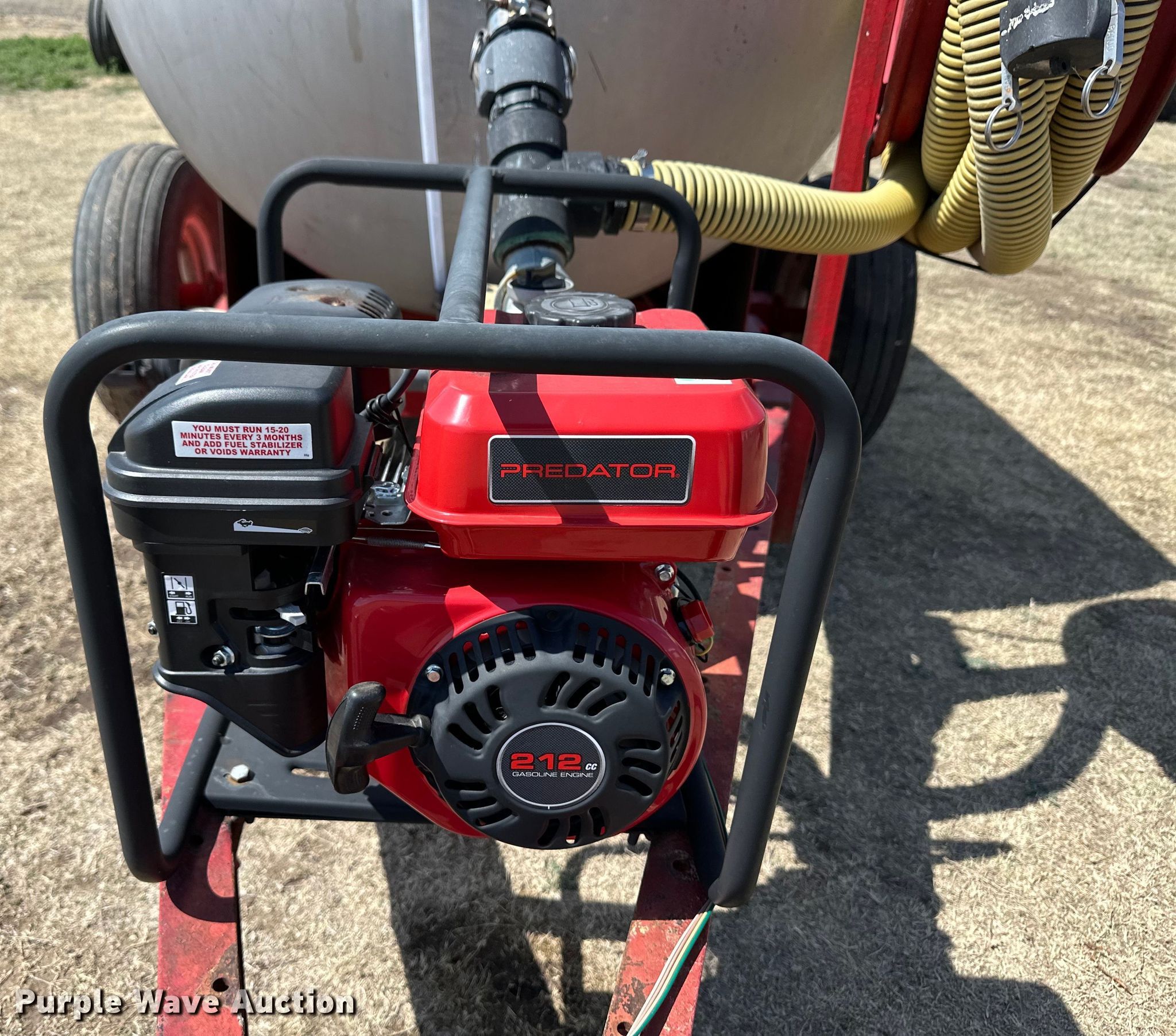 Shop built tank trailer. Dimensions. Overall: 15' L x 78" W. Features Tank type: Stainless steel Capacity: 820 gallons, Pump Predator, Outlet size: 2". Chassis Ball hitch: 2 5/16", Landing gear: Single, Suspension: Spring, Axles: Tandem. Tires Steel wheels, Size: 9.5L-14. Transfer of ownership documentation will be a bill of sale. 1915 Road 140. Lakin, KS 67860