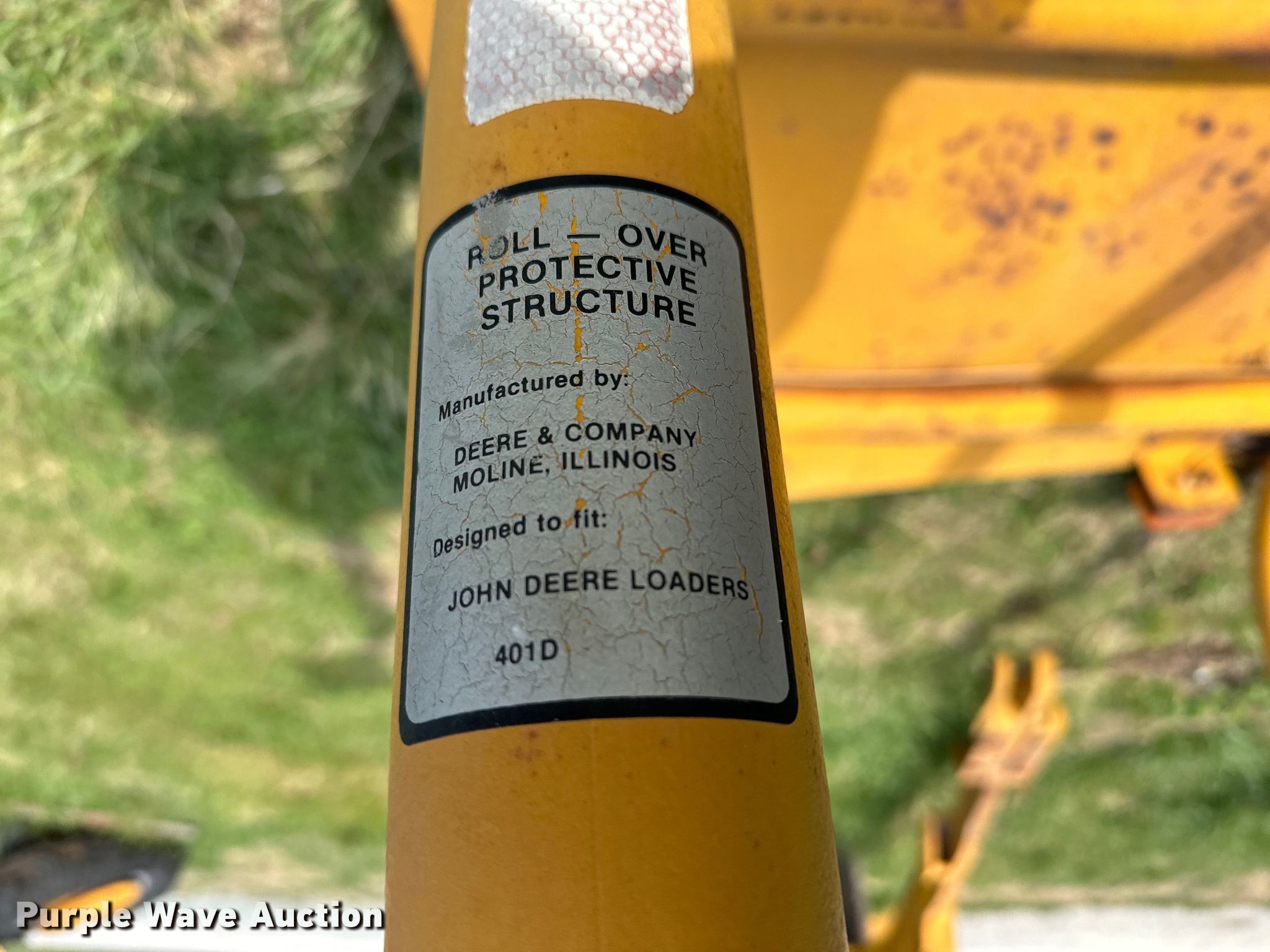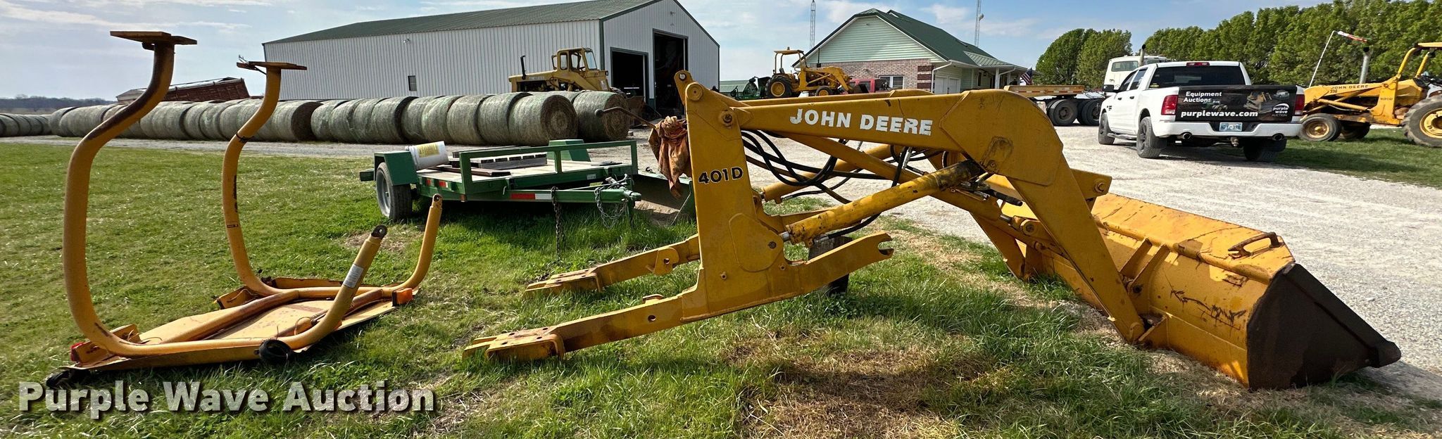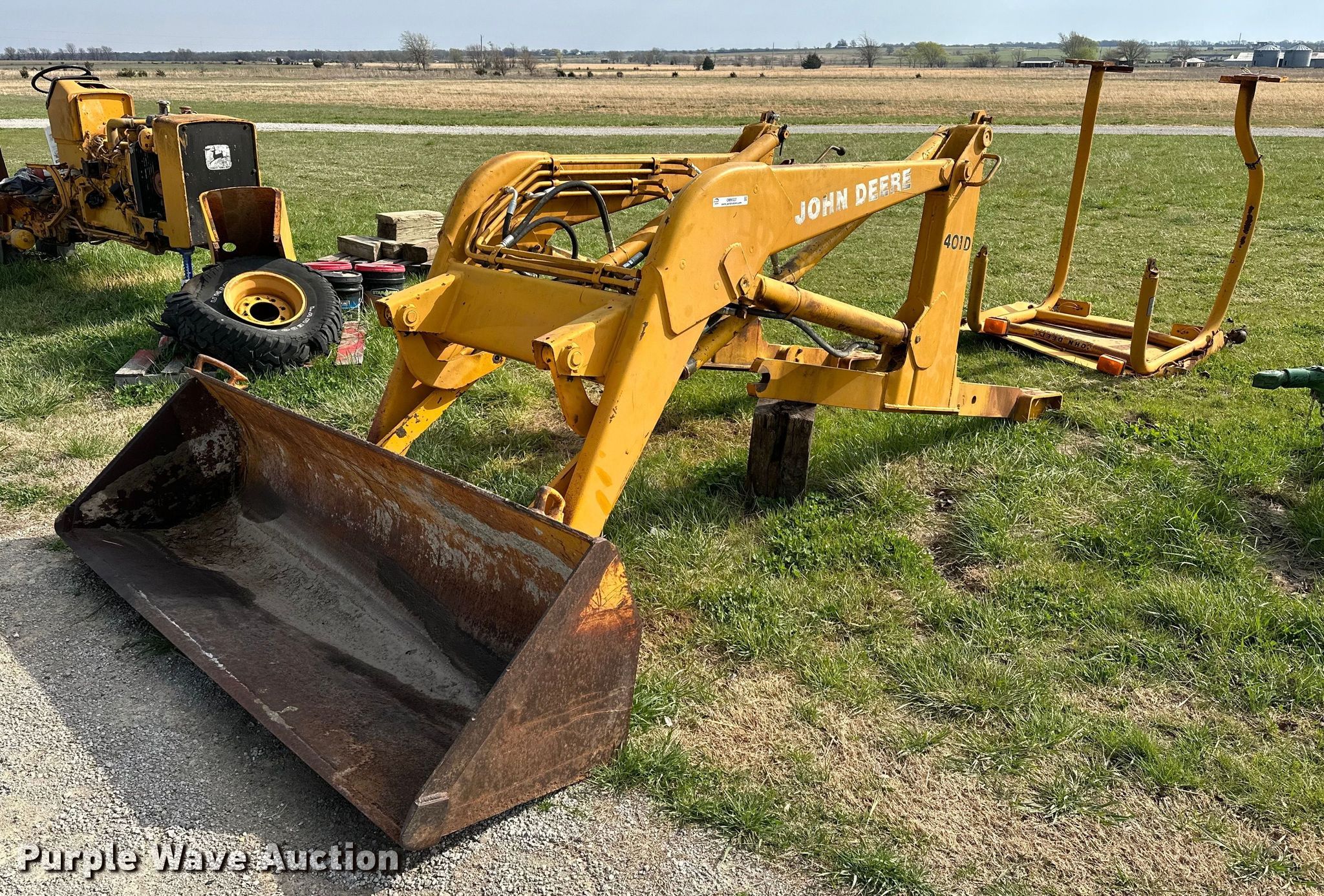 John Deere 401D loader. Features. Self-leveling, Controls: Joystick, Bucket Width: 80", ROPS. Notes Removed from John Deere 300-400 series tractors. Davis Farms 5 Ag Resources. Nowata, OK 74048