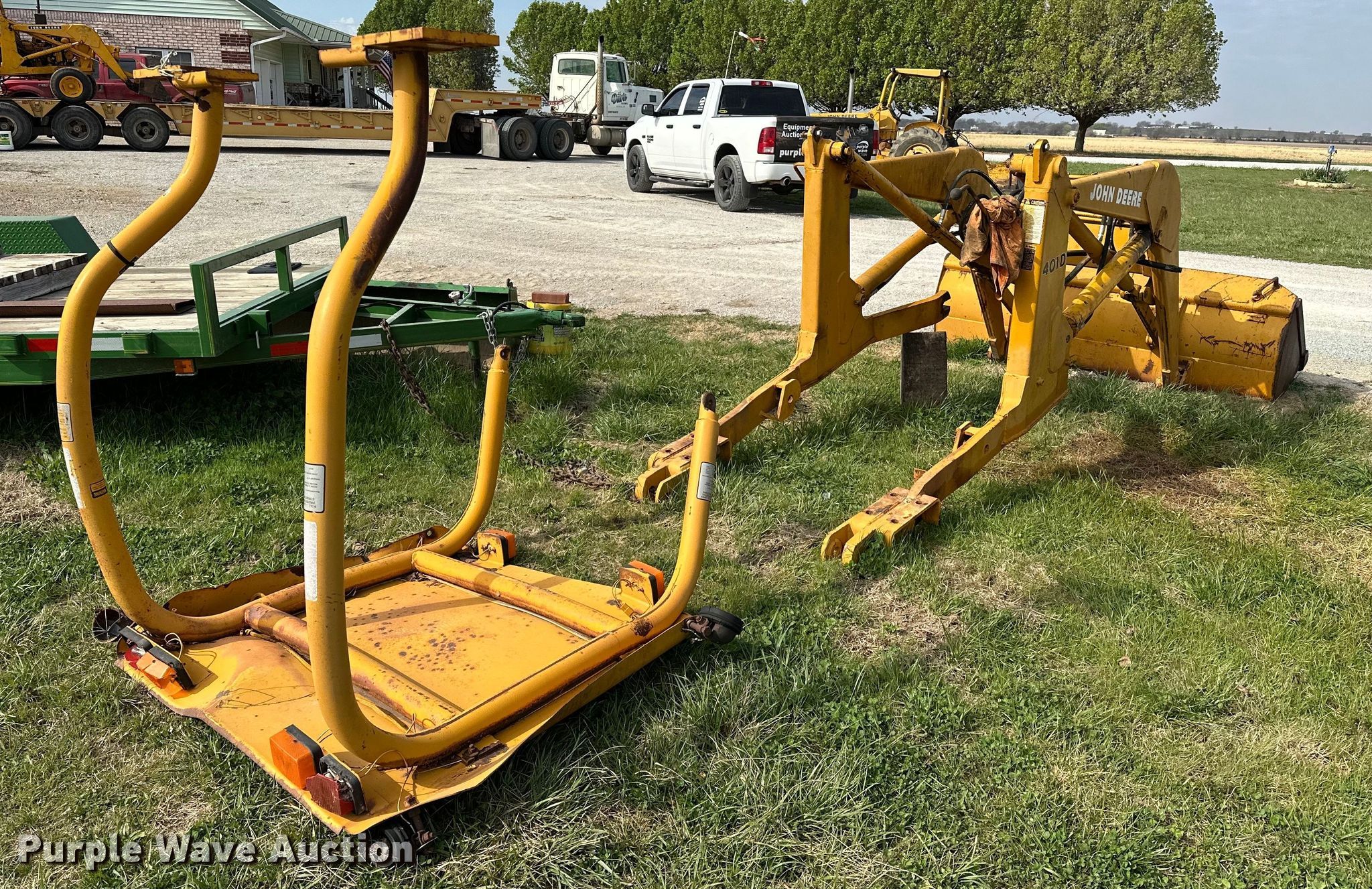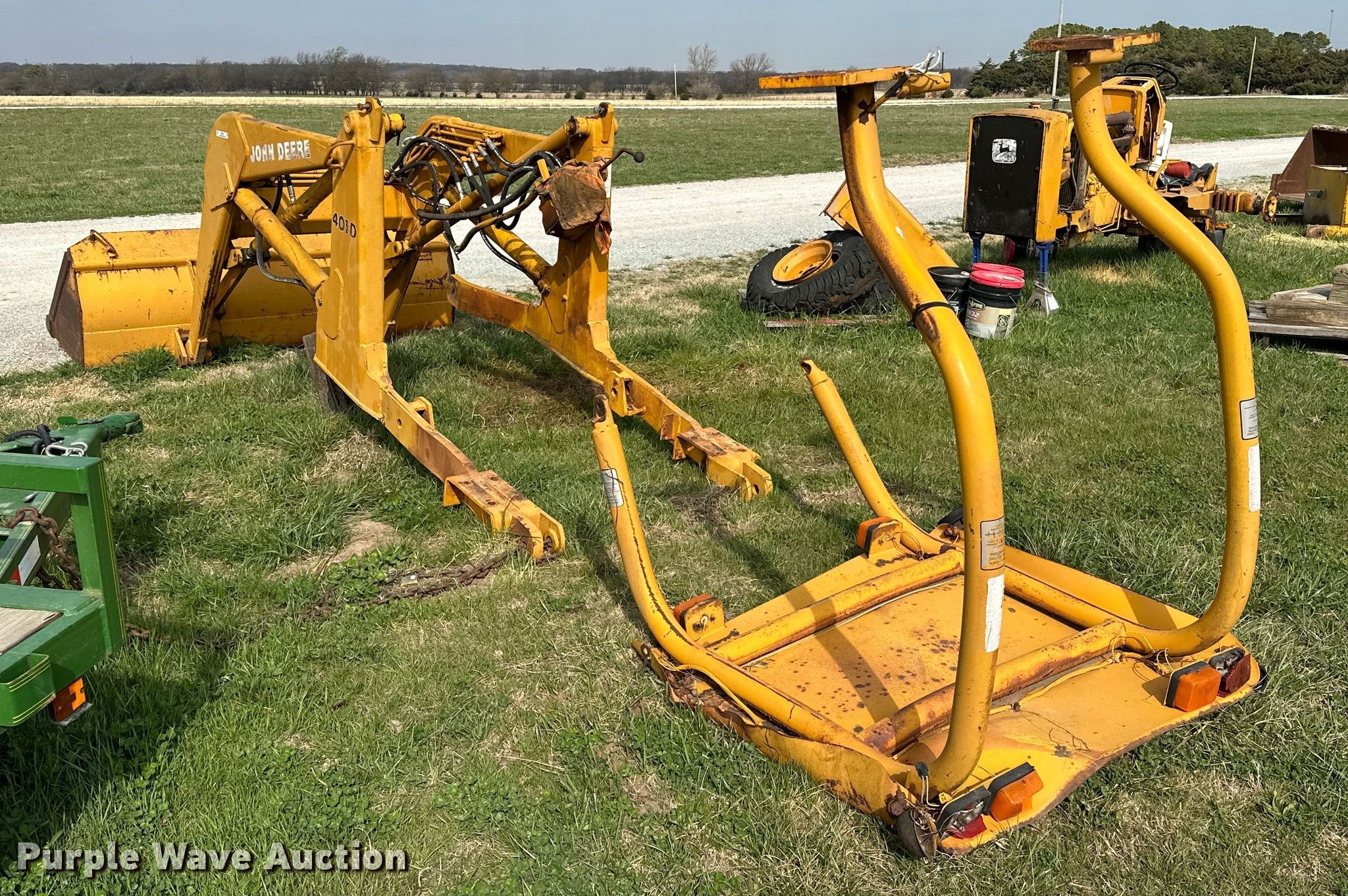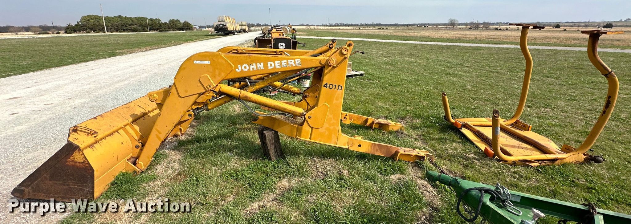 Purple Wave is selling a used Ag Tractor Loader or Attach. in Oklahoma. This item is a John Deere 401D loader with the following: Self-leveling, Controls: Joystick, Bucket, Width: 80", ROPS