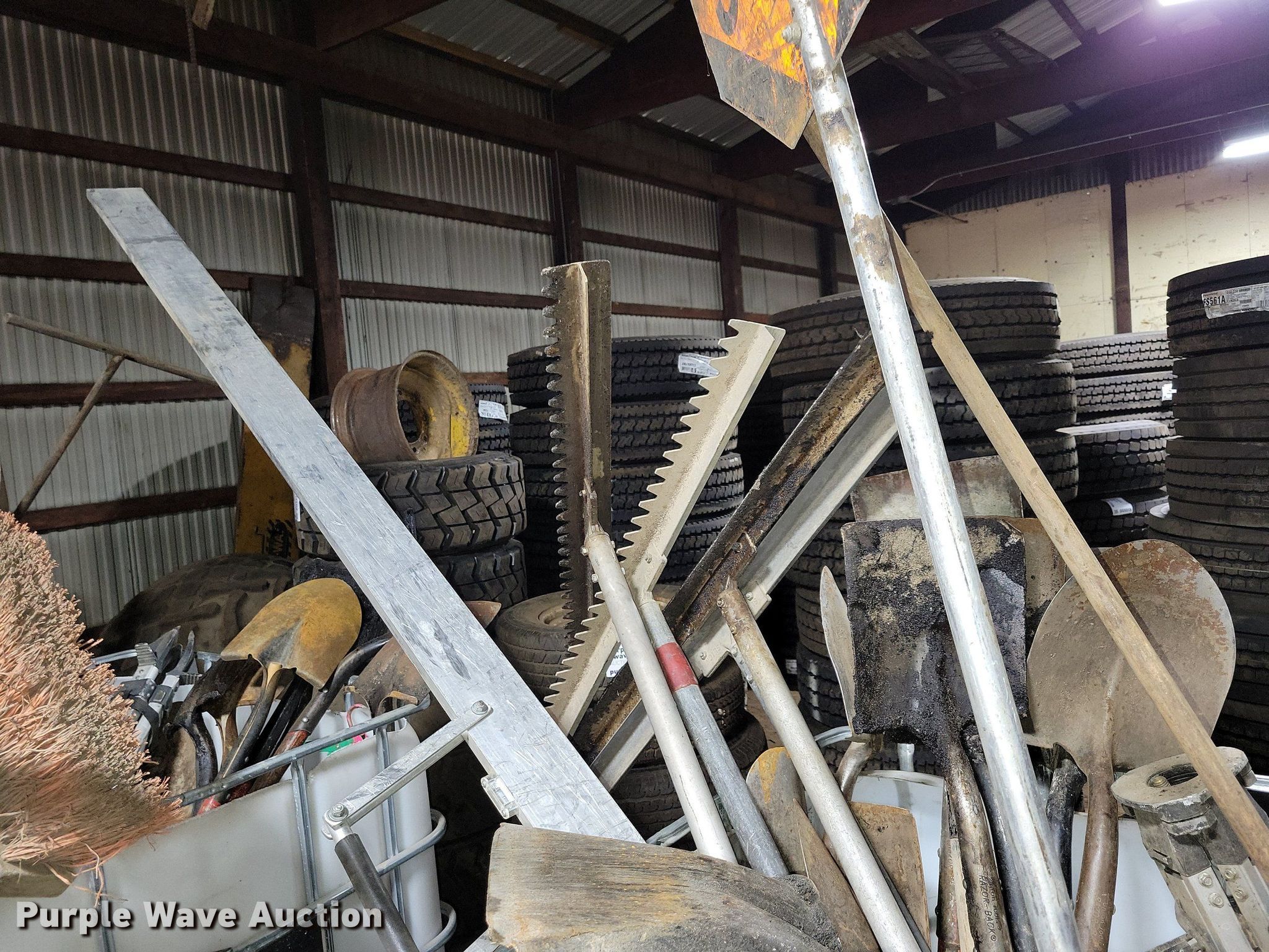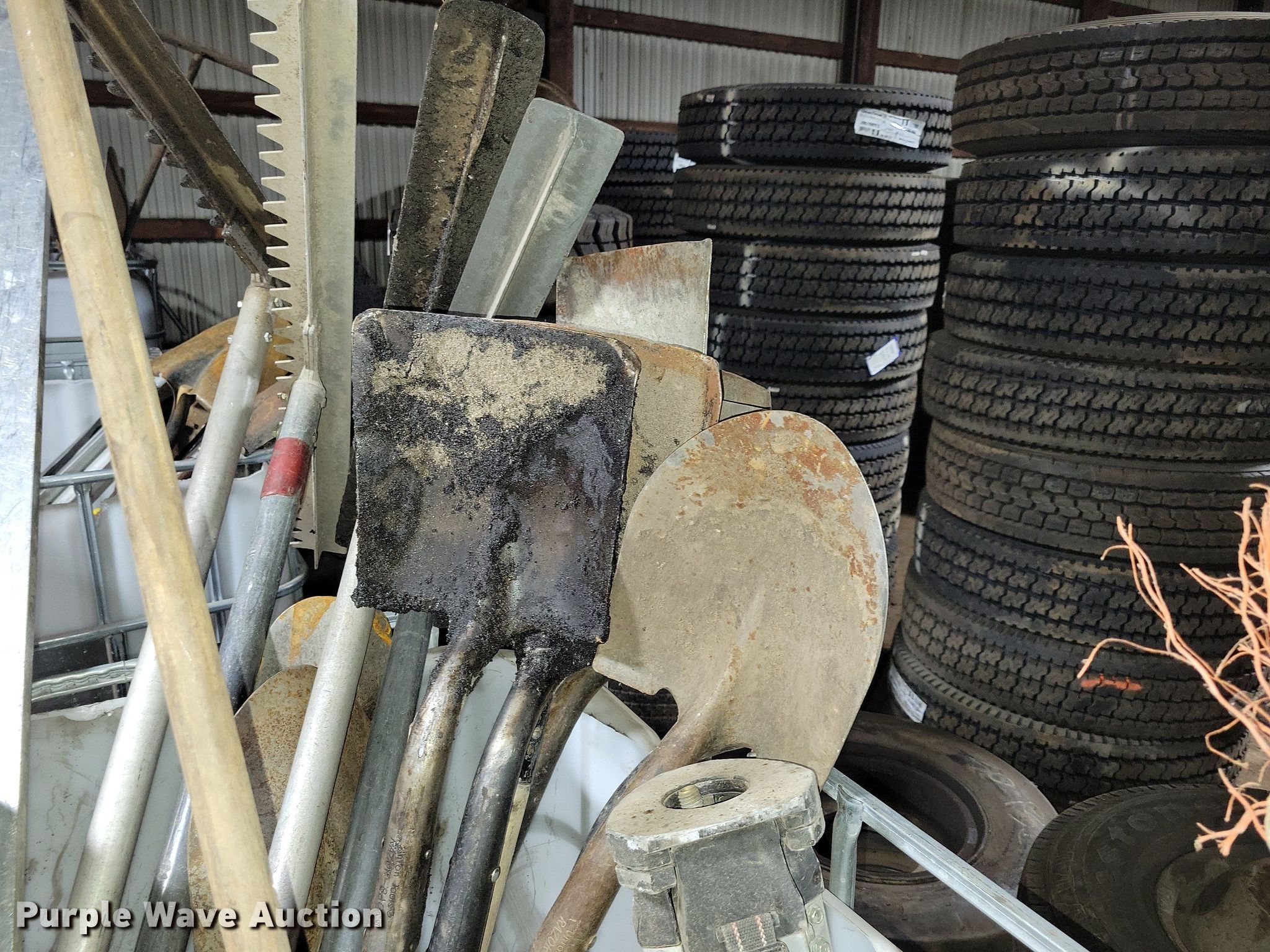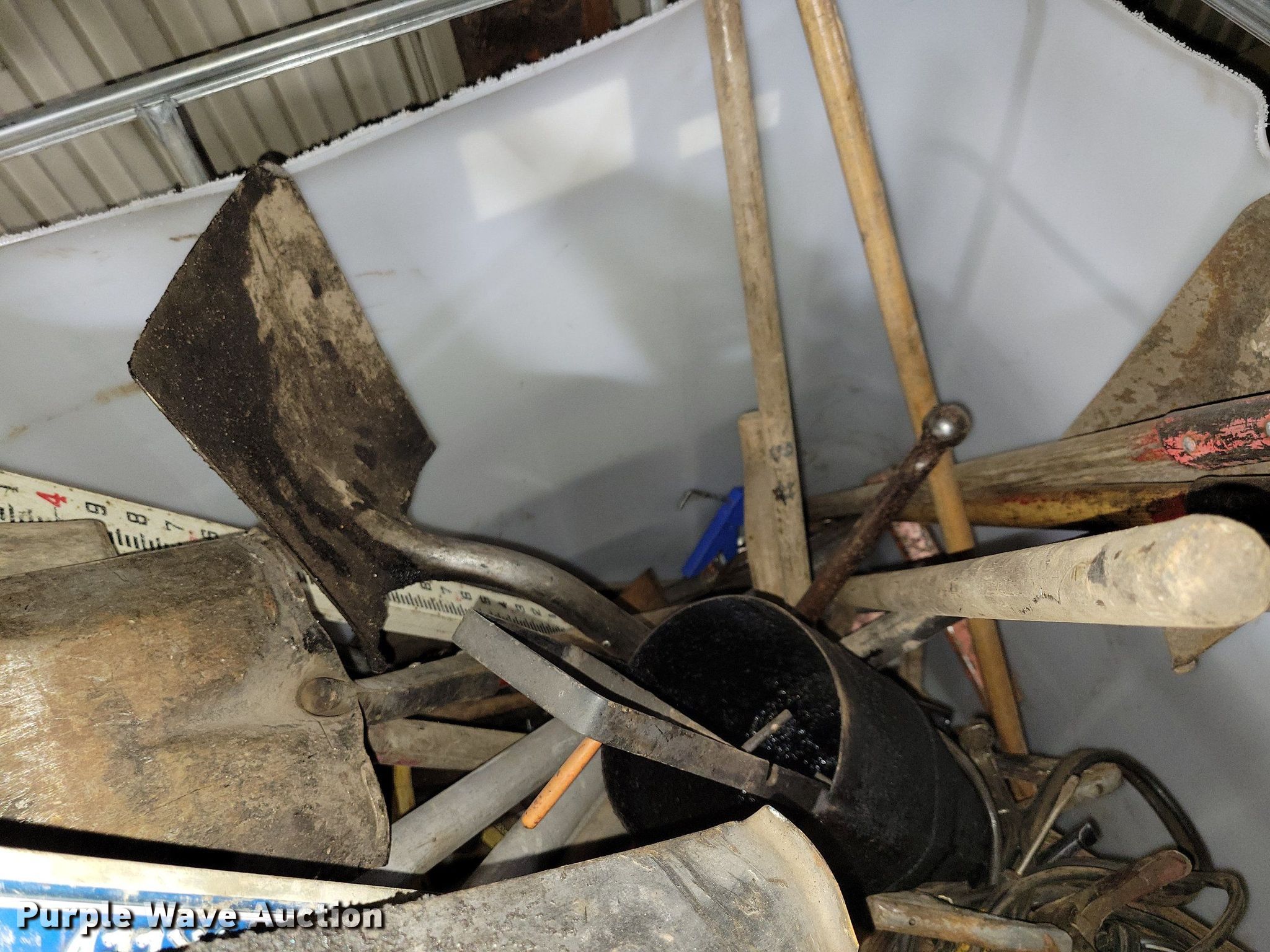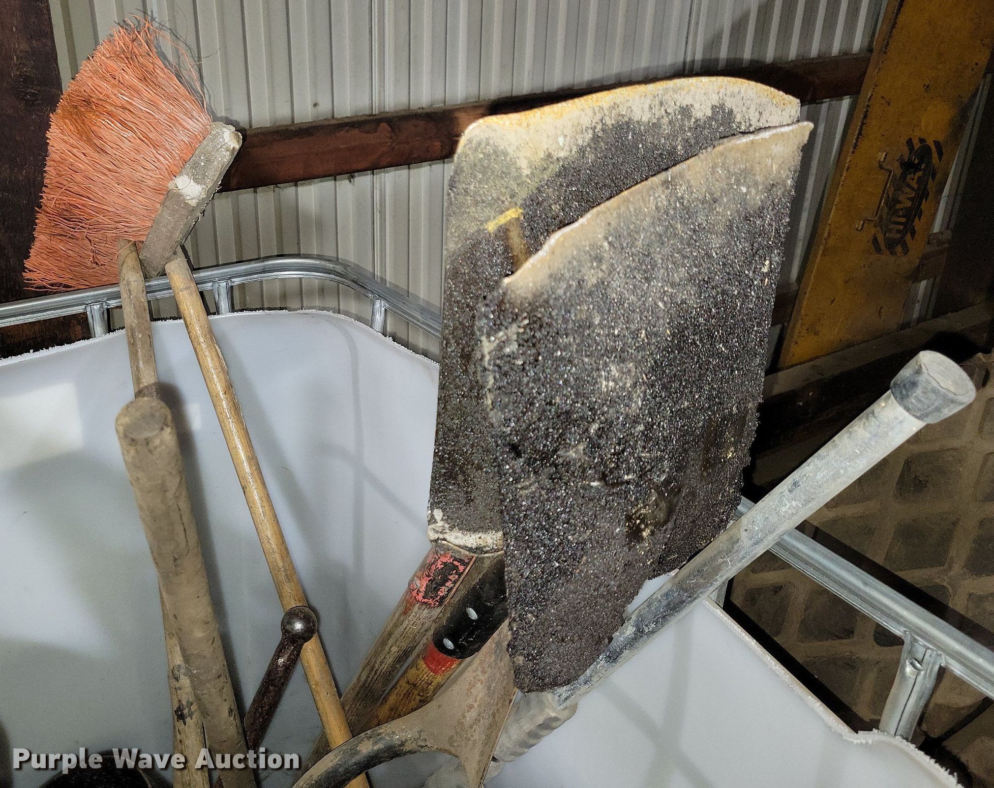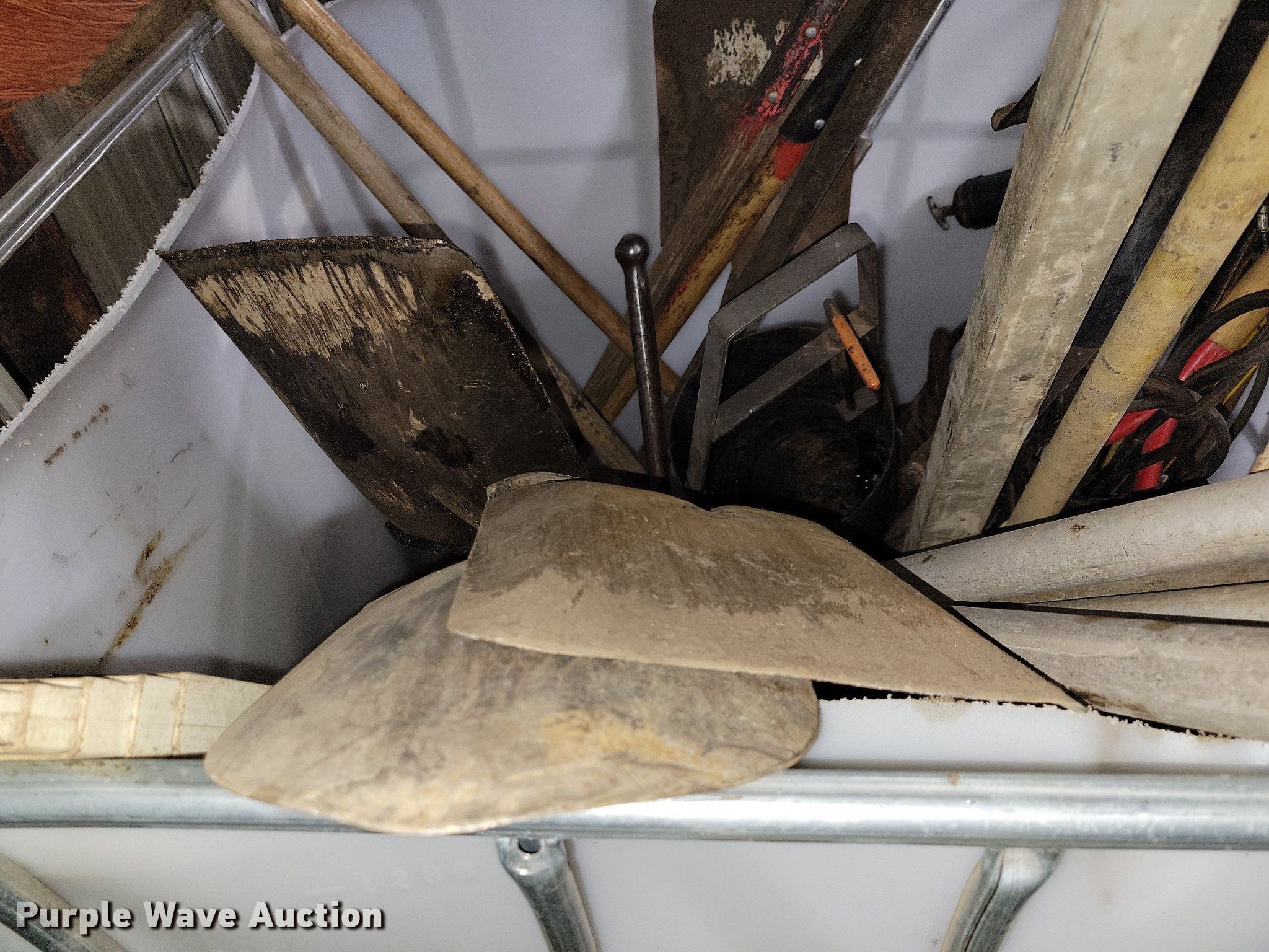 Purple Wave is selling a used Tools in Minnesota. This item is a (2) bins of tools with the following: Shovels, Brooms, Stop signs, Screed, Levels, Rakes, Gas cans