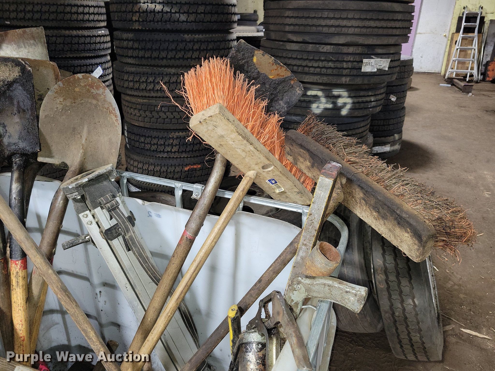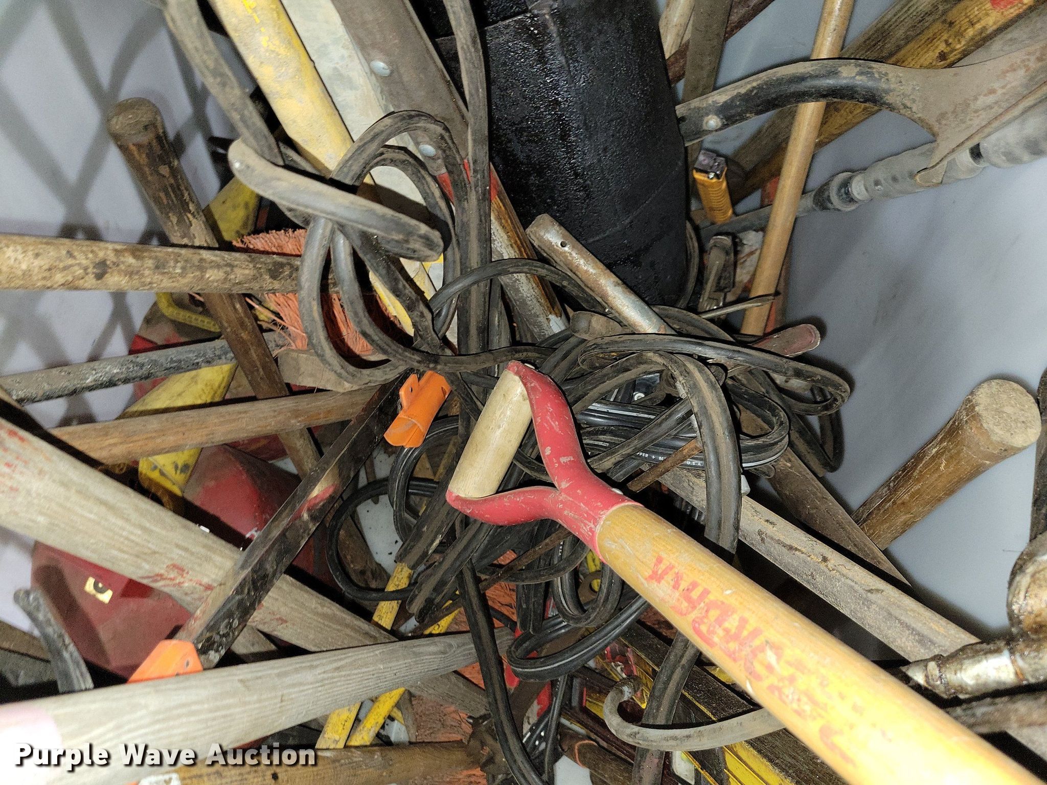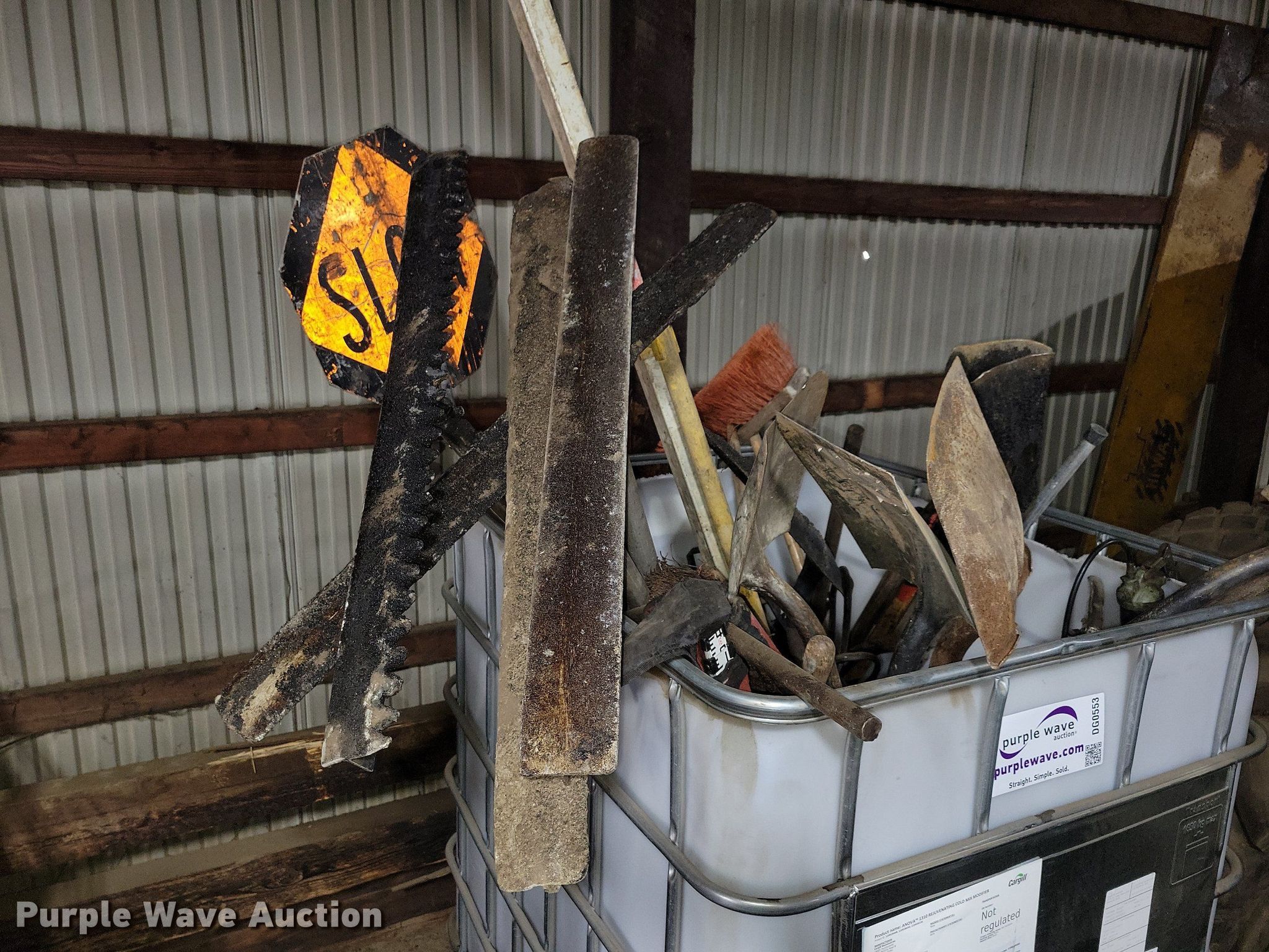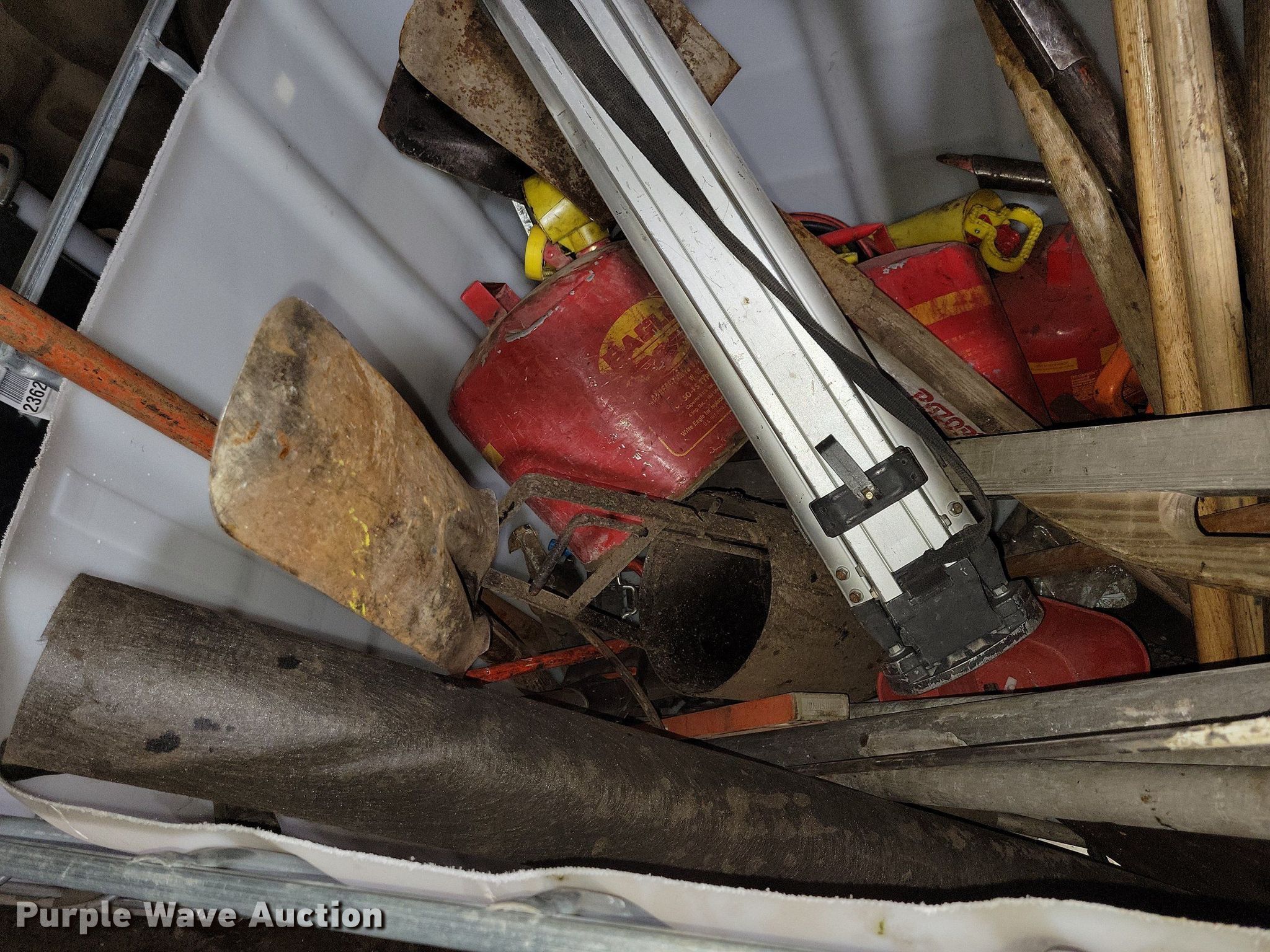 Purple Wave is selling a used Tools in Minnesota. This item is a (2) bins of tools with the following: Shovels, Brooms, Stop signs, Screed, Levels, Rakes, Gas cans