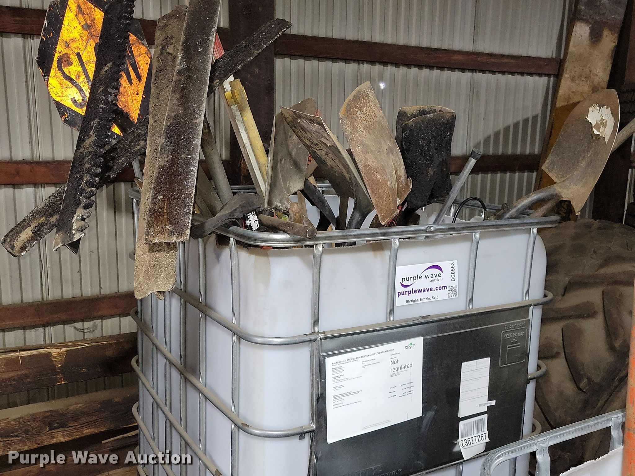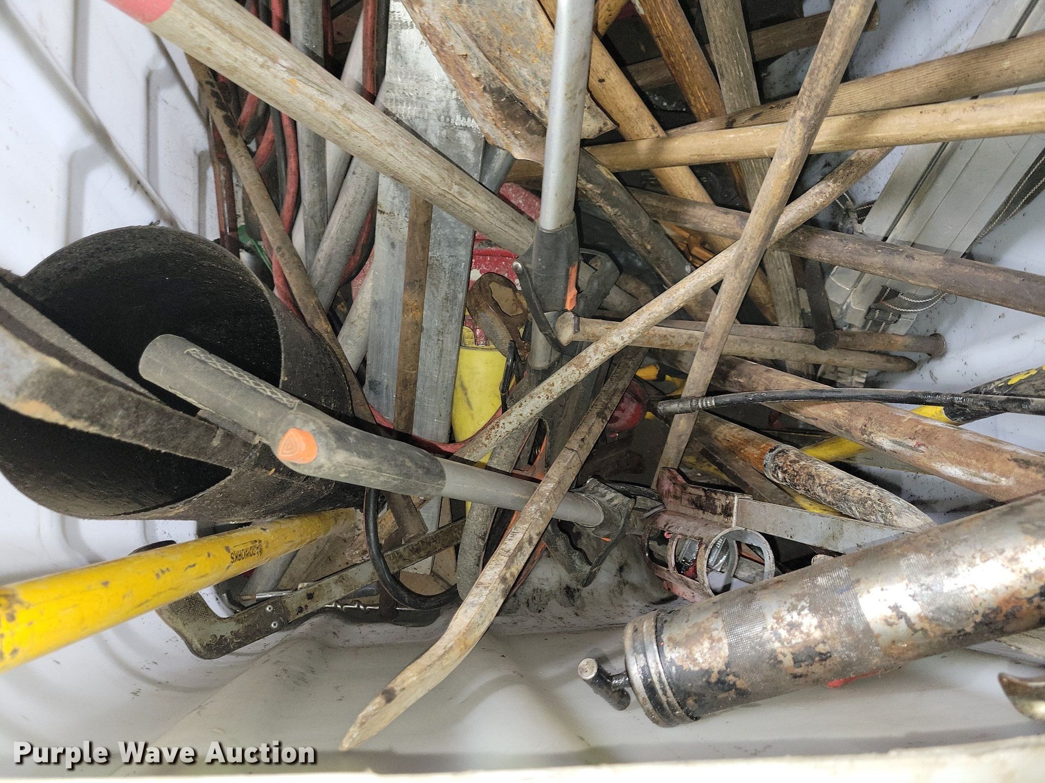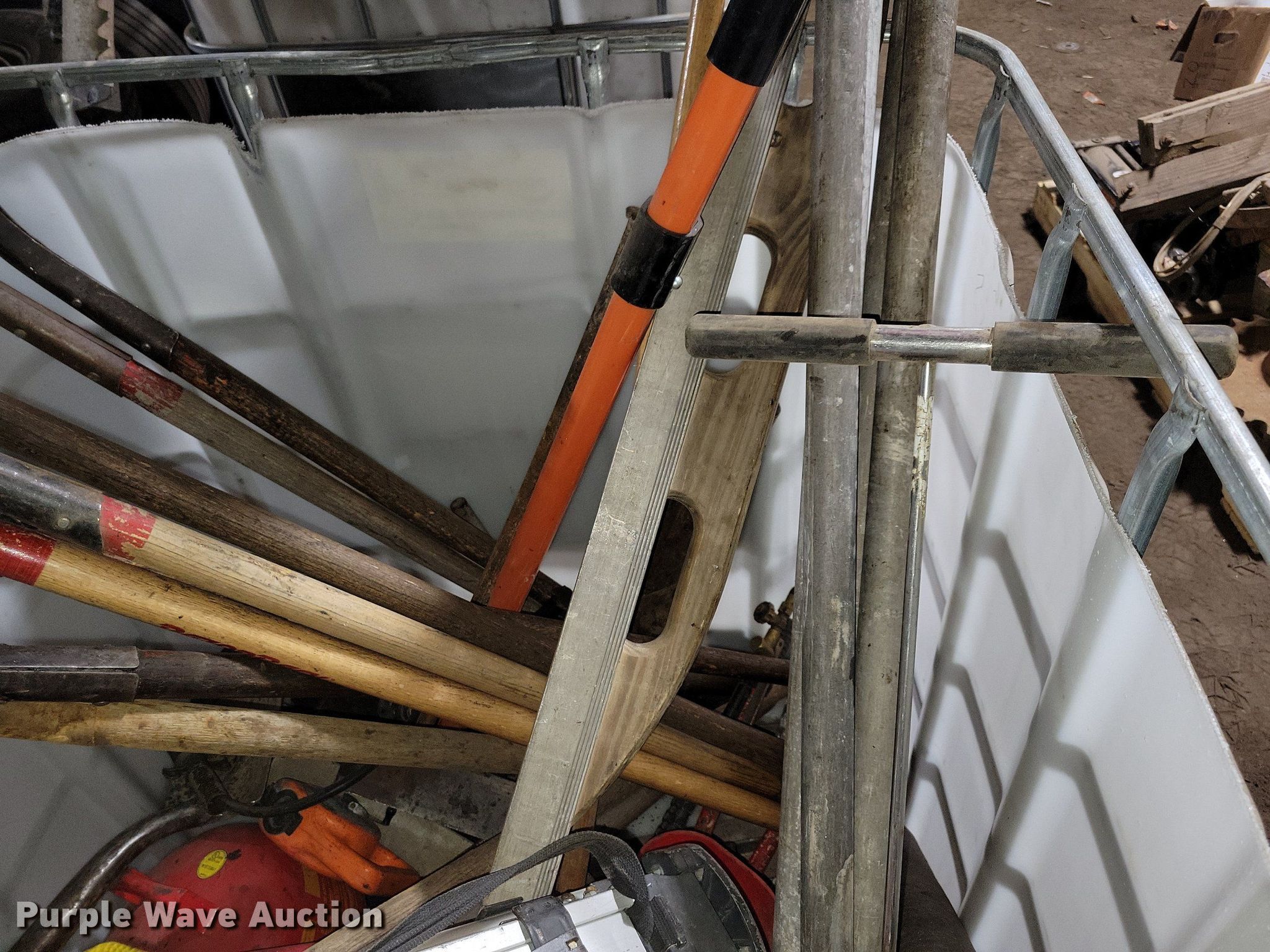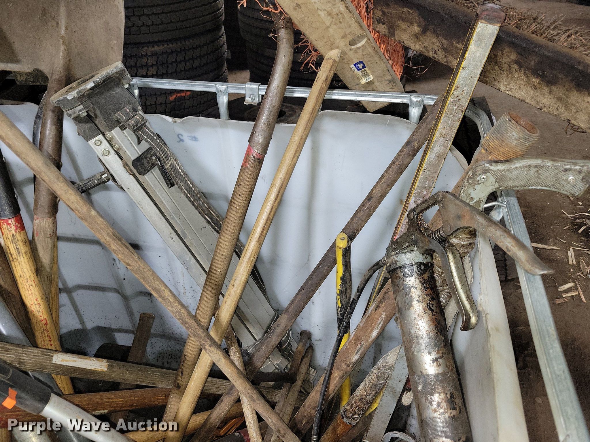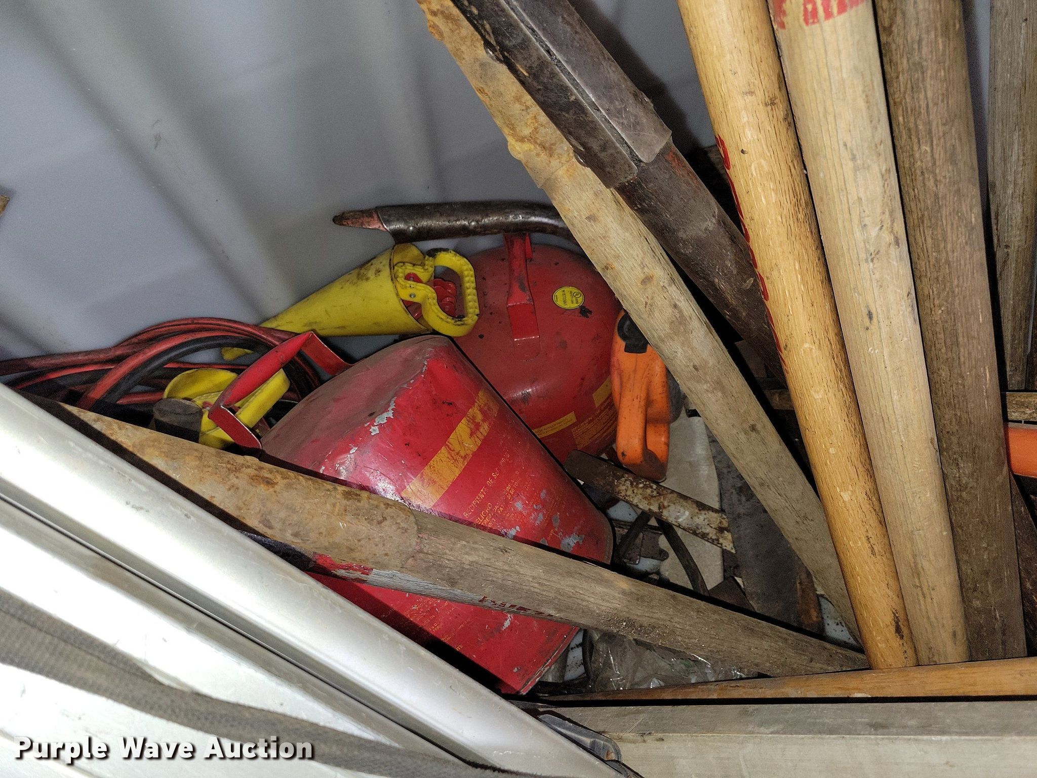 Purple Wave is selling a used Tools in Minnesota. This item is a (2) bins of tools with the following: Shovels, Brooms, Stop signs, Screed, Levels, Rakes, Gas cans