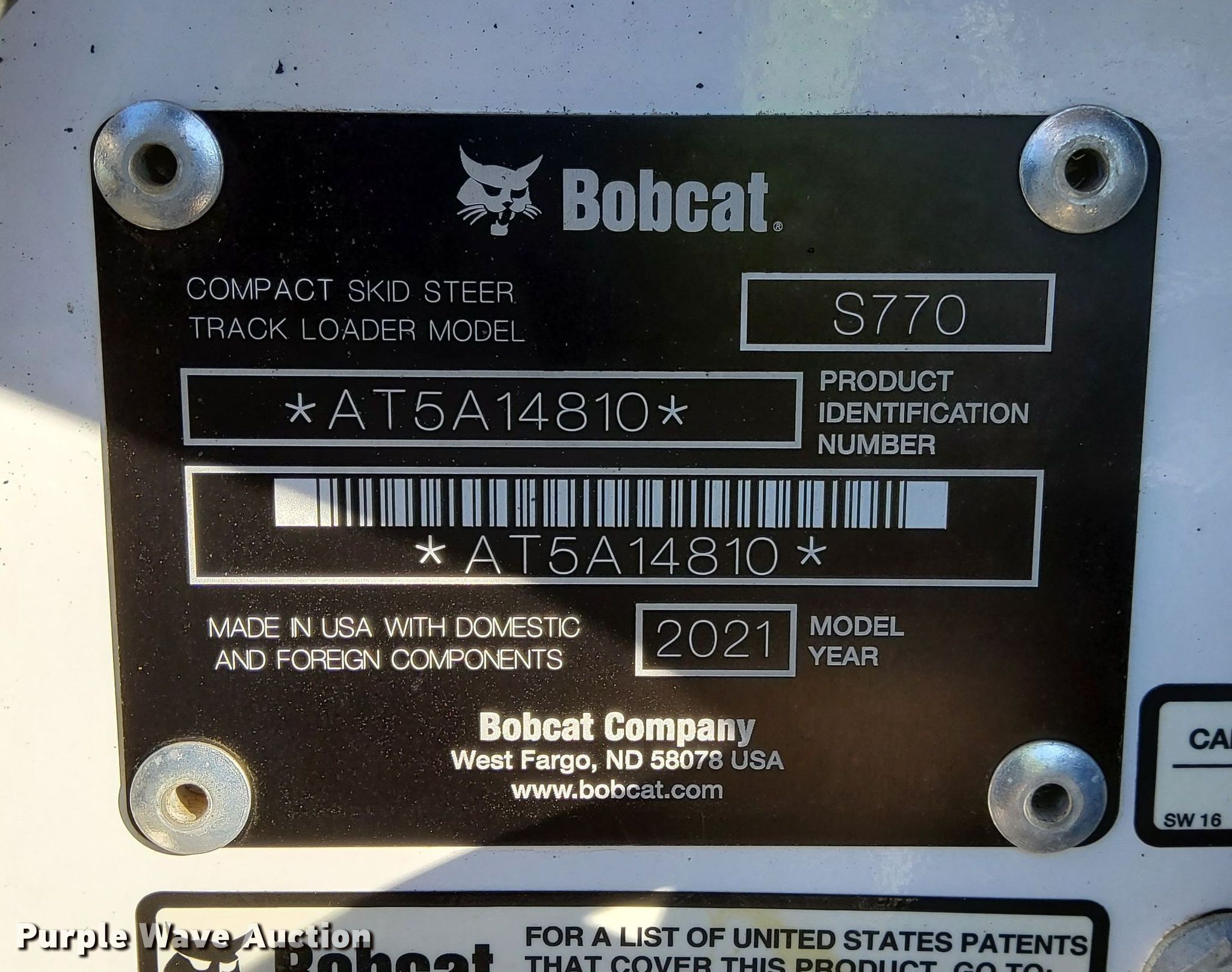 Purple Wave is selling a used Skid Steer Loader in Minnesota. This item is a 2021 Bobcat S770 skid steer loader with the following: Hours: 1,567 on meter, Serial: AT5A14810, Unit #: SS21B