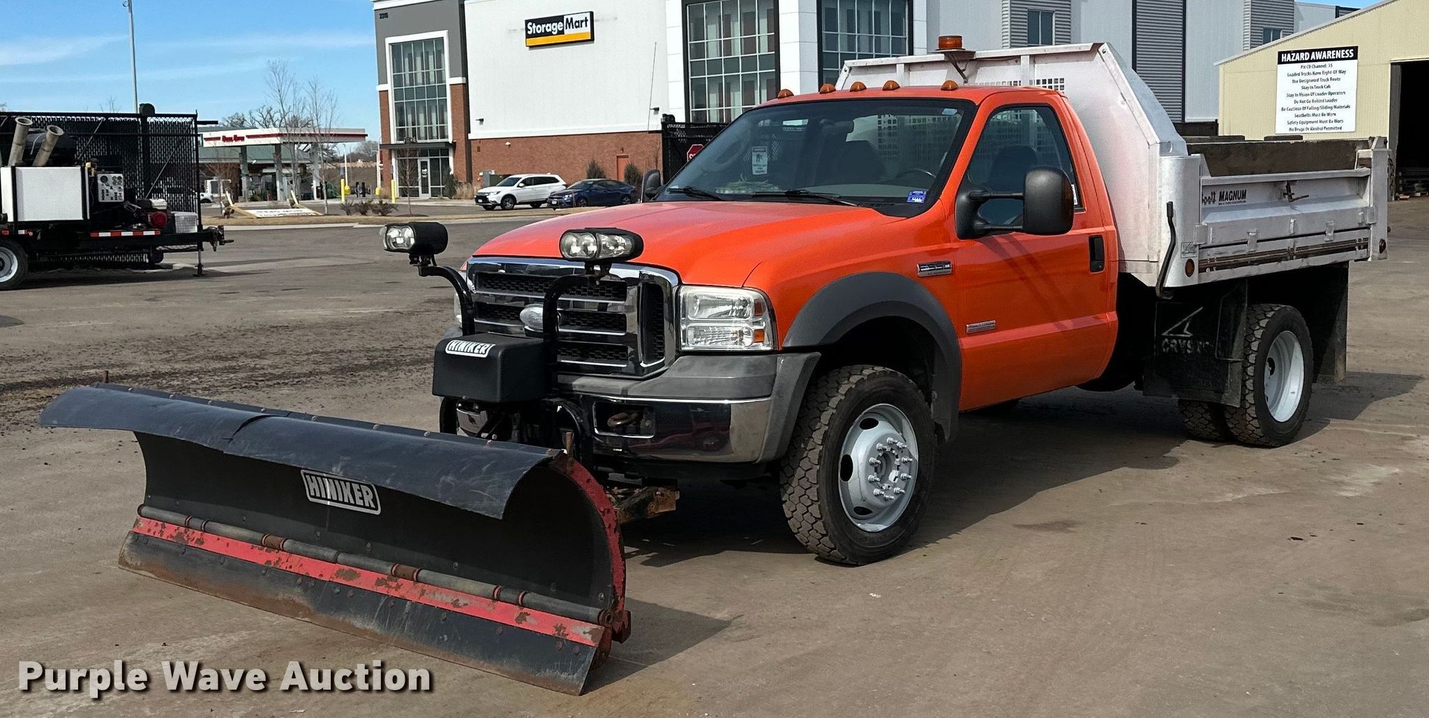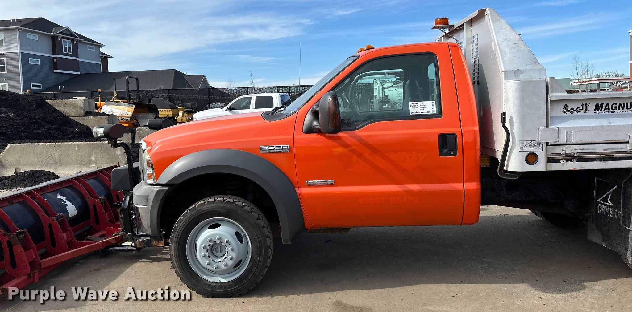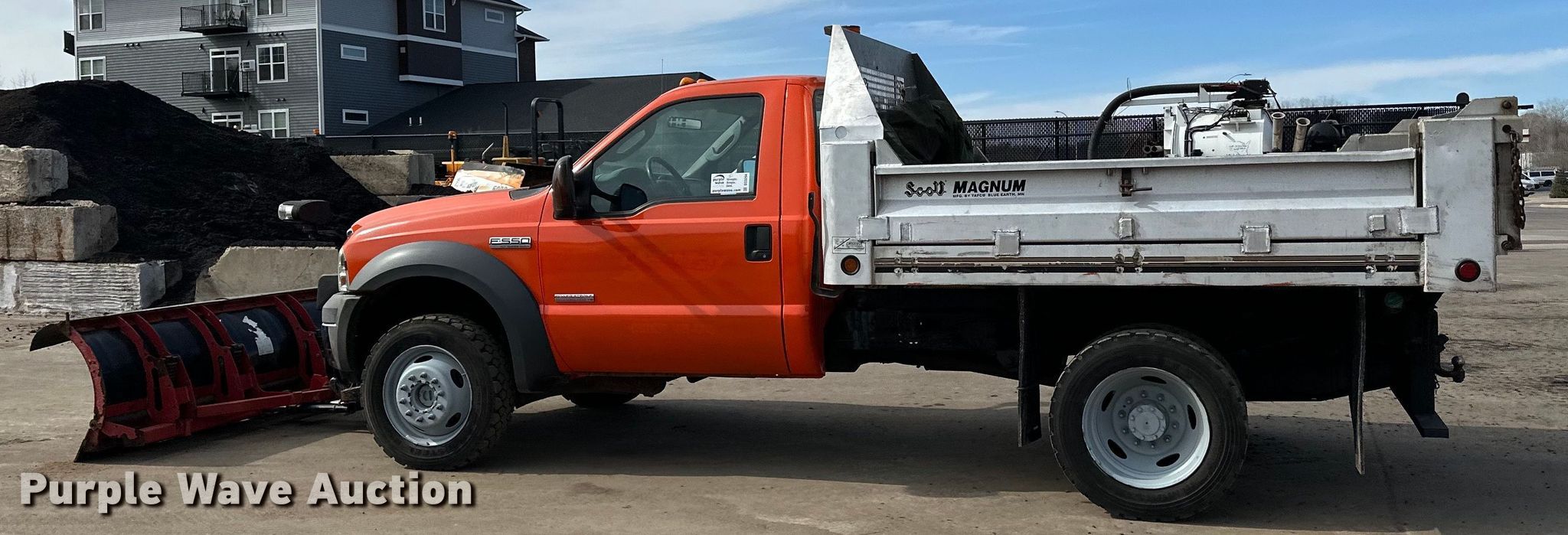 2005 Ford F550 dump truck. Miles: 142,202 on odometer, VIN: 1FDAF57P05EC08484. Engine Displacement: 6.0L V8 OHV, Cylinders: 8, Fuel type: Diesel. Transmission Automatic. Chassis Axles: Single. Interior AC, Heat, Power windows, Cruise control. Features Dump bed Ram: Single, End gate: Manual, Plow Hiniker, Width: 108". Tires Size: 225/70R19.5. Minnesota title. T.A. Schifsky & Sons, Inc - Open Inspection April 6, 10, and 13. 2370 East Hwy 36 North. St. Paul, MN 55109