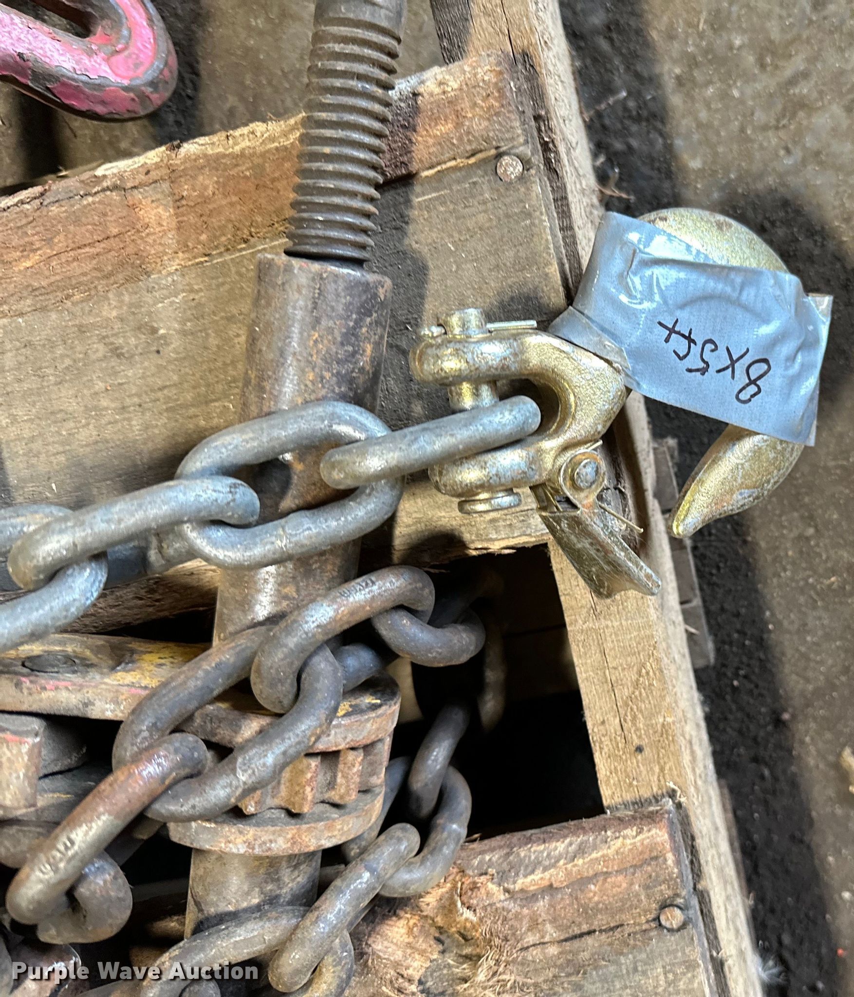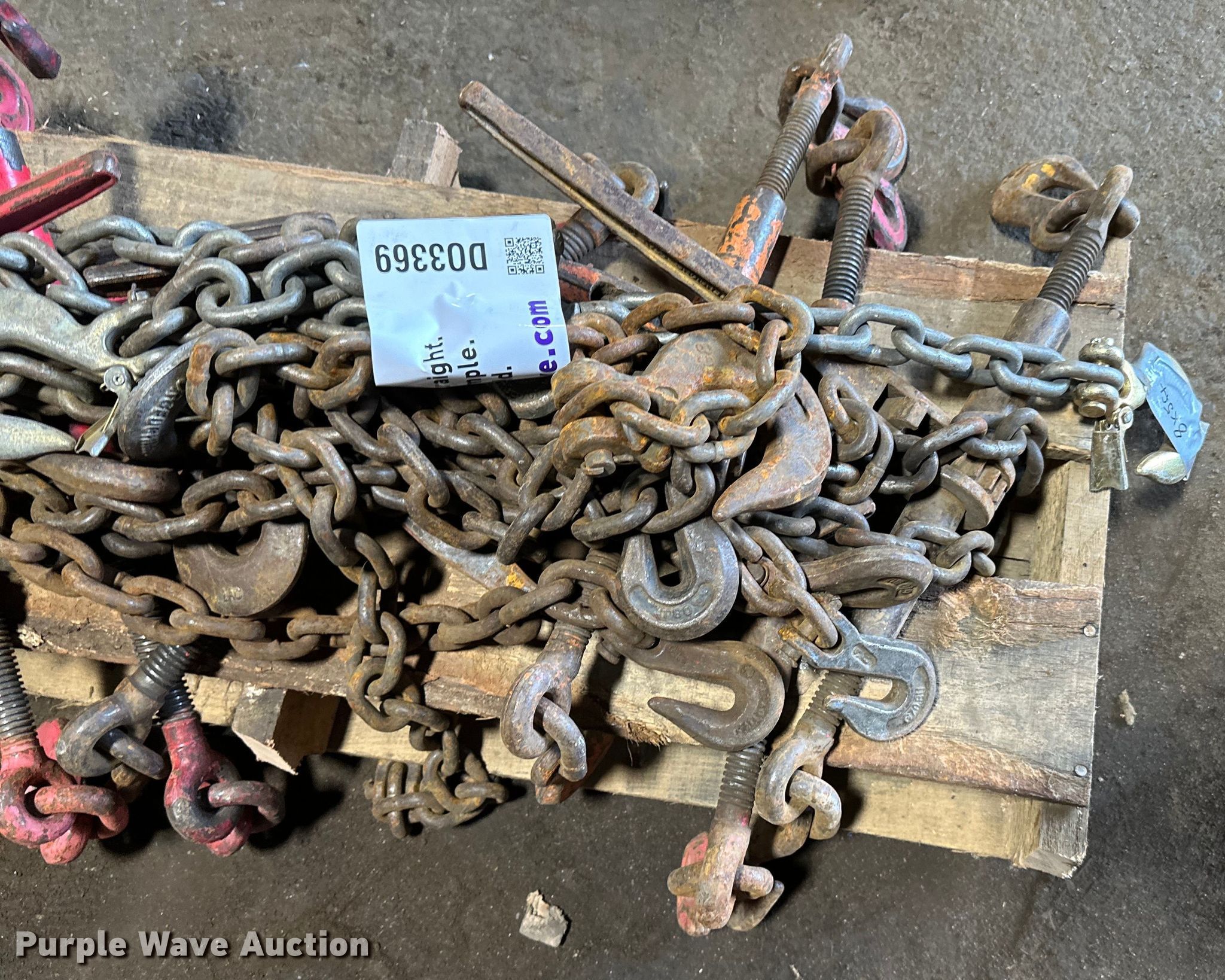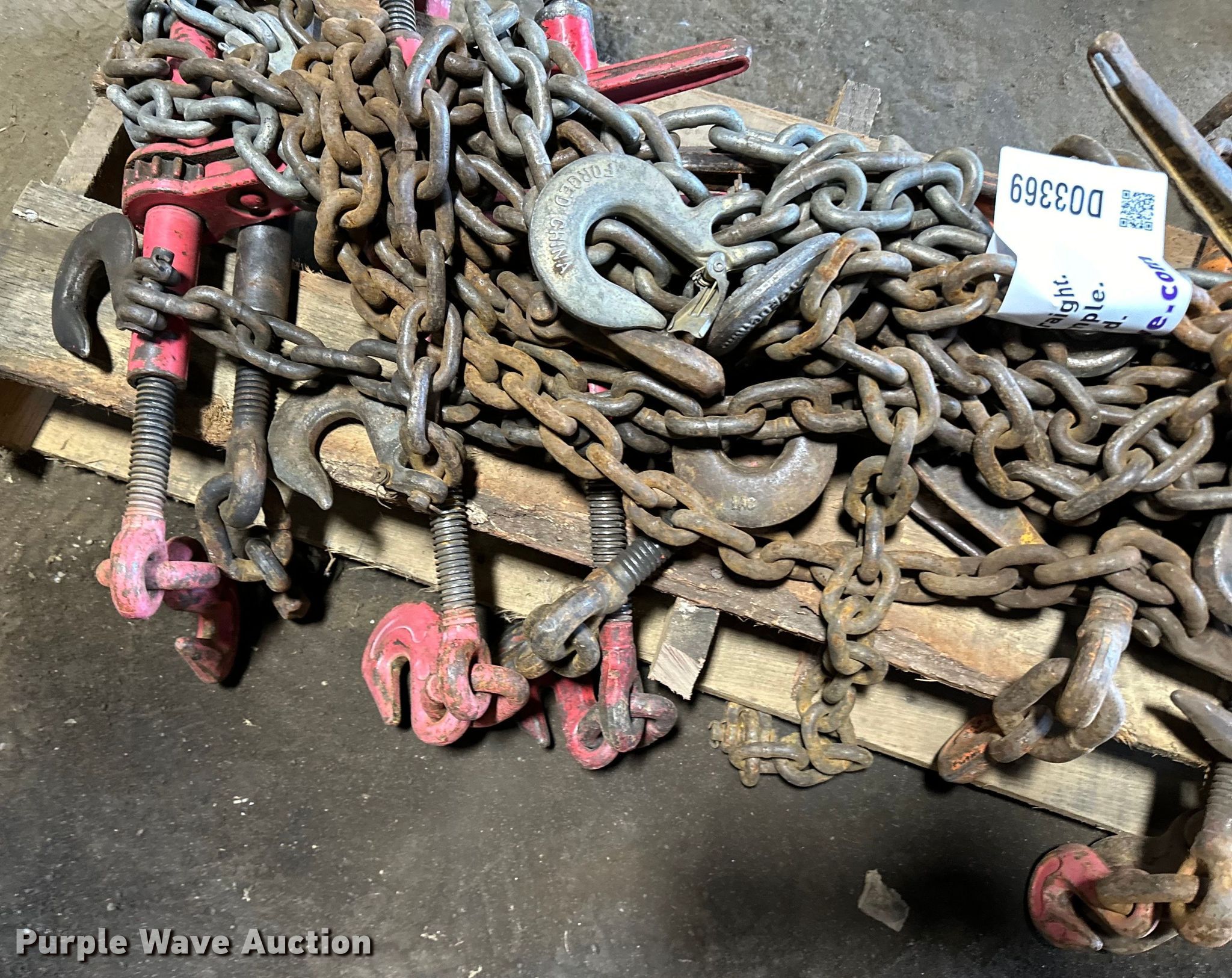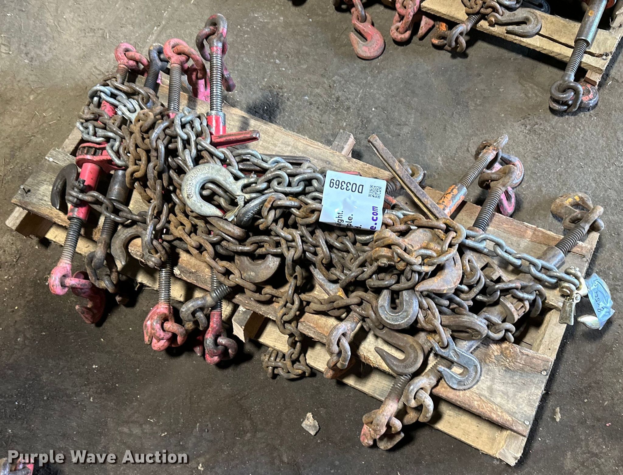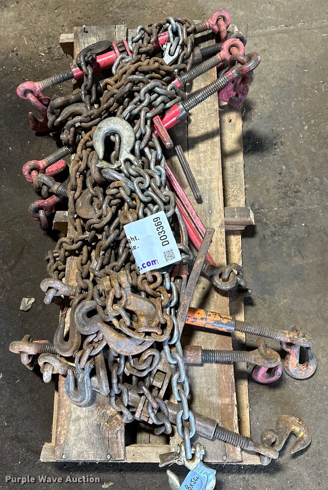 Purple Wave is selling a used Lifting and Rigging in Minnesota. This item is a Lifting and rigging equipment with the following: (8) chains, Approx. 5' x 3/8", (8) binders